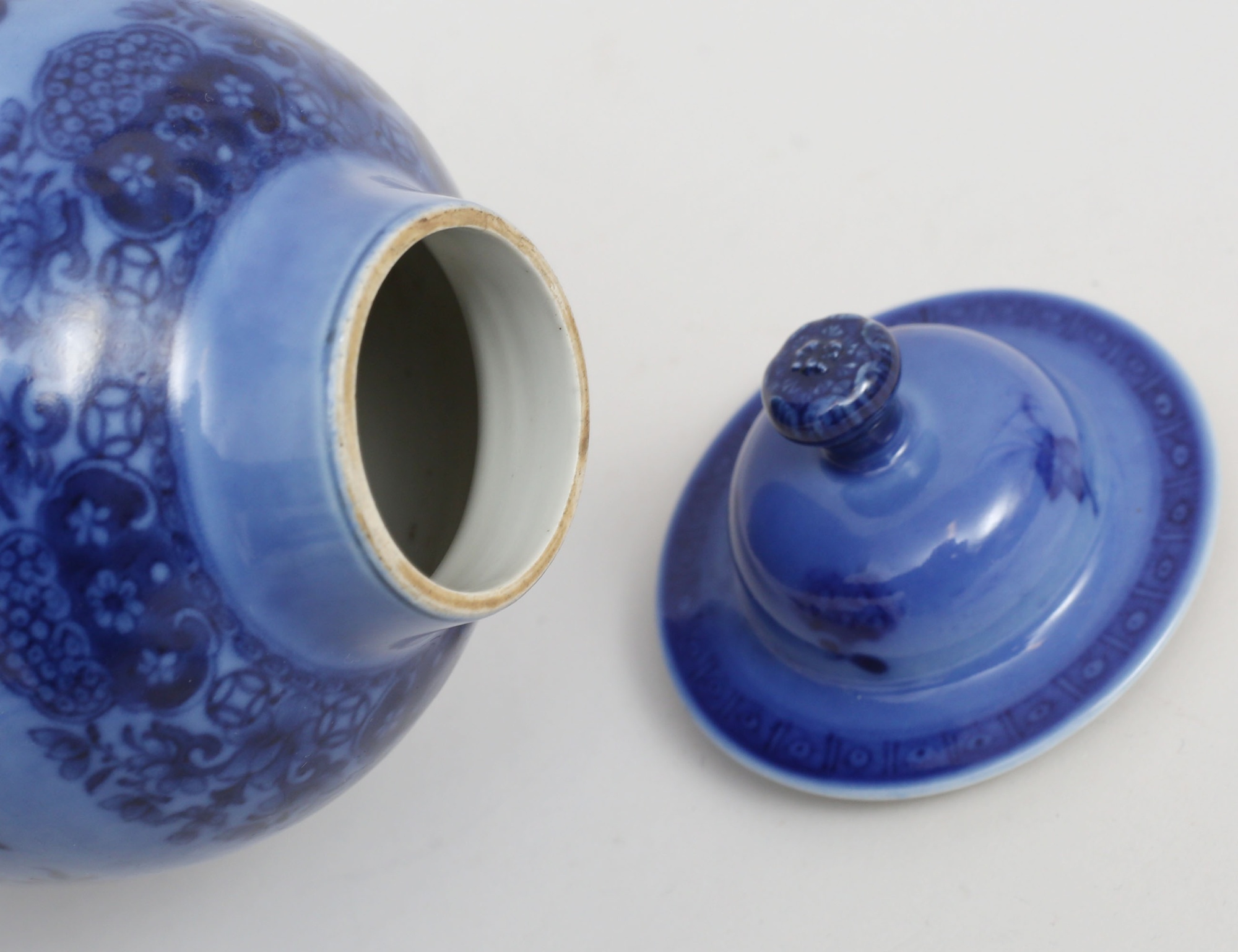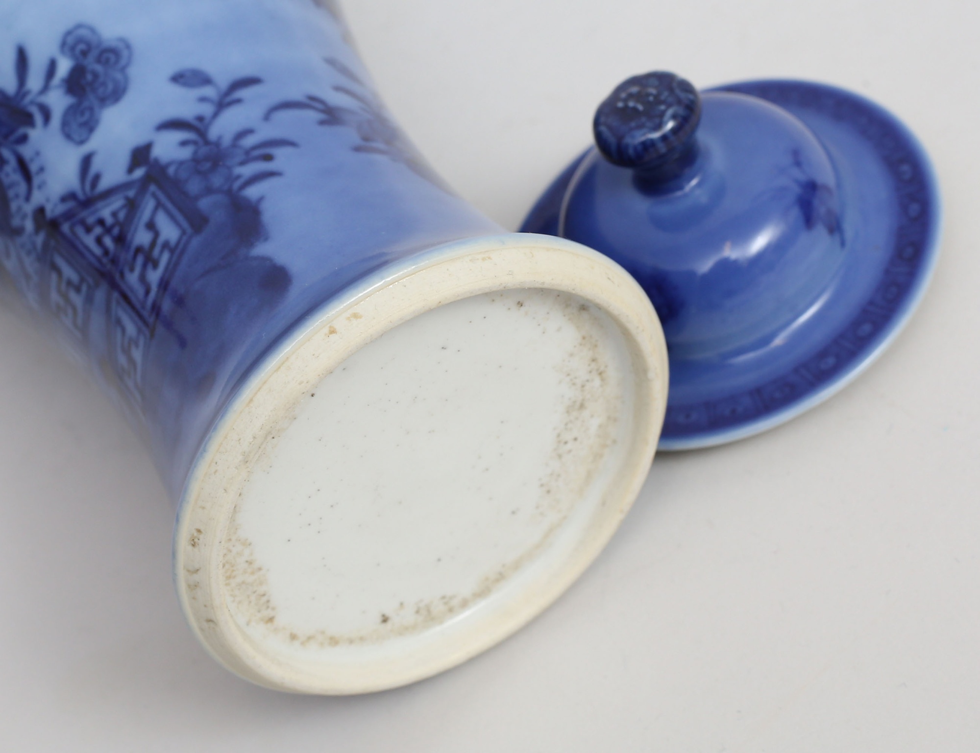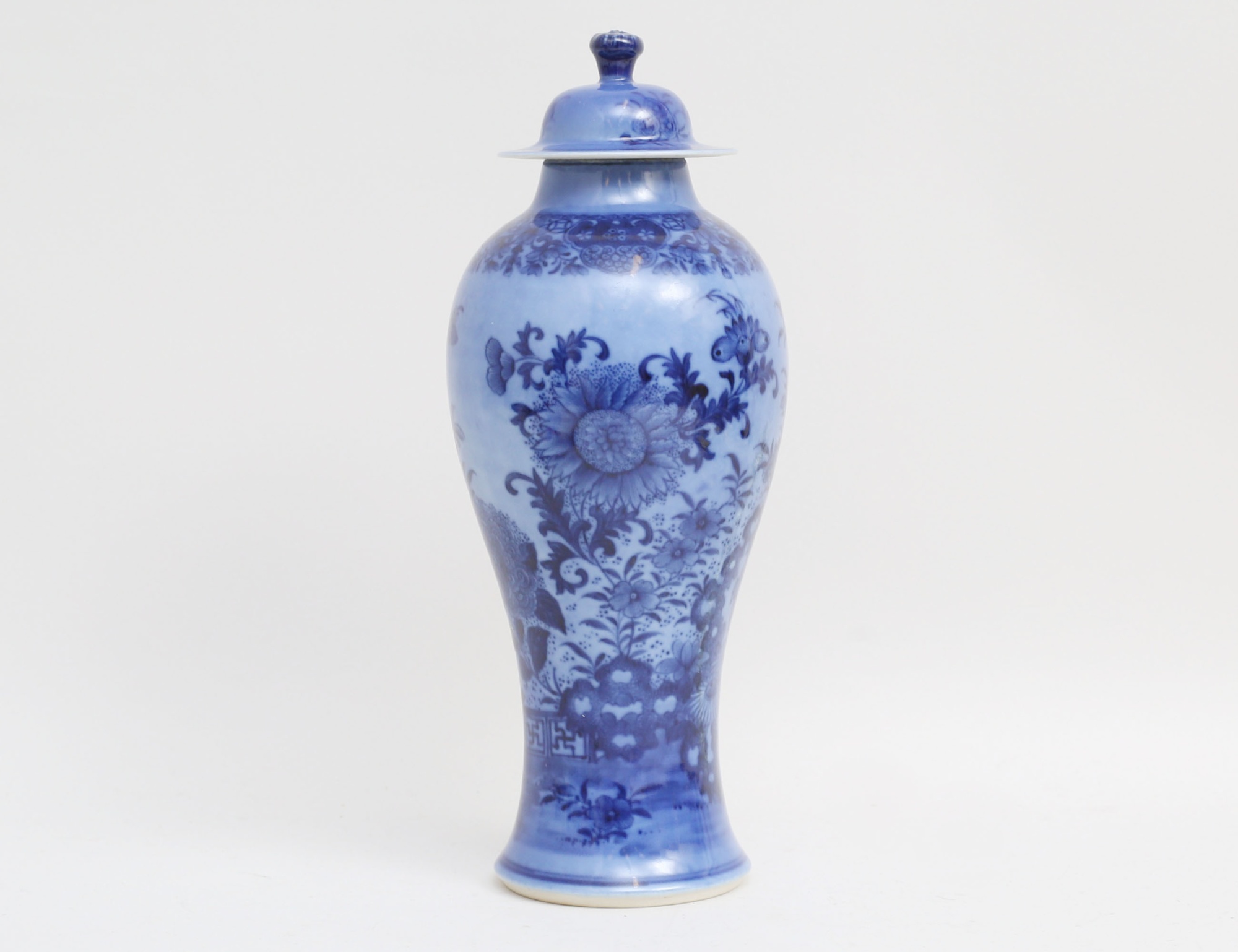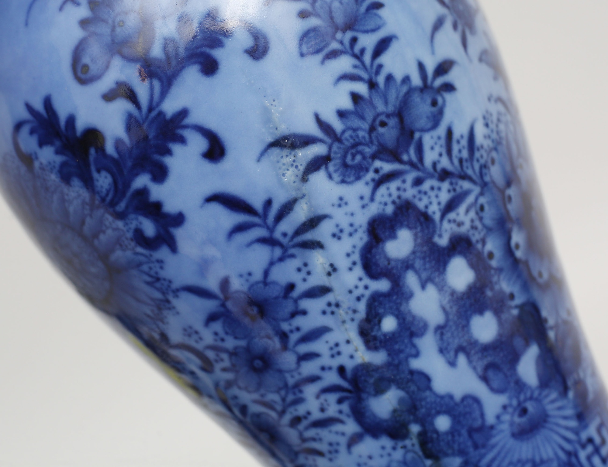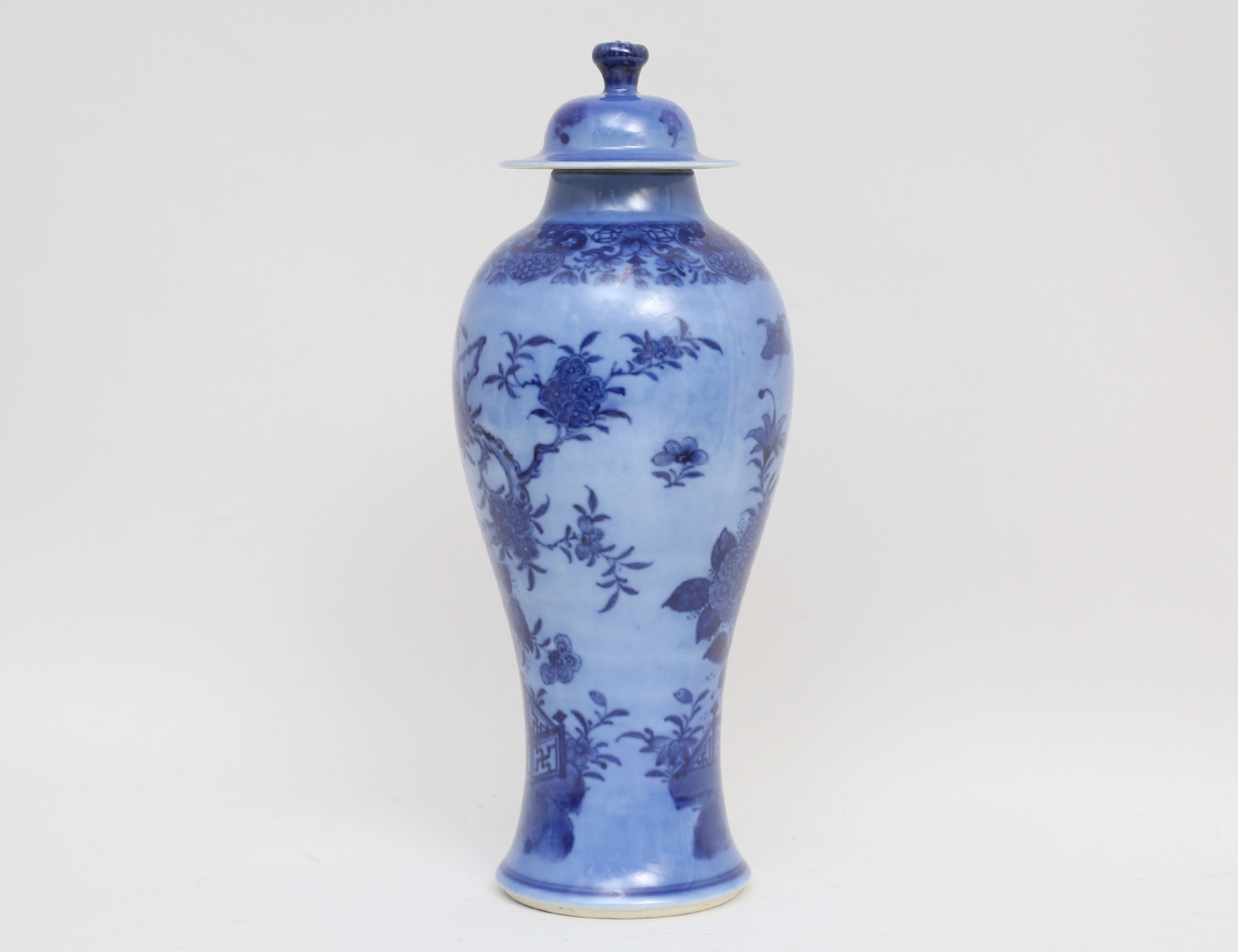 Qingdynasti, blå/ljusblå underglasyrdekor, dekor av blommor i trädgård, höjd 31 (liv med spricka, rand med glasyrdefekter, mynning möjligen nedslipad)