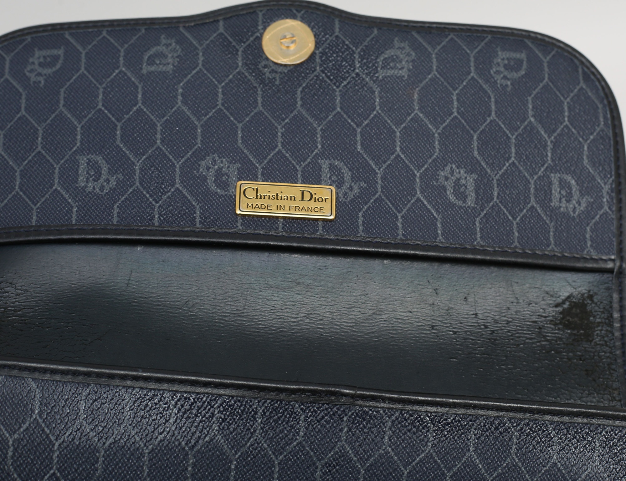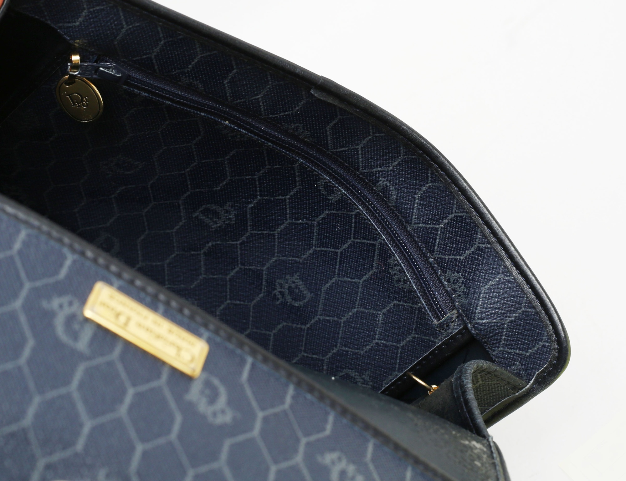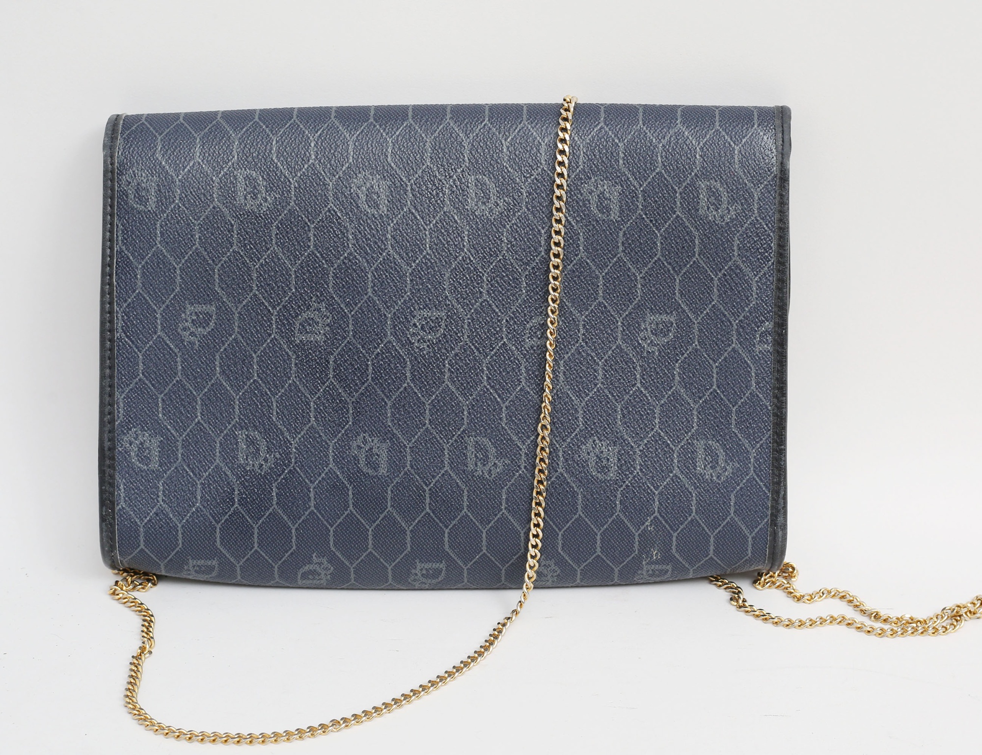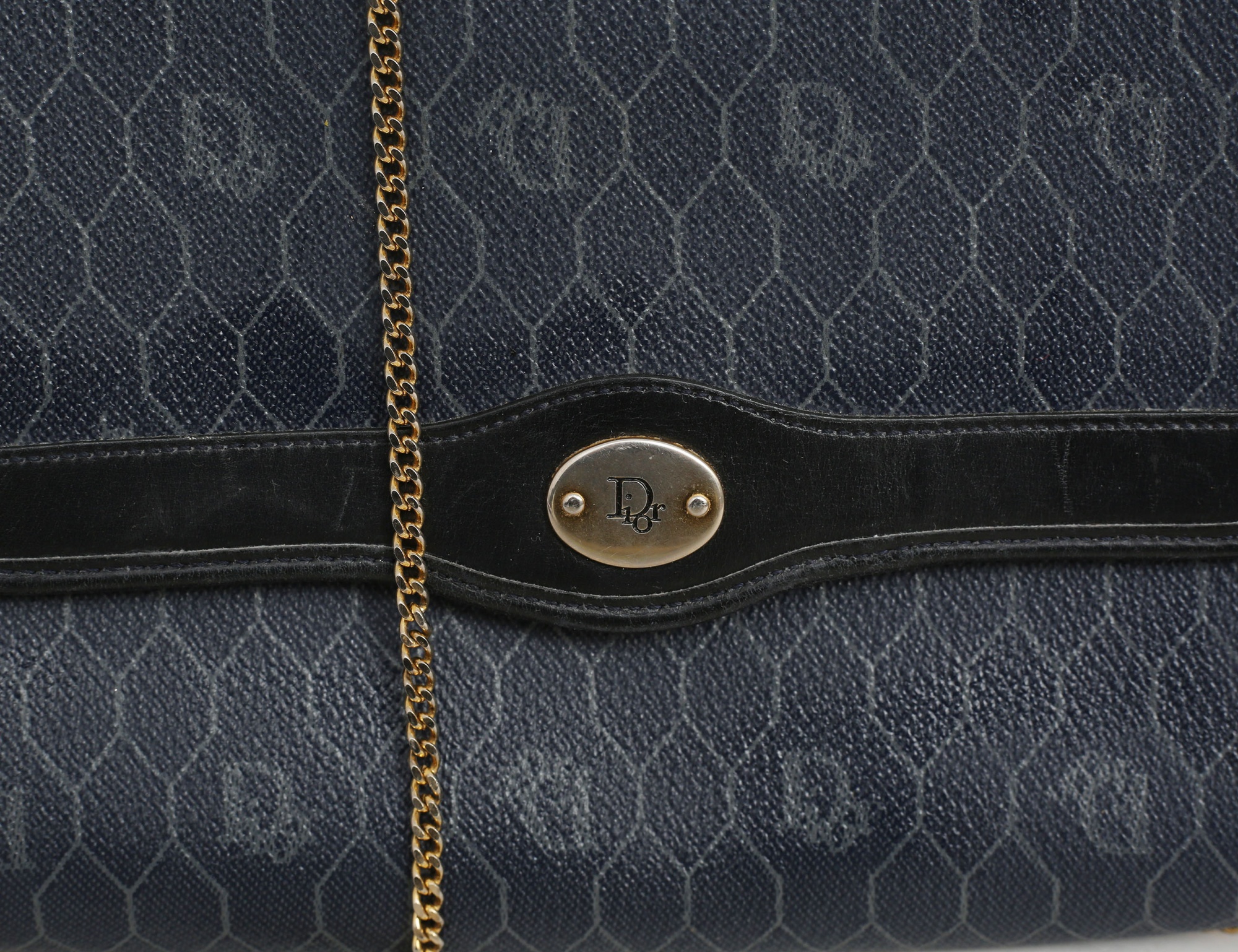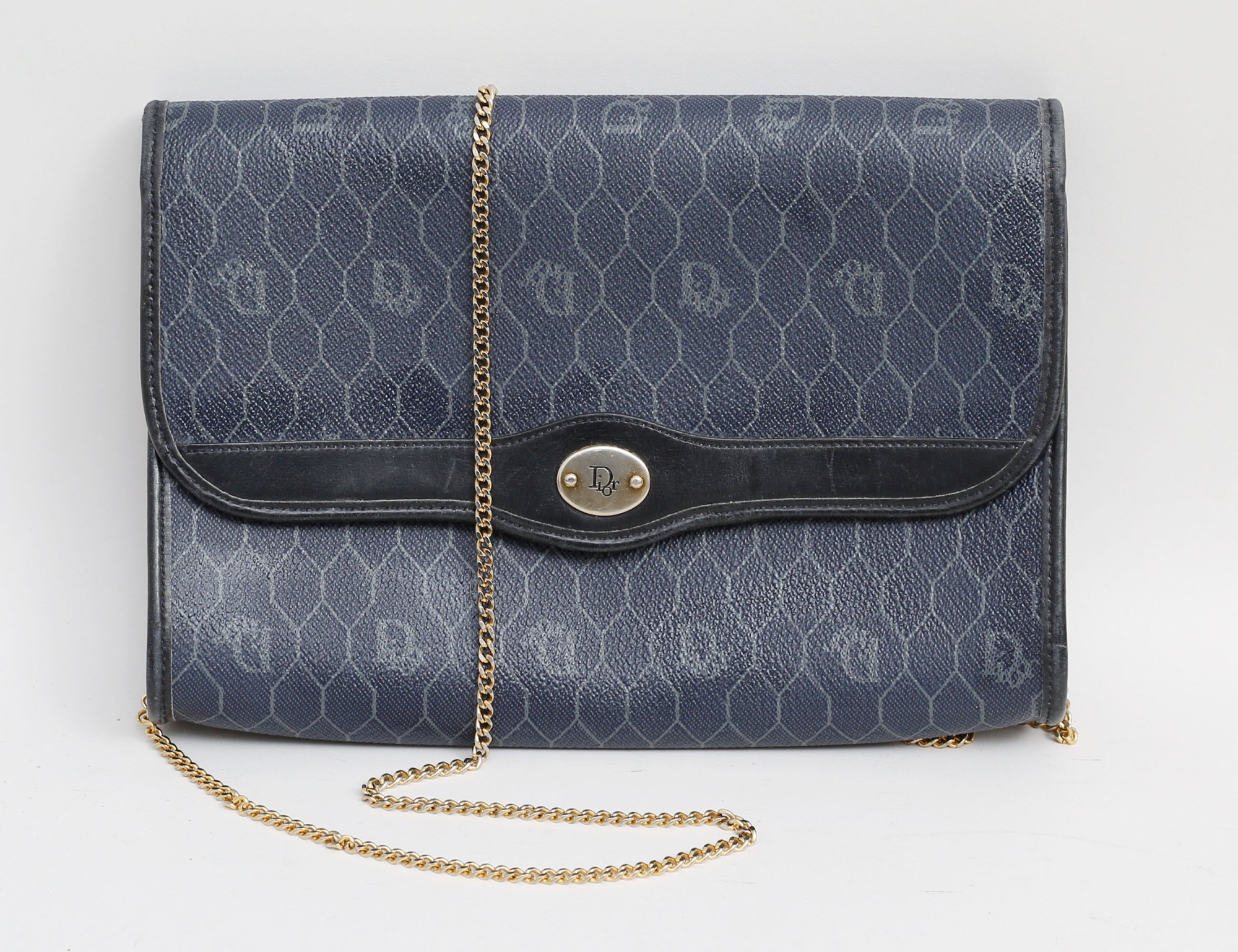 väska 1970/80-tal, marinblå honeycomb monogramcanvas, guldfärgad kedja, beslag i gulfärgad metall, invändigt ett fack med dragkedja, märkt Dior Made in France, höjd 18, bredd 24 (smärre bruksslitage)