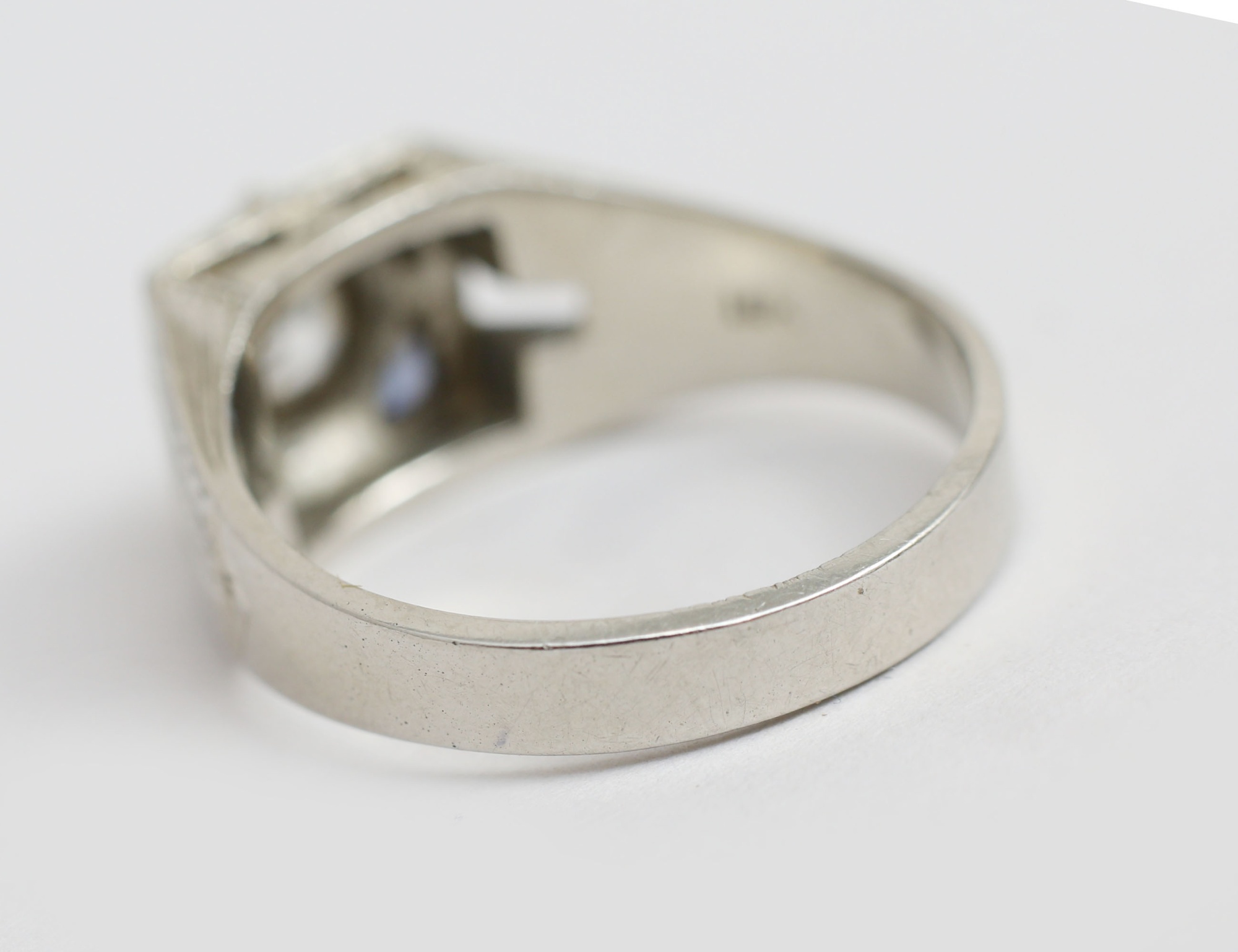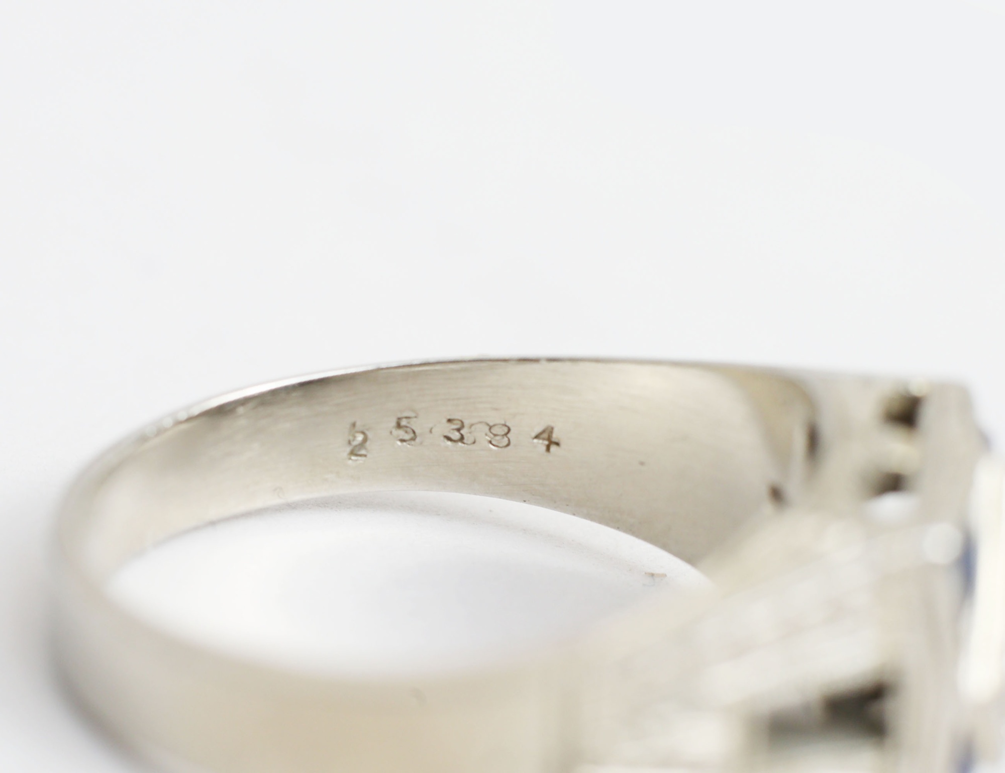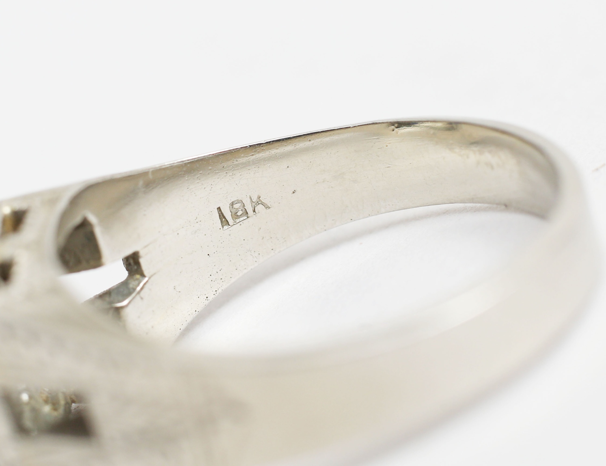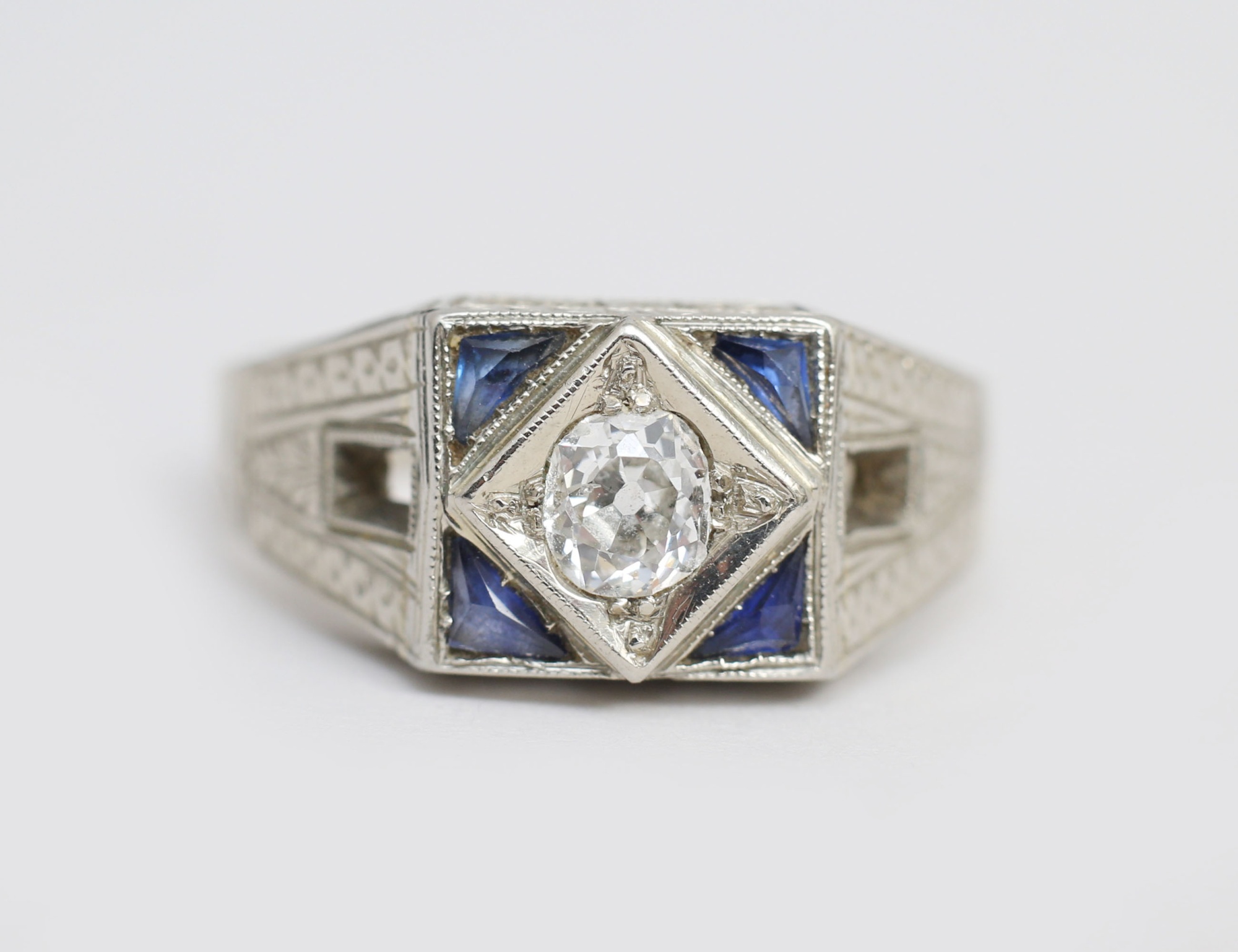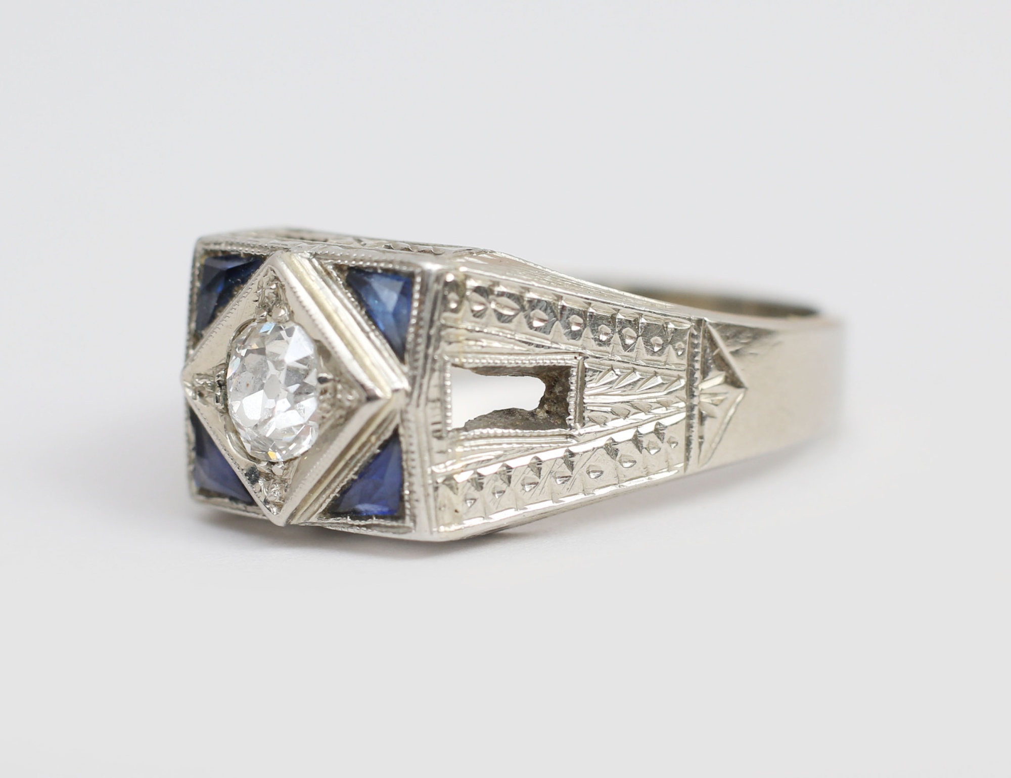 art deco 1900-talets första hälft, troligen Amerika, antikslipad diamant ca. 0,50ct., samt fasettslipade triangulära möjliga safirer (4), genombruten skena med graverad dekor, vikt 6,94 gram, storlek 19,5/61