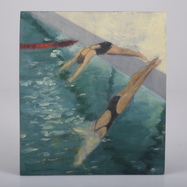 Simhoppare, signerad och datera C Ekman 2004, olja på pannå, bildmått 22 x 20 cm