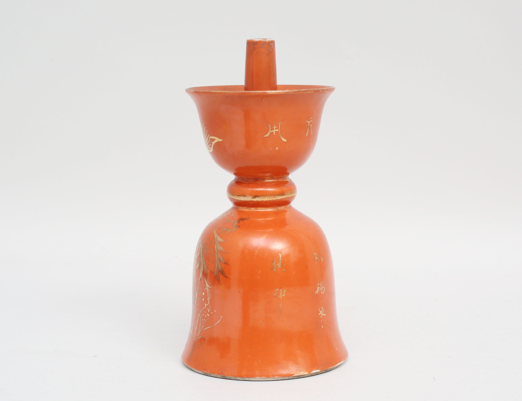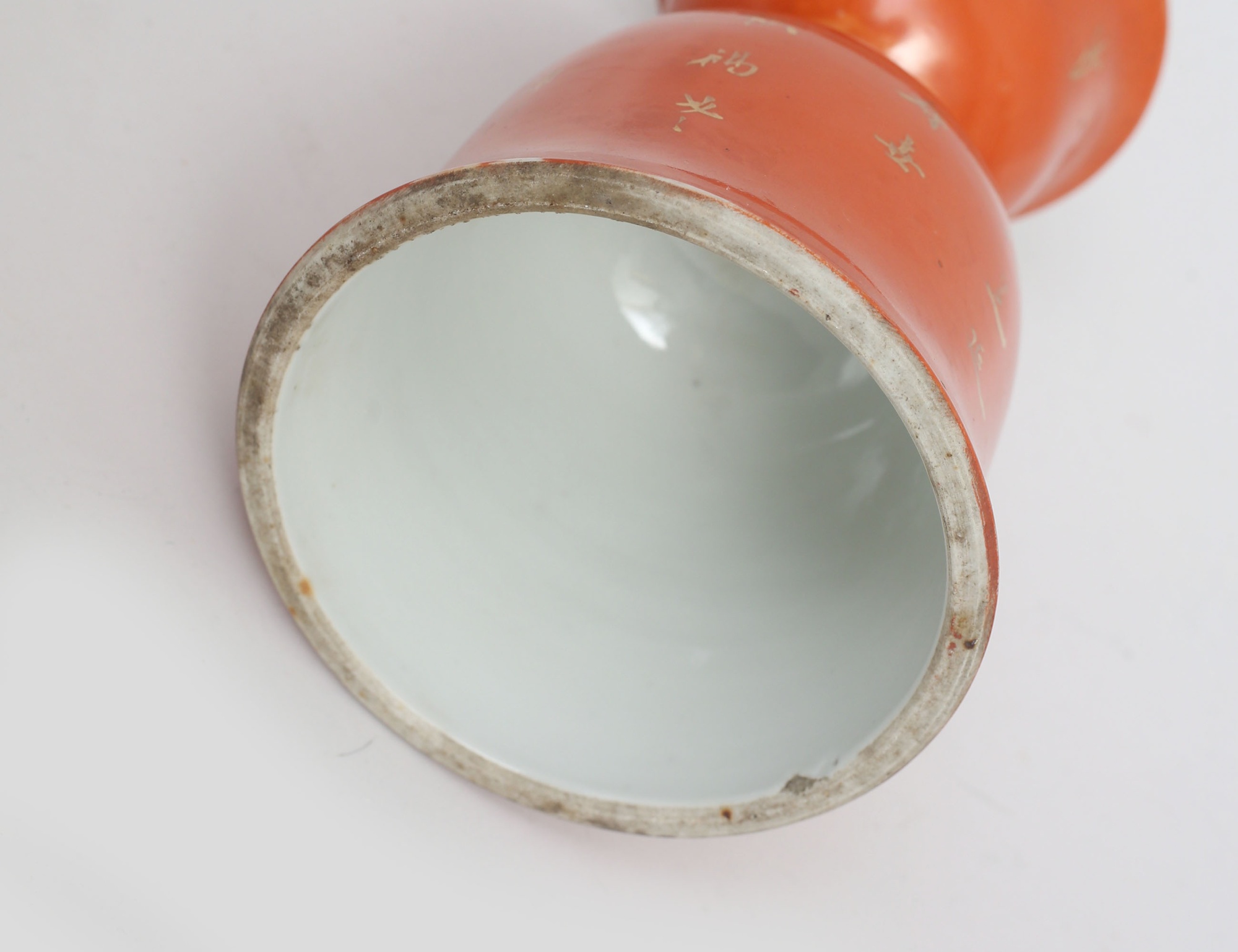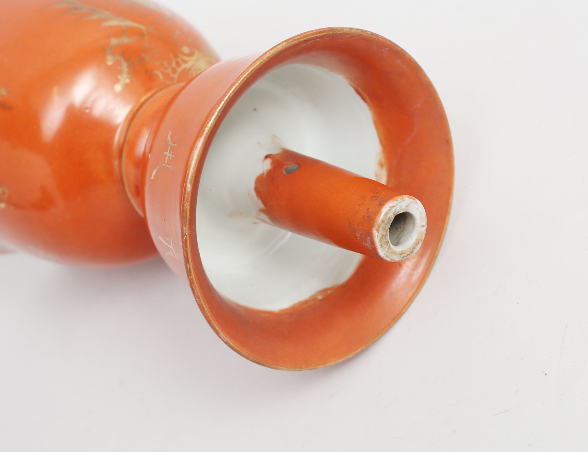 sen Qingdynasti 1644-1912, korallröd glasyr, förgylld dekor av fågel och skrivtecken, höjd 23