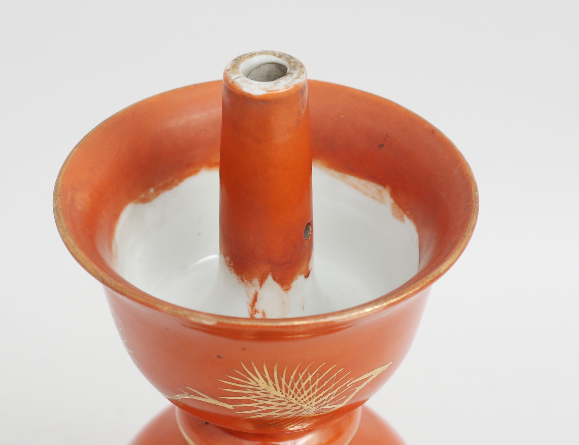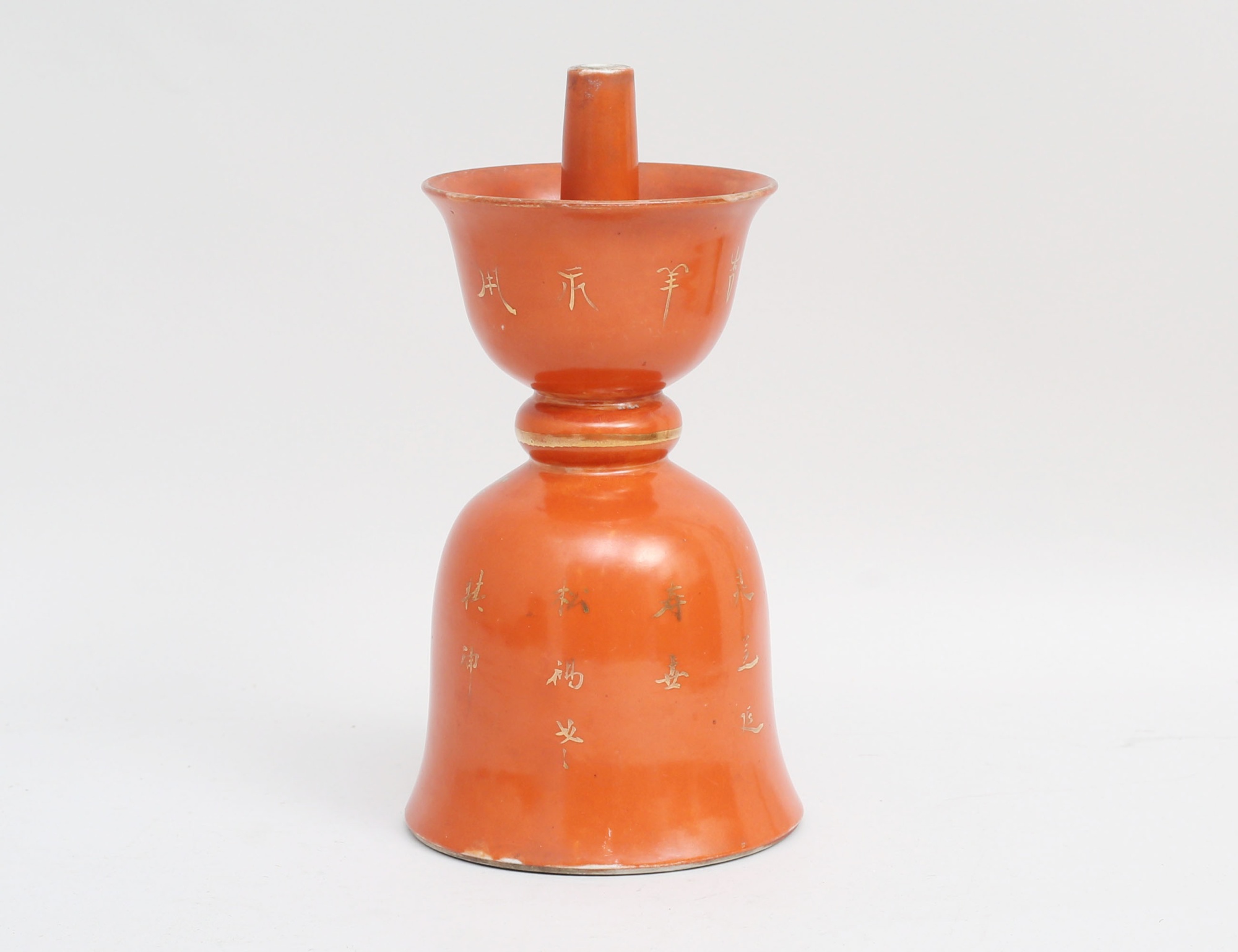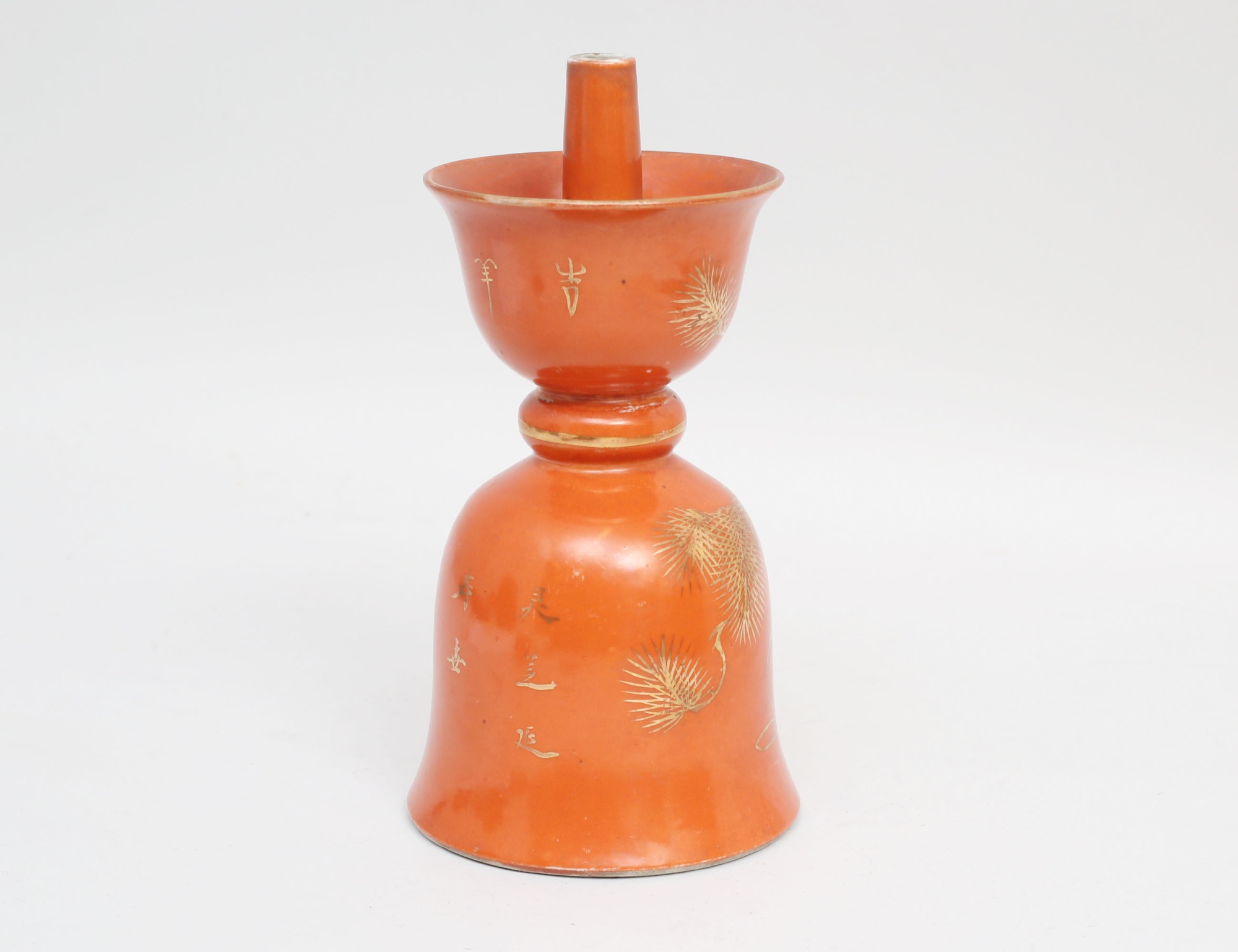 sen Qingdynasti 1644-1912, korallröd glasyr, förgylld dekor av fågel och skrivtecken, höjd 23