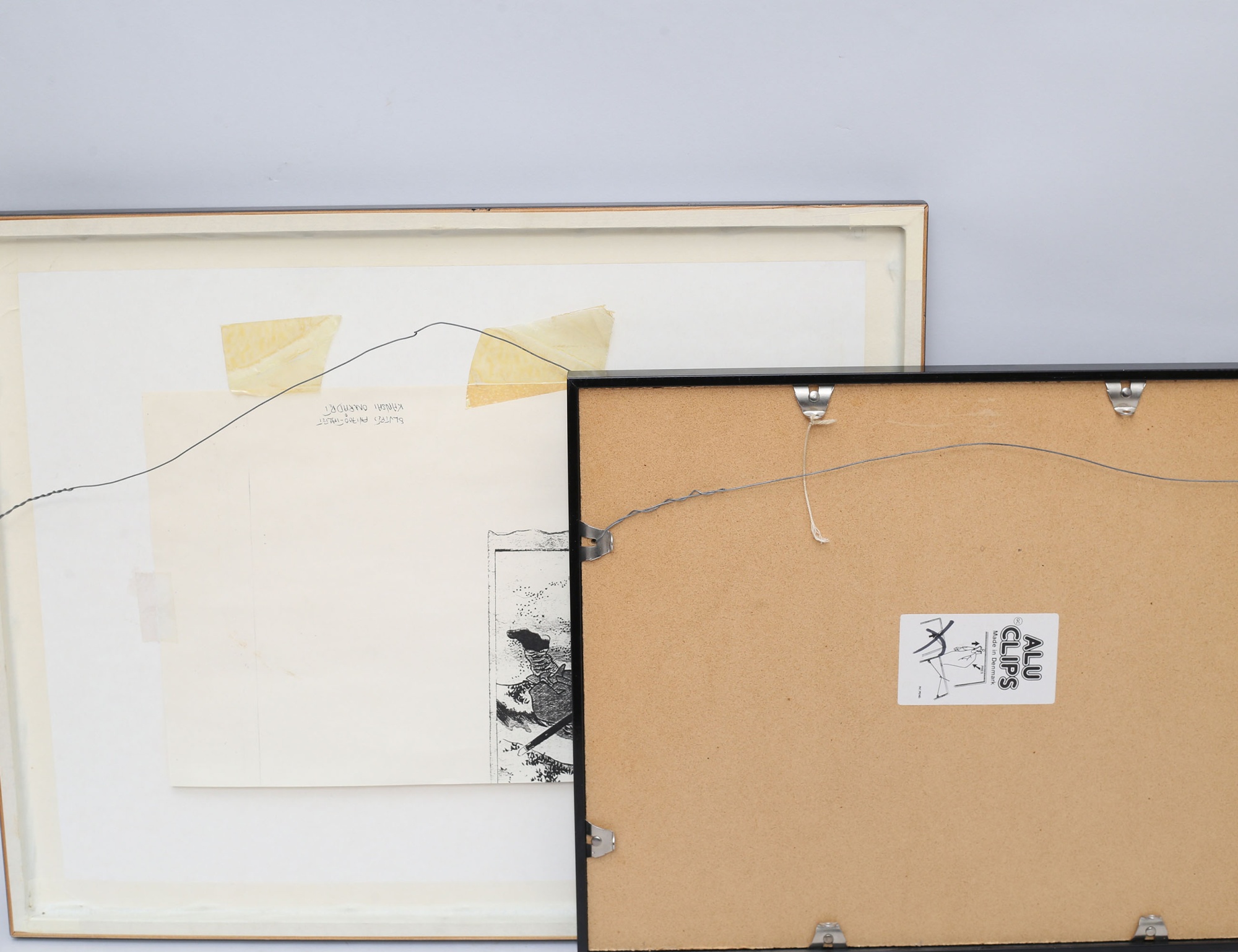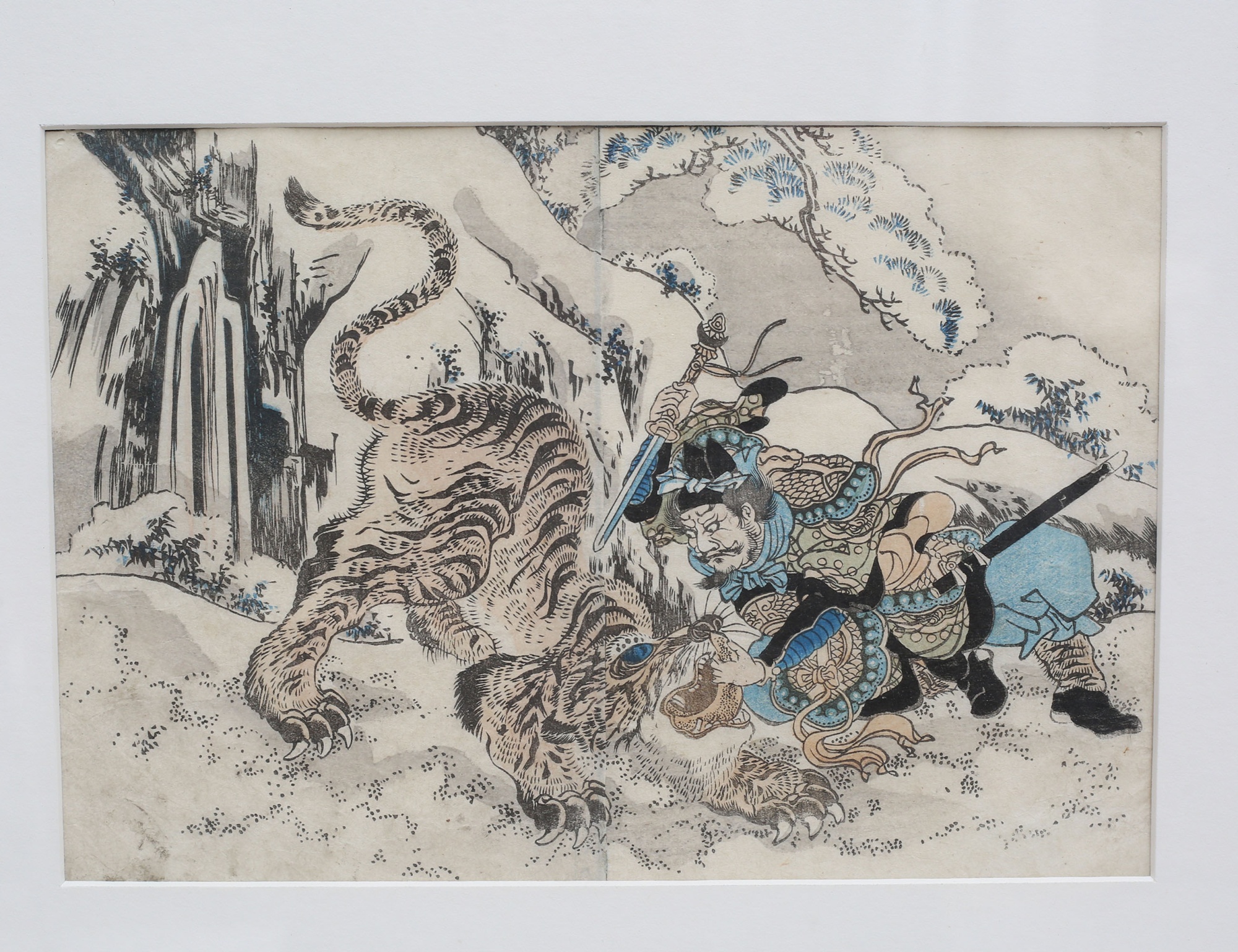 Kita Busei 1776-1856, färgträsnitt - stridscen mellan en krigare och tiger, 18x26, rammått 39x48, Kino Tsurayuki 1797-1861, krigare med häst samt dikt, 16,5x25, rammått 31x41 (2)