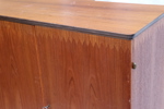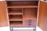 Teak och betsad trä. Dubbla dörrar. Invändigt med hyllor och tre lådor. Nedtill med två utdragbara skivor. Nyckel finns.