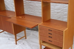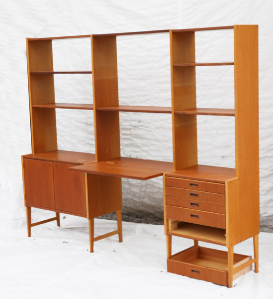 Teak och ek. Med lådor, luckor och öppna hyllor. Nyckel finns.