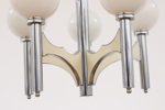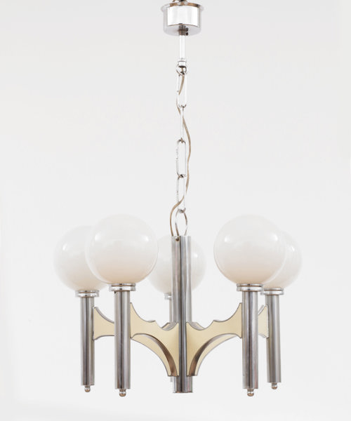 Kromad metall och plast. Fem ljuspunkter. Kupor i vittonat glas.