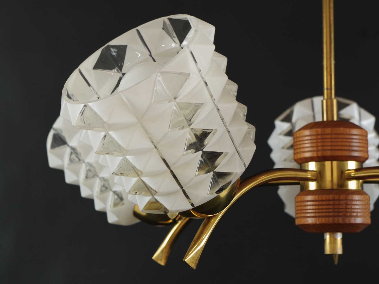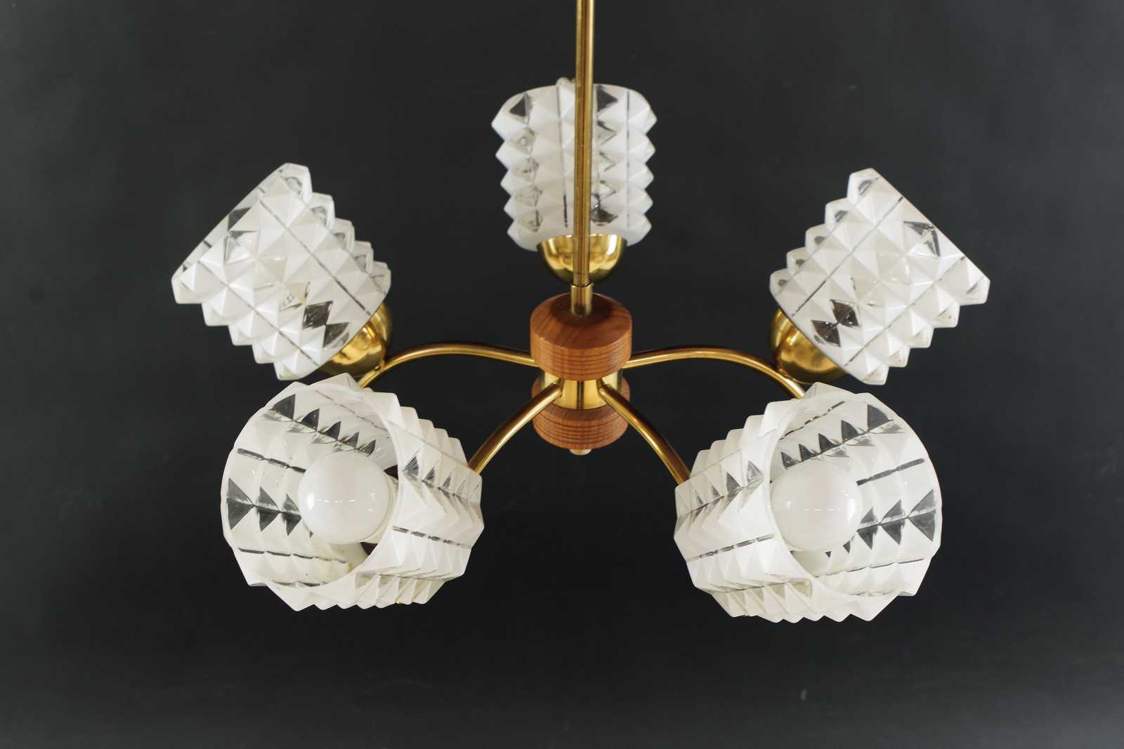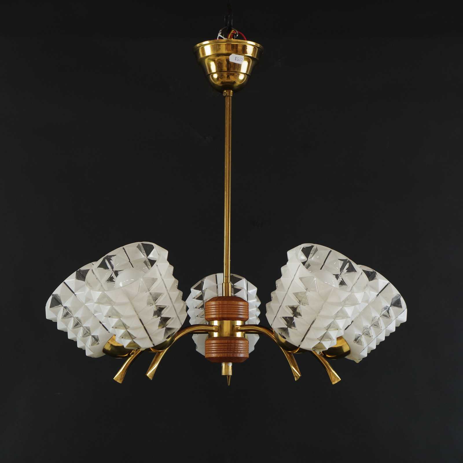 Bilder TAKLAMPA 5 armar, mässing, kupor i glas, 1950-60 tal. D:48cm H:50cm