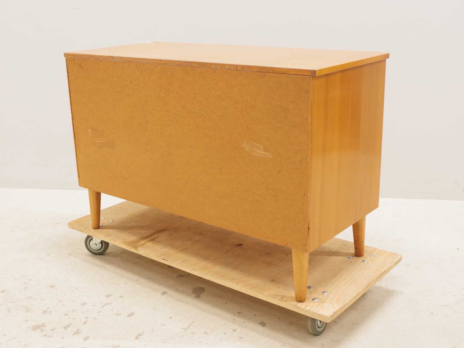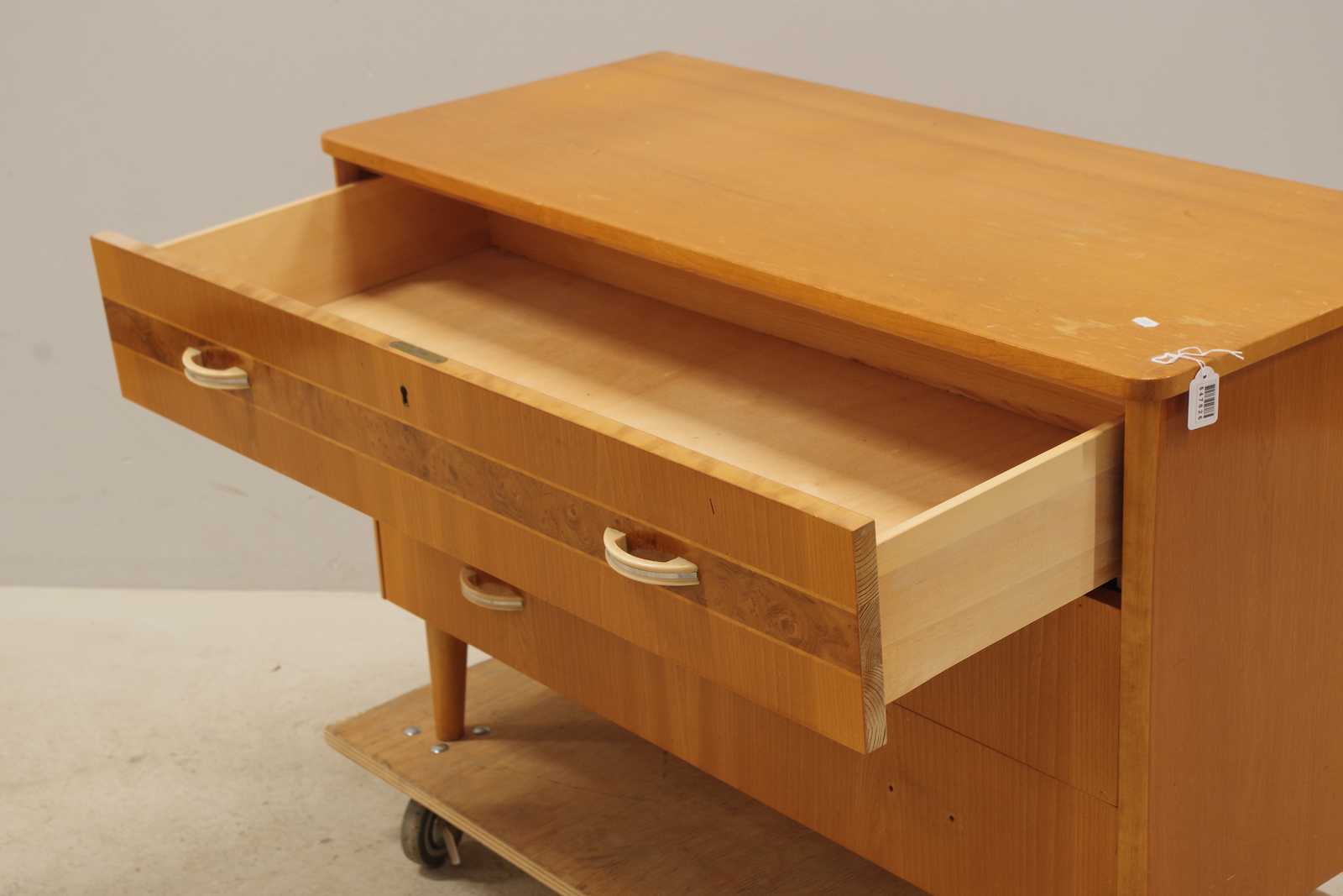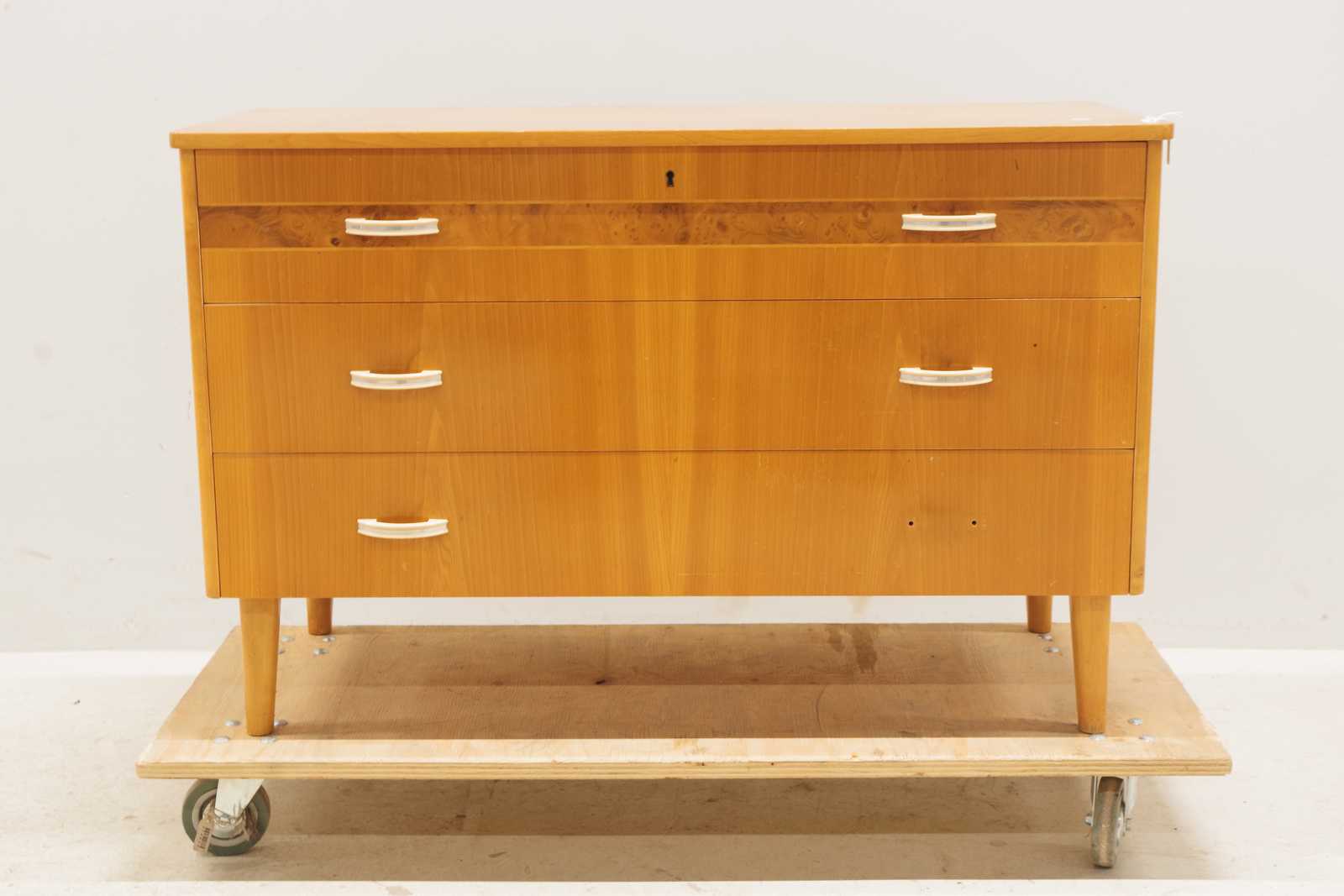 Bilder BYRÅ 3 lådig, i björk, med intarsia, 1900 talets mitt. H:68x 105x 45cm (bruksslitage, fläckar, ett handtag saknas)