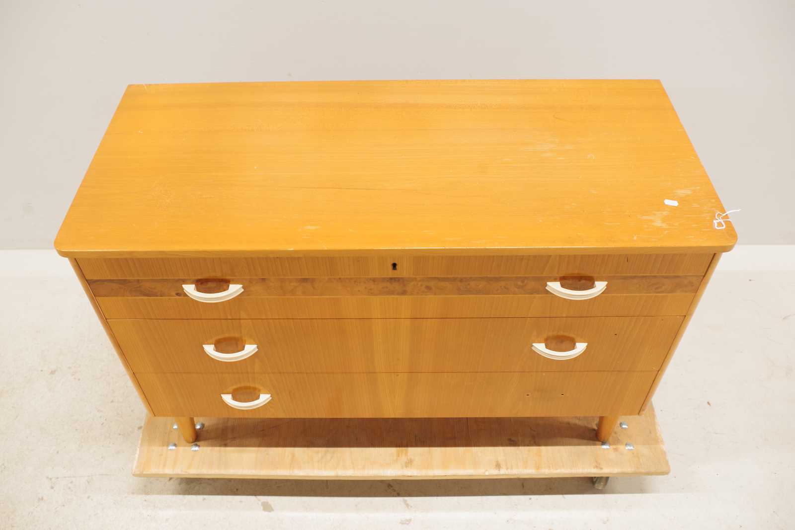 BYRÅ 3 lådig, i björk, med intarsia, 1900 talets mitt. H:68x 105x 45cm (bruksslitage, fläckar, ett handtag saknas)