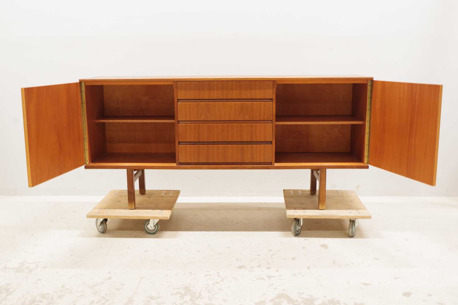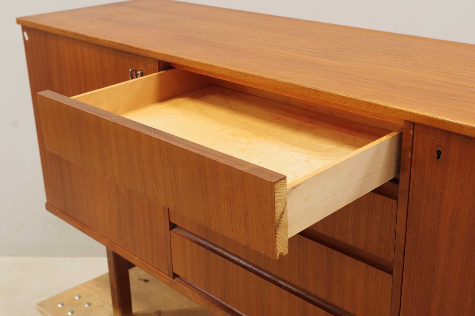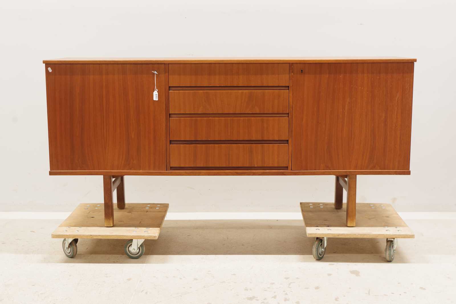 Auktioner SIDEBOARD i teak, lådor 4st, skåp 2st med bakomliggande hyllplan, 1900 talets andra hälft. H:81x 171x 43cm (bruksslitage, fläckar förekommer)