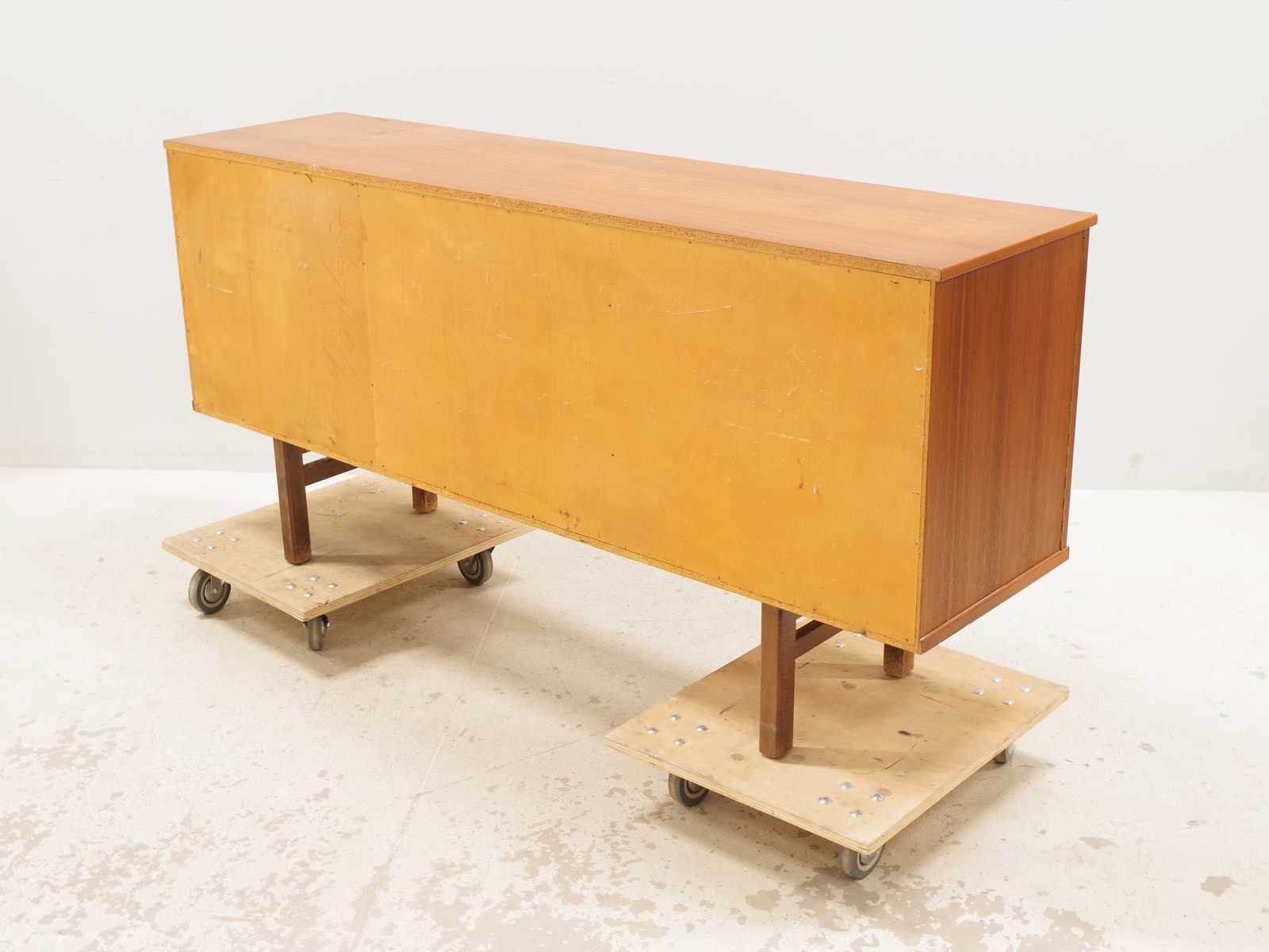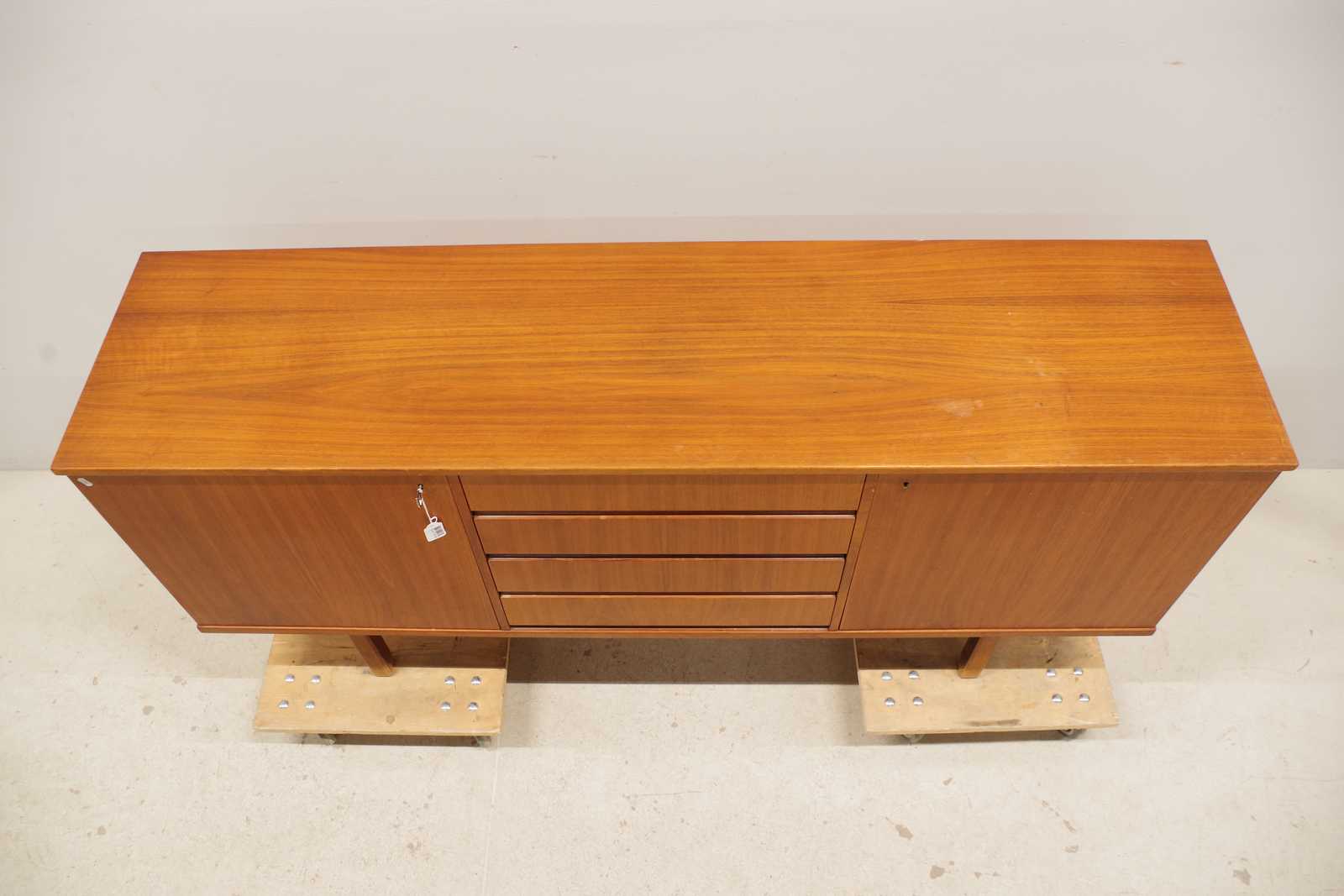 SIDEBOARD i teak, lådor 4st, skåp 2st med bakomliggande hyllplan, 1900 talets andra hälft. H:81x 171x 43cm (bruksslitage, fläckar förekommer)