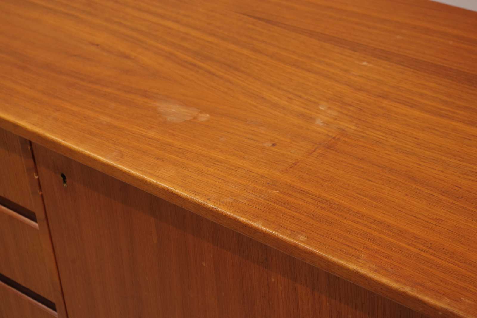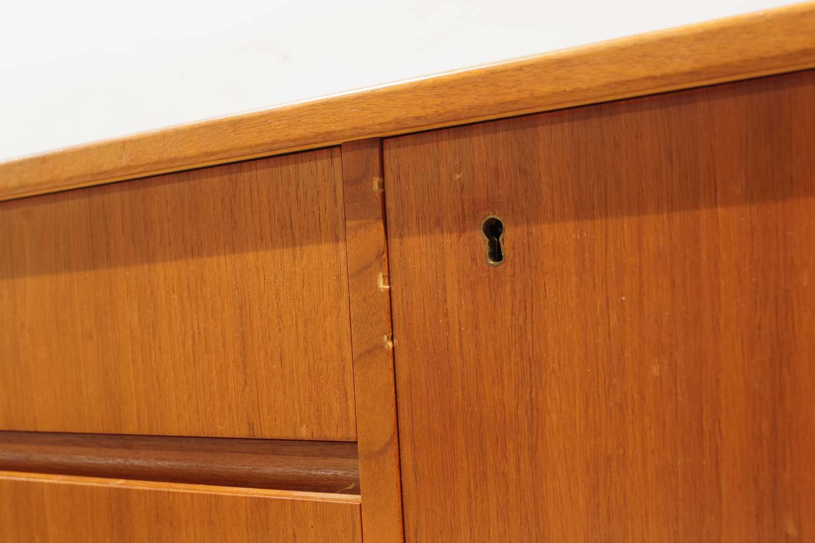 Bilder SIDEBOARD i teak, lådor 4st, skåp 2st med bakomliggande hyllplan, 1900 talets andra hälft. H:81x 171x 43cm (bruksslitage, fläckar förekommer)