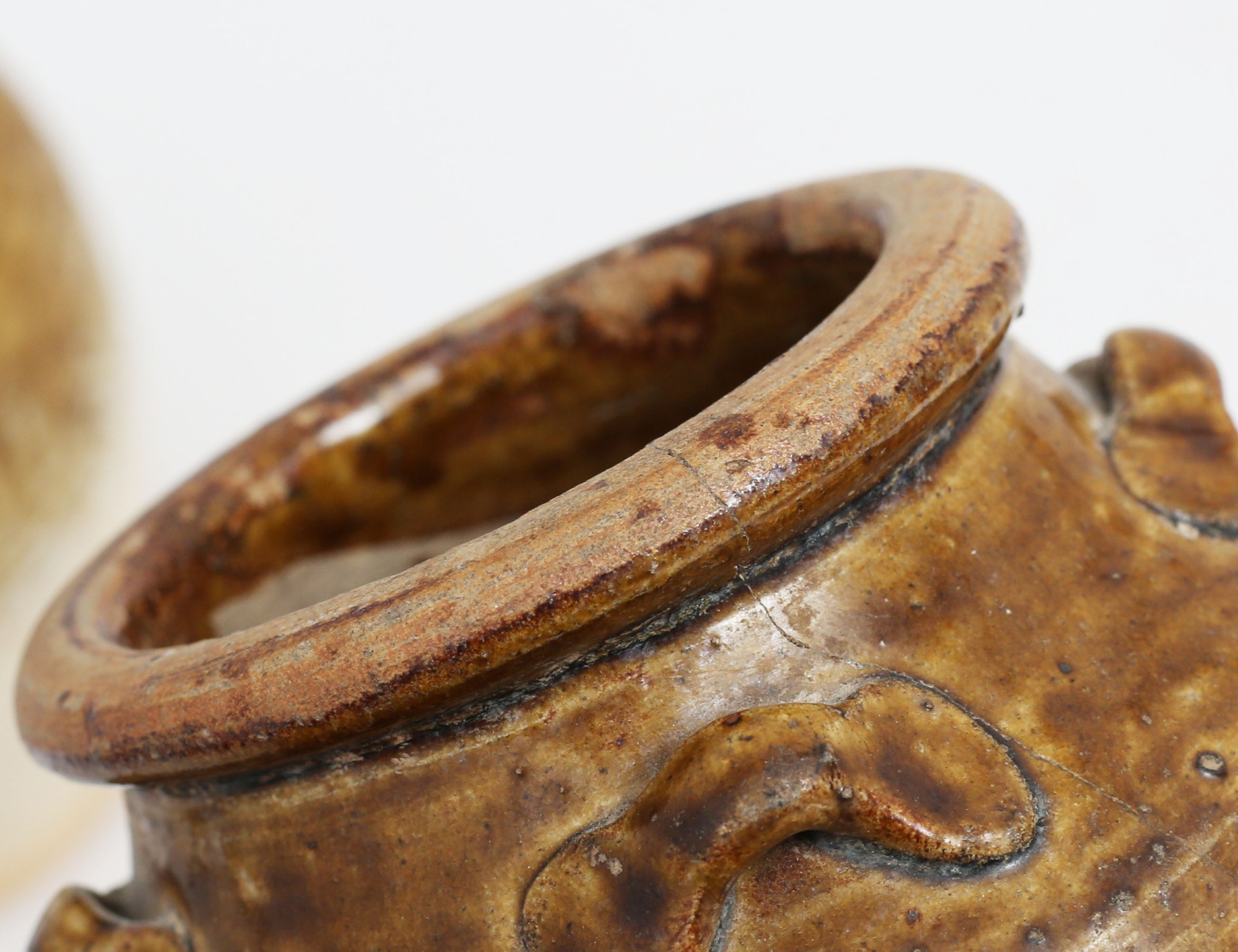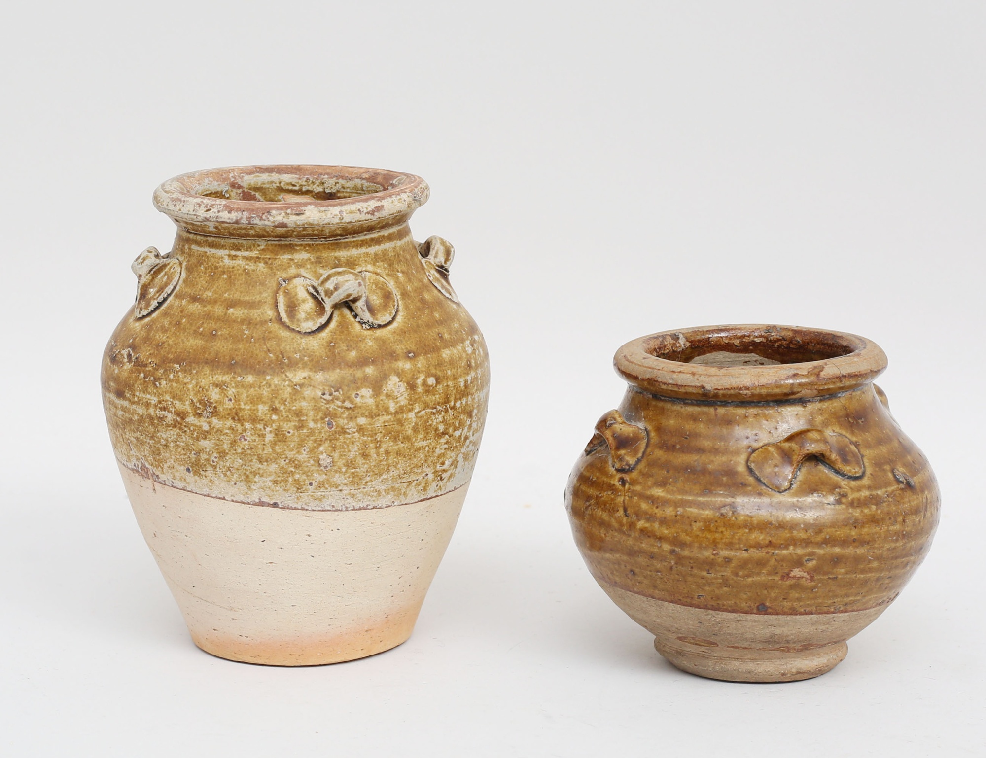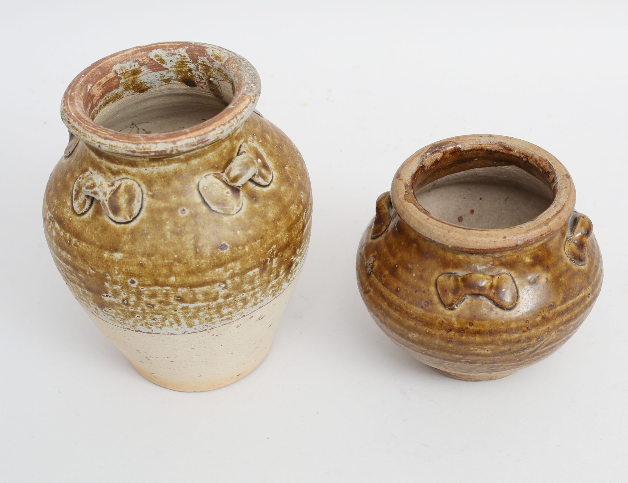 troligen ung 960-1279, delvis brunglaserade, hänklar ovanpå liv, den ena vrakfynd med matt yta, höjd 10 respektive 15 (mynningarna med smärre lagning respektive liten spricka)
