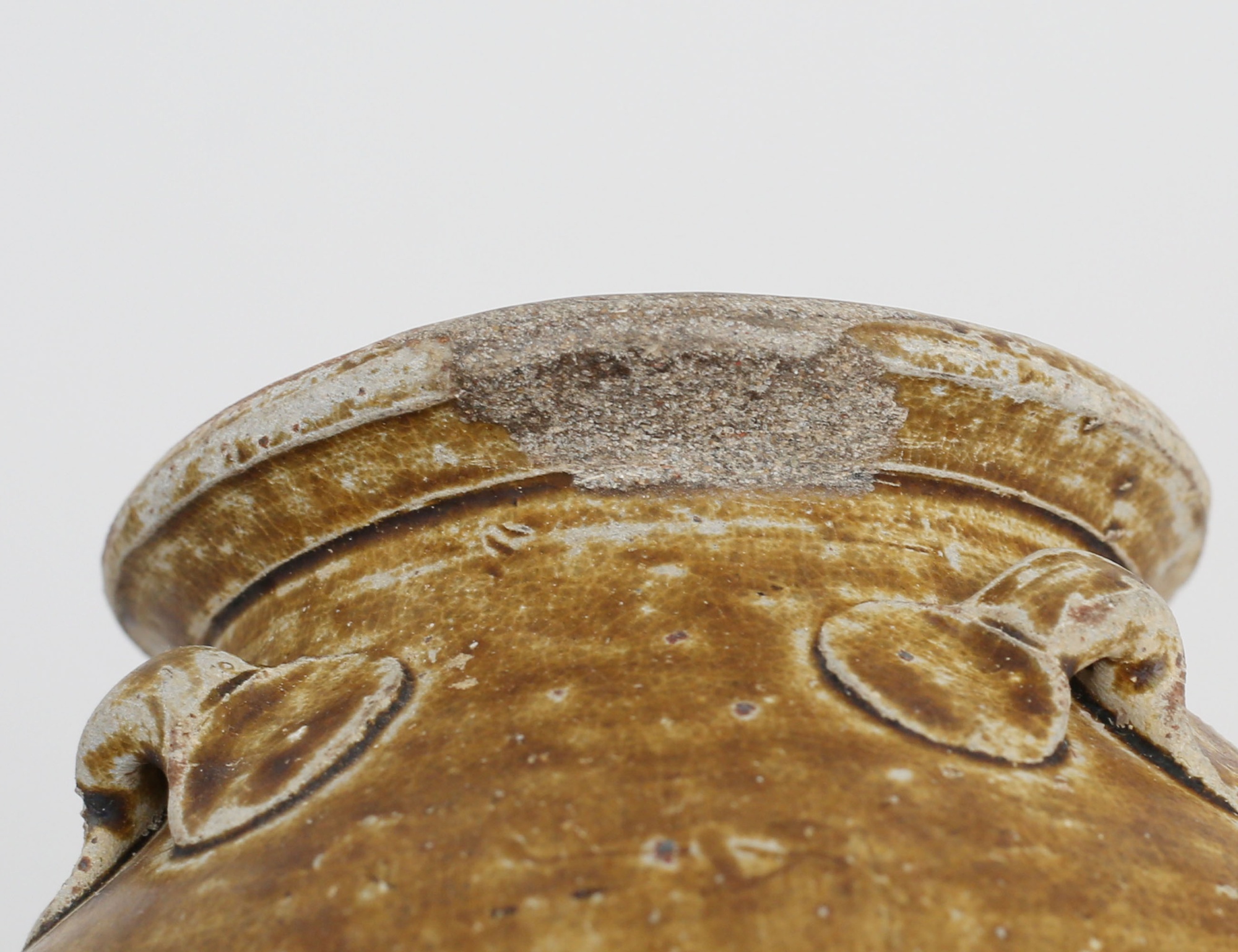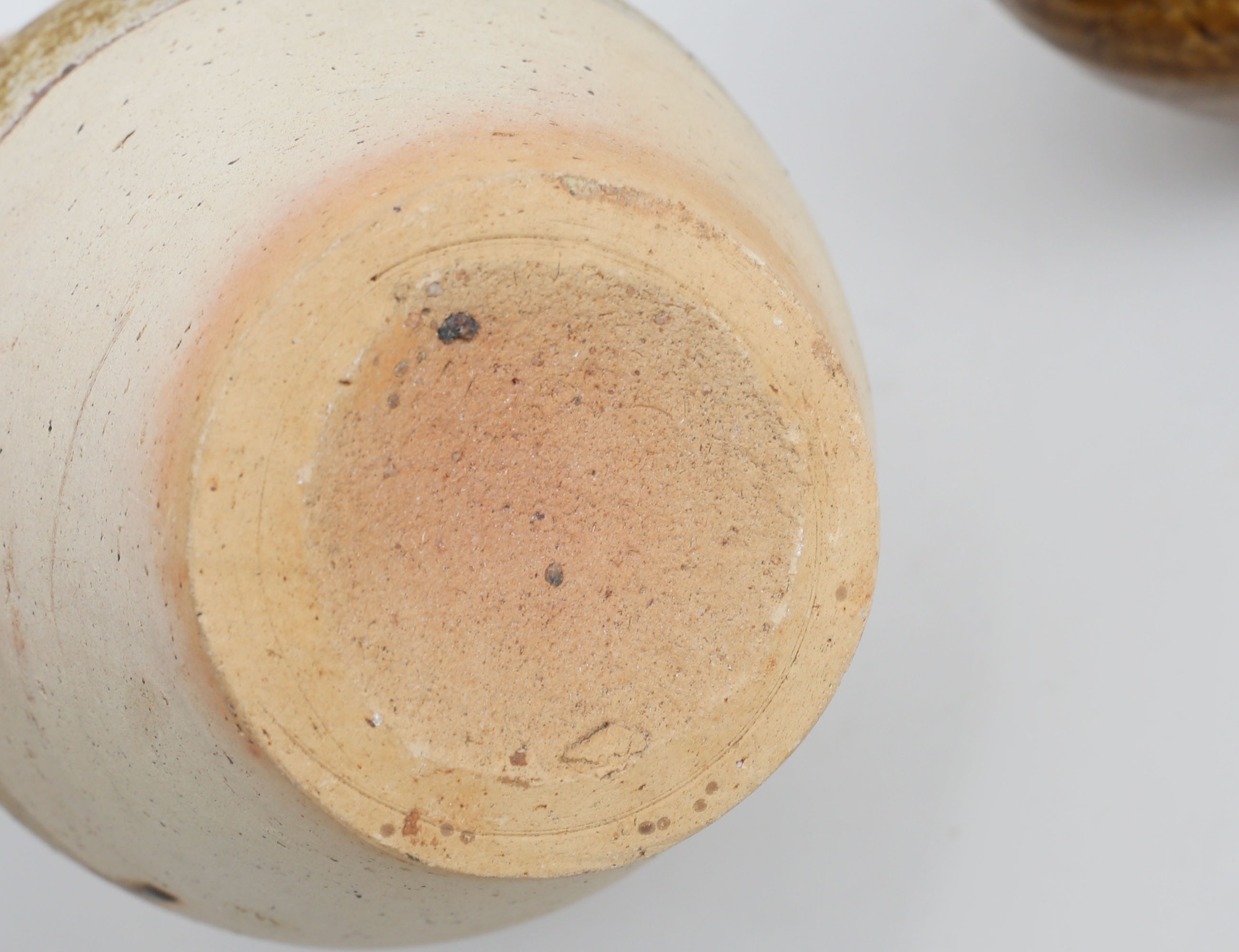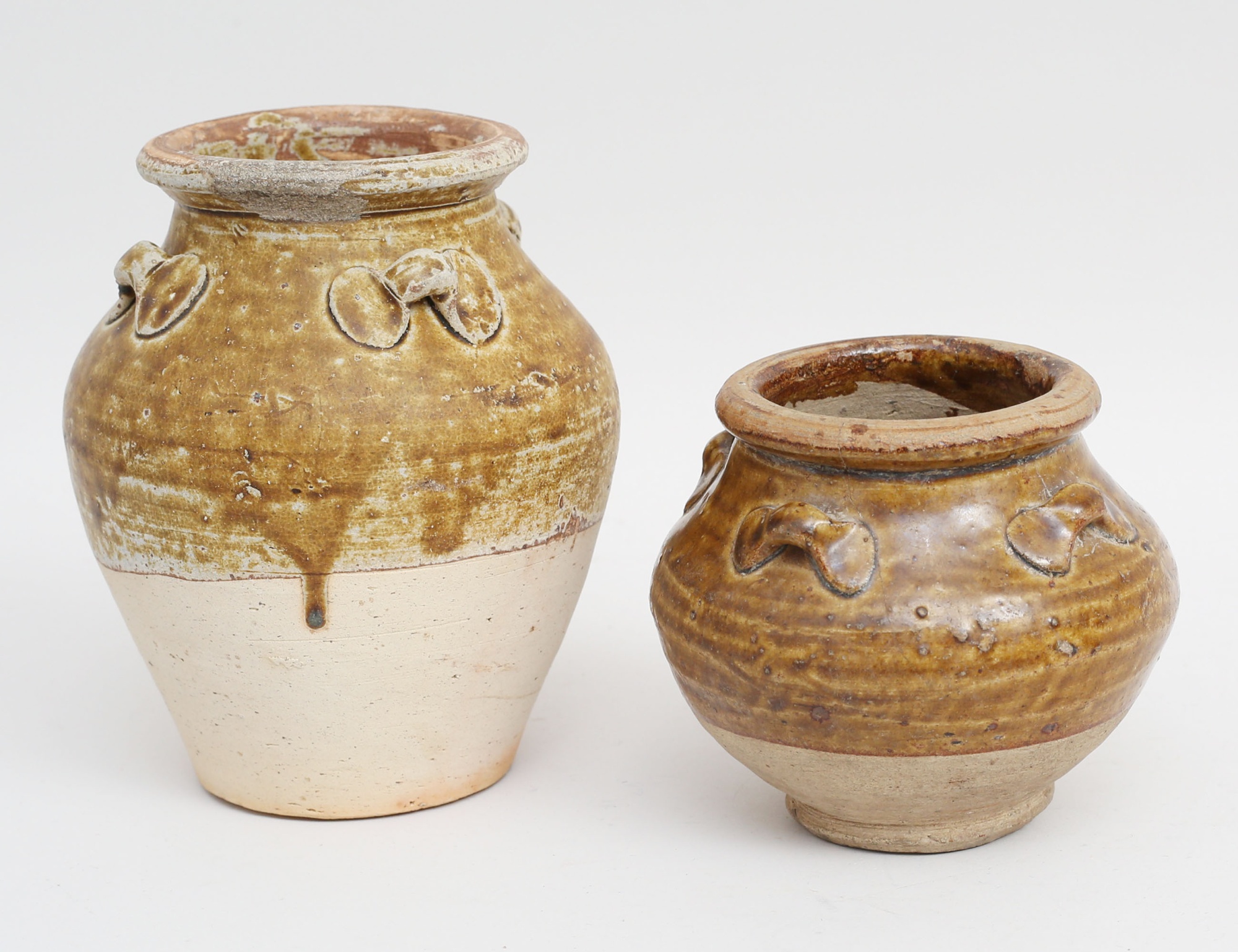 troligen ung 960-1279, delvis brunglaserade, hänklar ovanpå liv, den ena vrakfynd med matt yta, höjd 10 respektive 15 (mynningarna med smärre lagning respektive liten spricka)