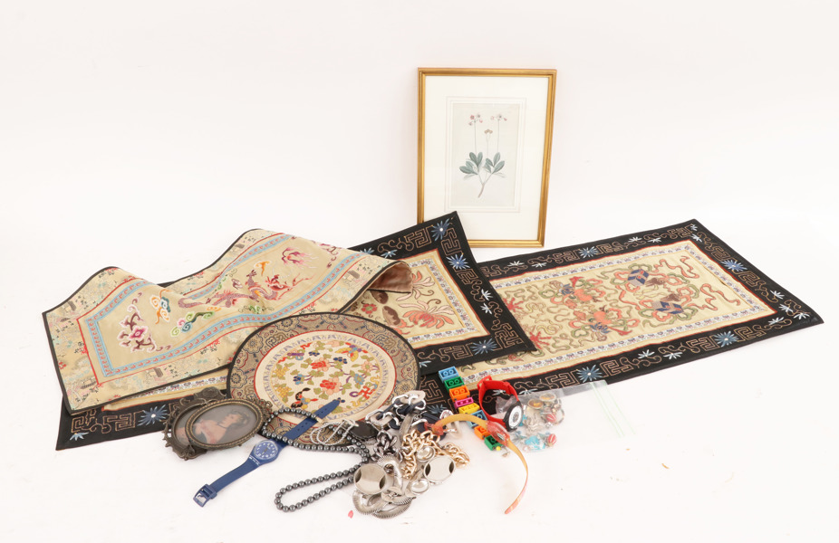Broderade dukar, Kina. Armbandsur, Swatch. Bijouterier, m.m.