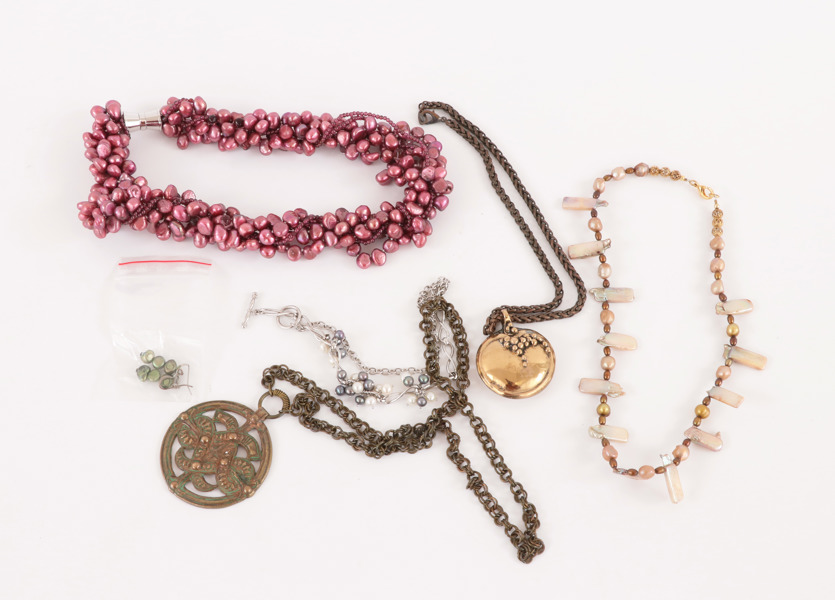 Halsband med odlade pärlor. Halsband i sterlingsilver, med pärlor. Halsband med hänge, brons, Kalevala, m.m.