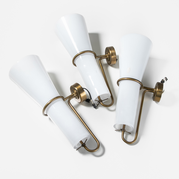 HANS-AGNE JAKOBSSON, väggarmaturer, 3 st, Markaryd, glas och mässing, 1900-tal.
