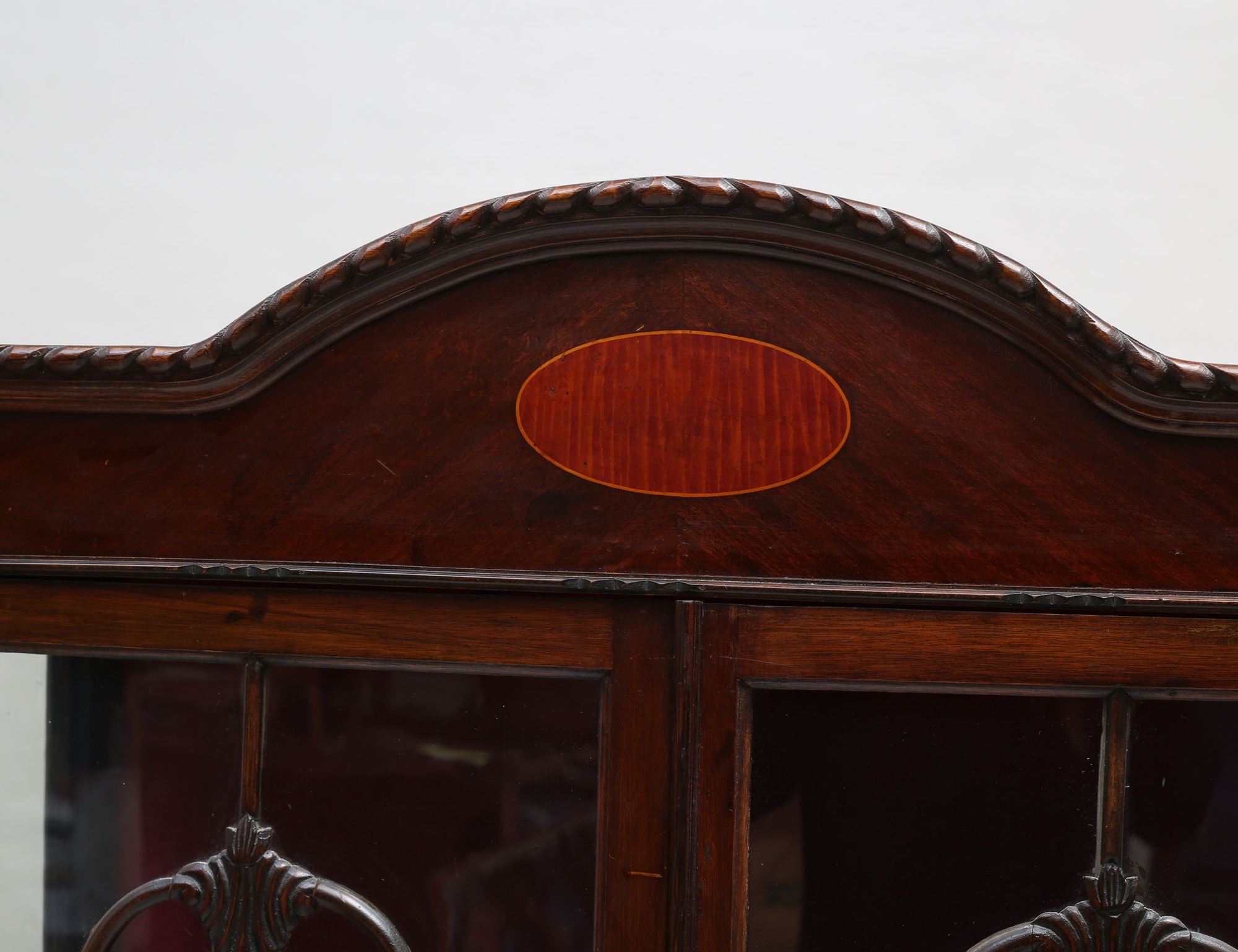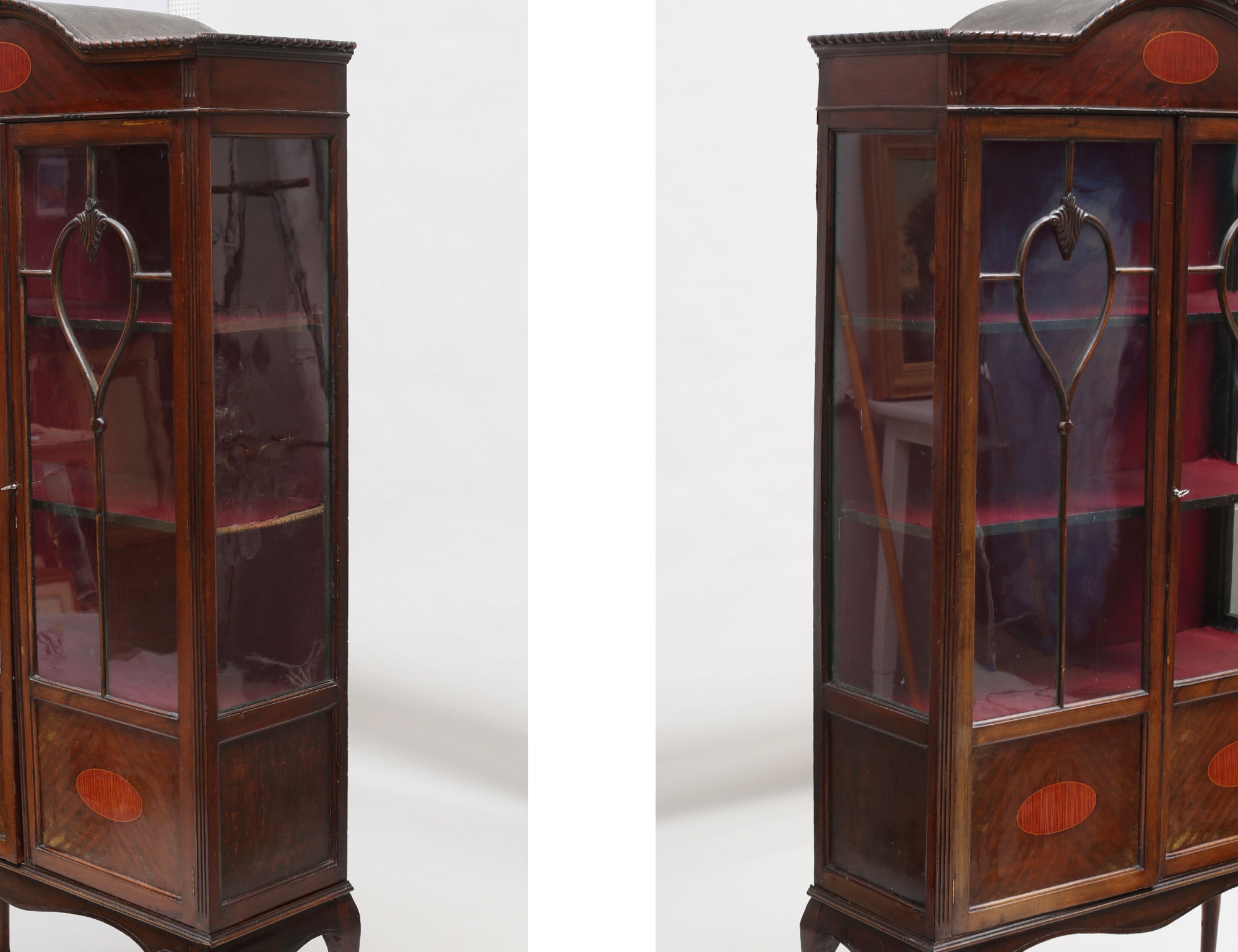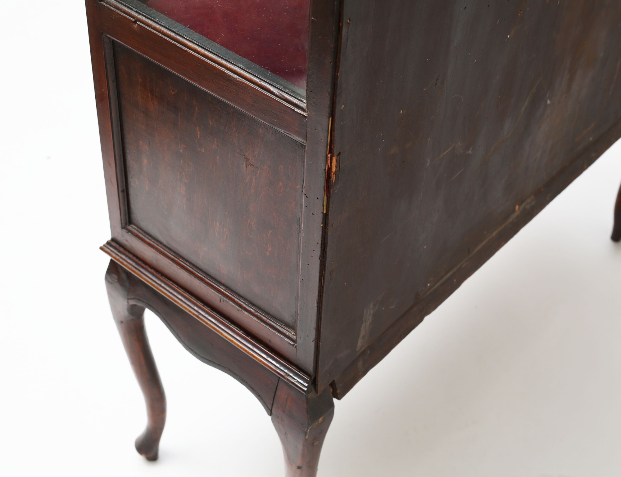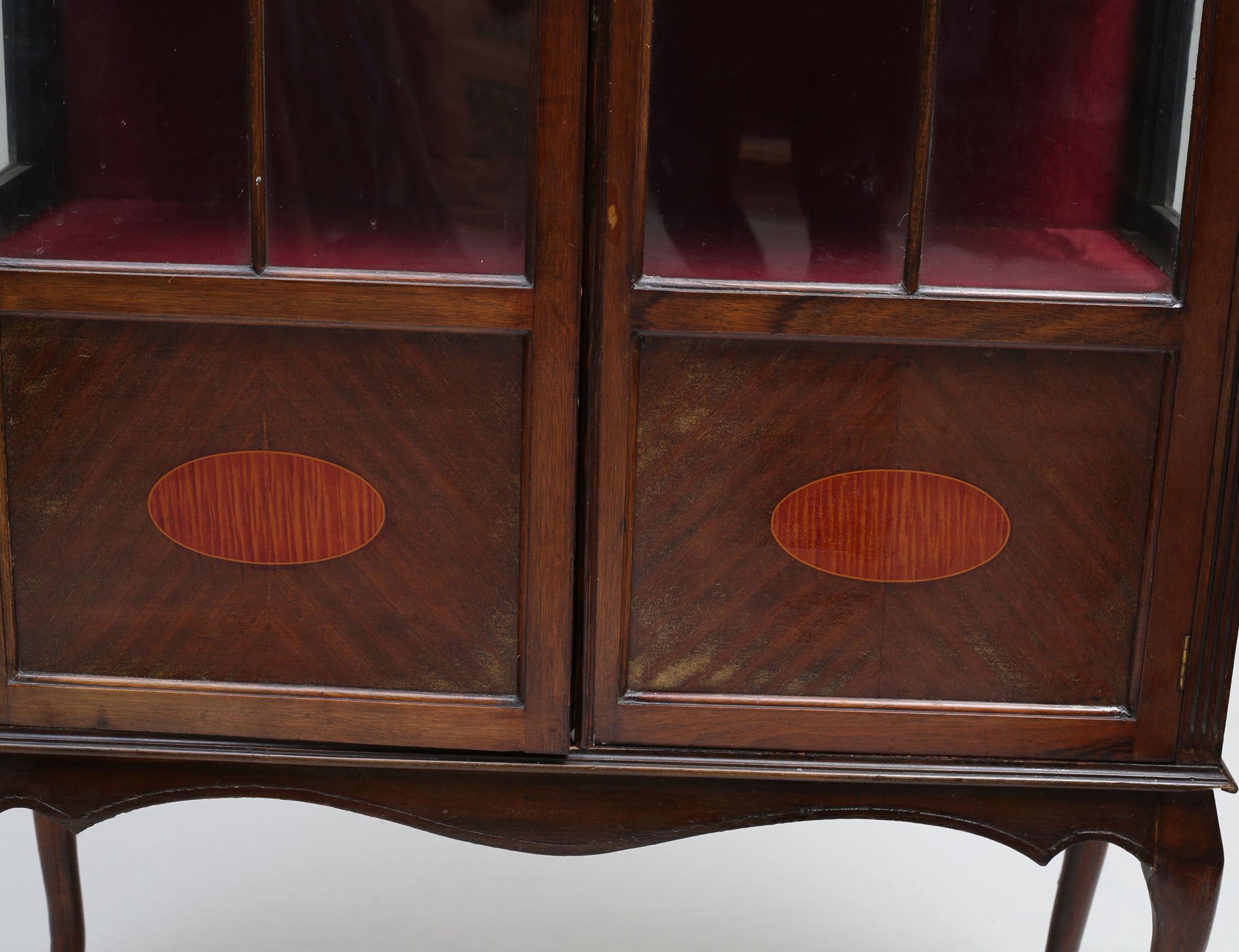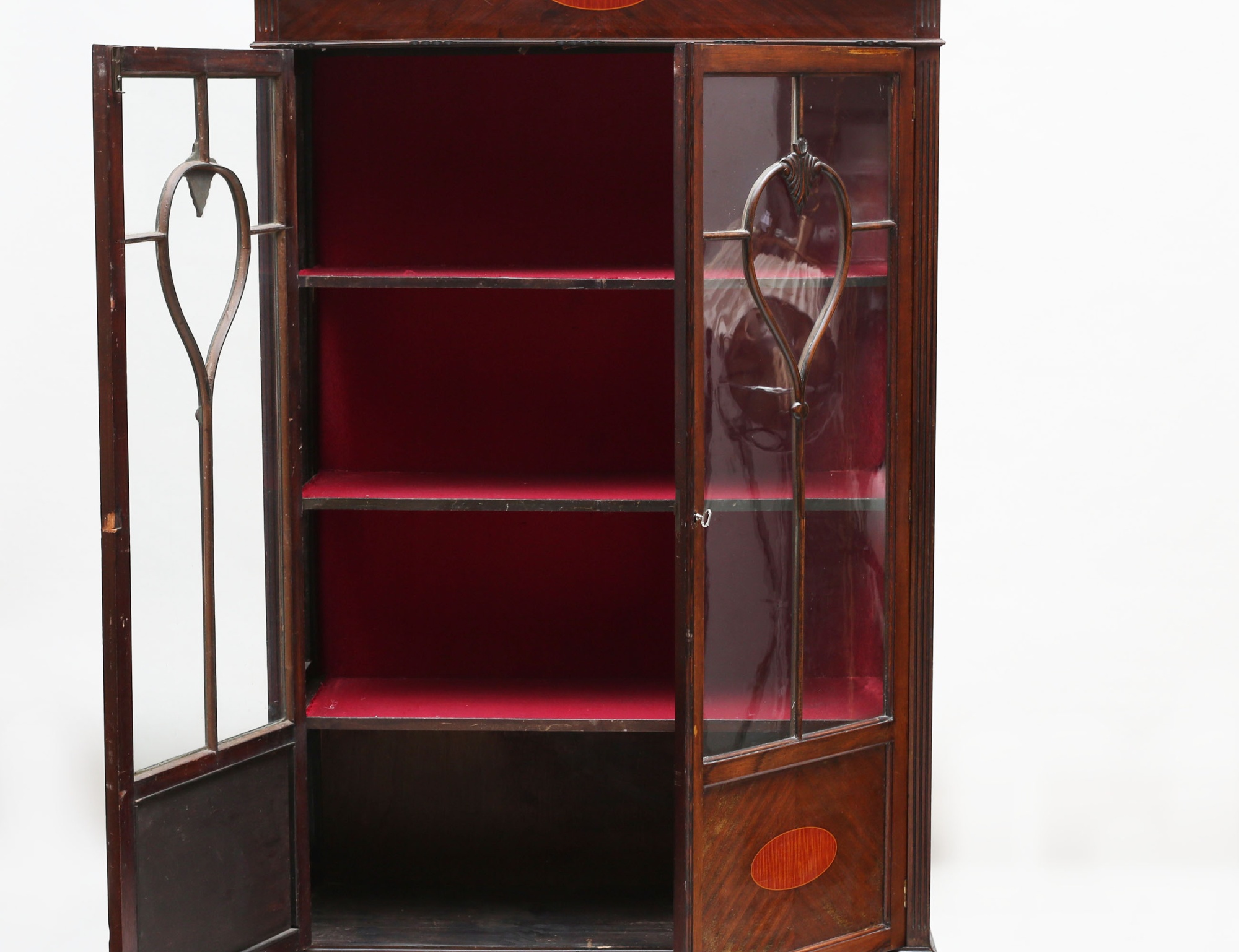 mahognyfanér, glasade dörrar med spröjs samt glasade sidor, tre hyllplan, invändigt mörkrött tyg, höjd 176, bredd 89, djup 33 (bruksslitage, smärre skrapmärken)