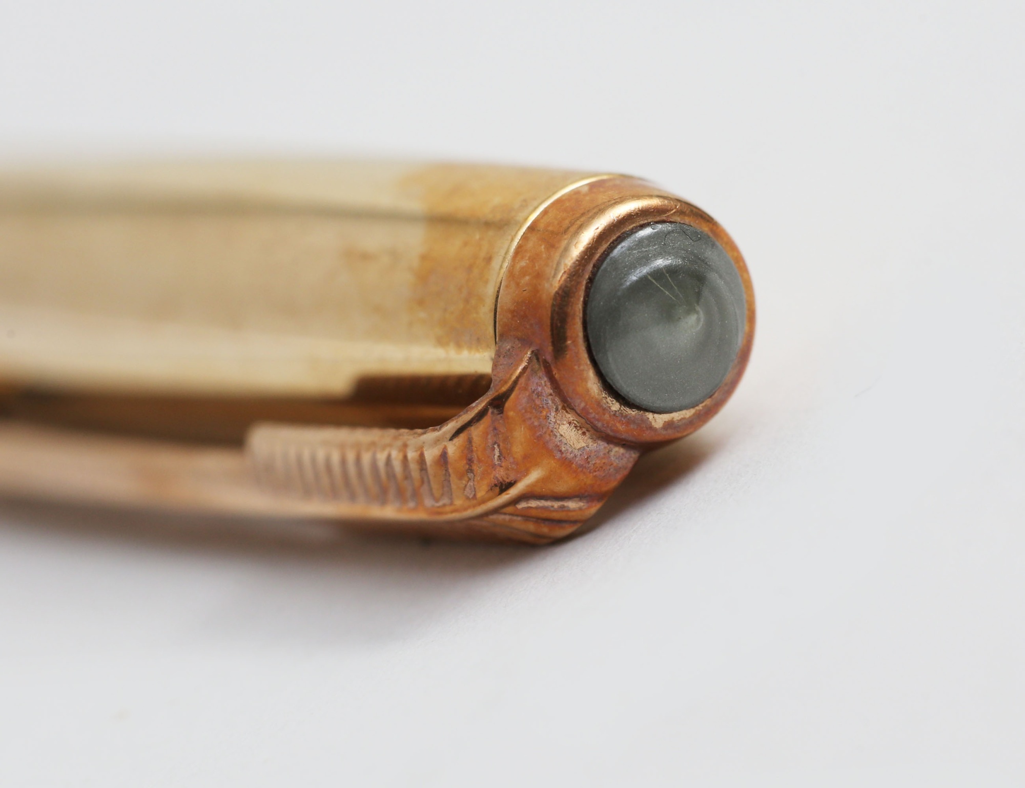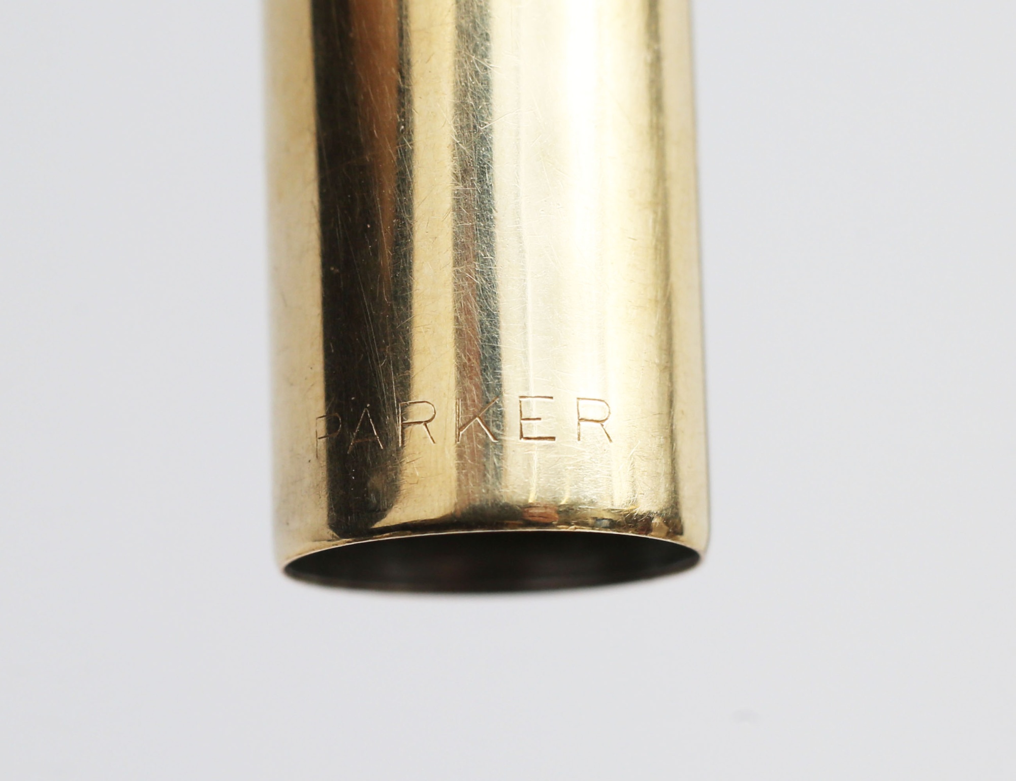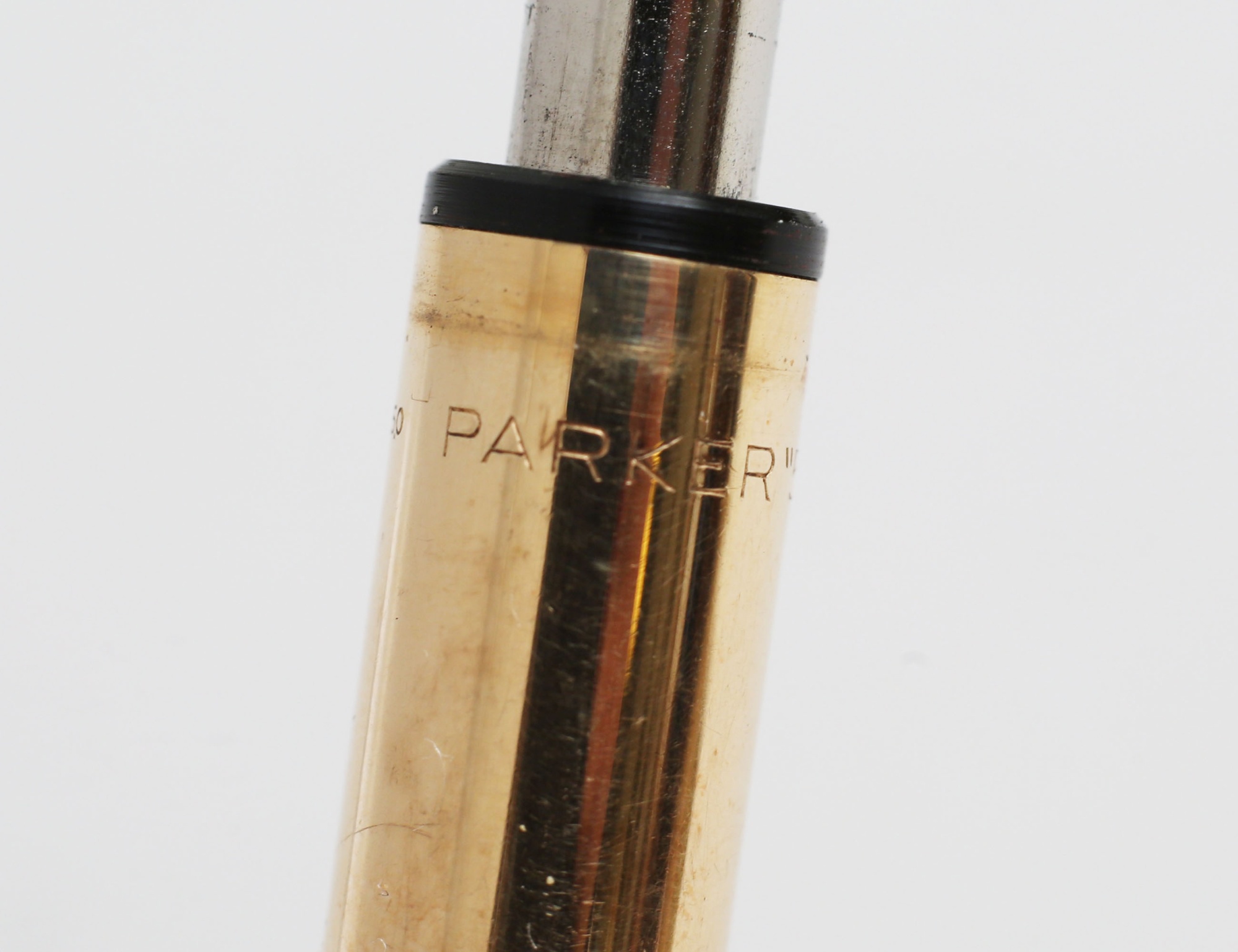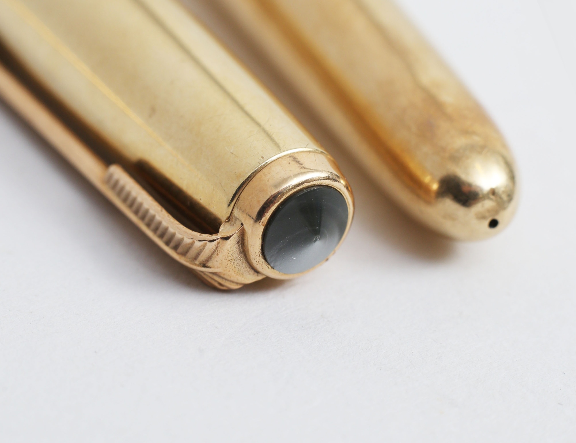 reservoarpenna samt stiftpenna, toppen med fasettslipade grå stenar, stämplade made in USA 50 Parker 14k gold (reservoar med enstaka bucklor, smärre bruksslitage) (2)