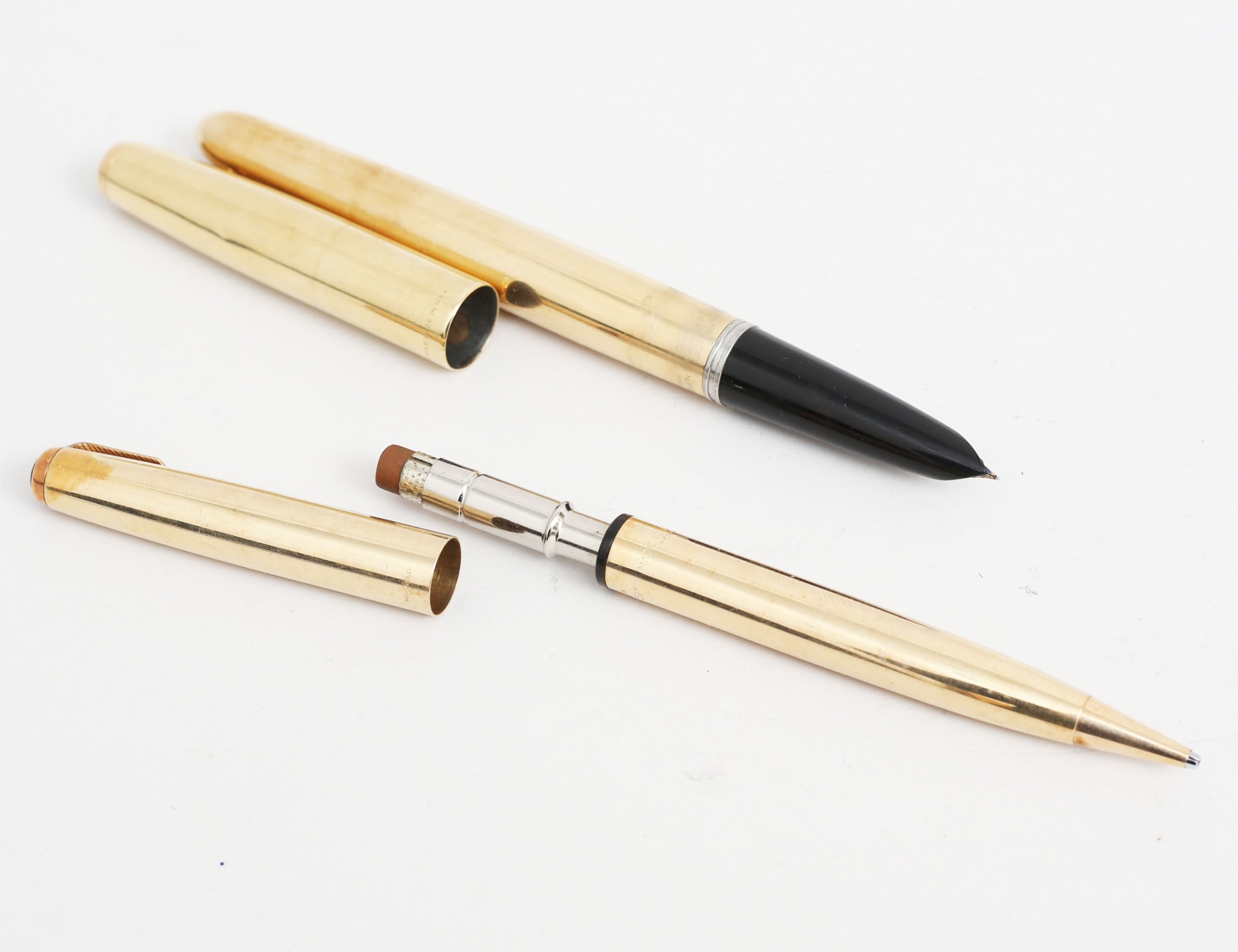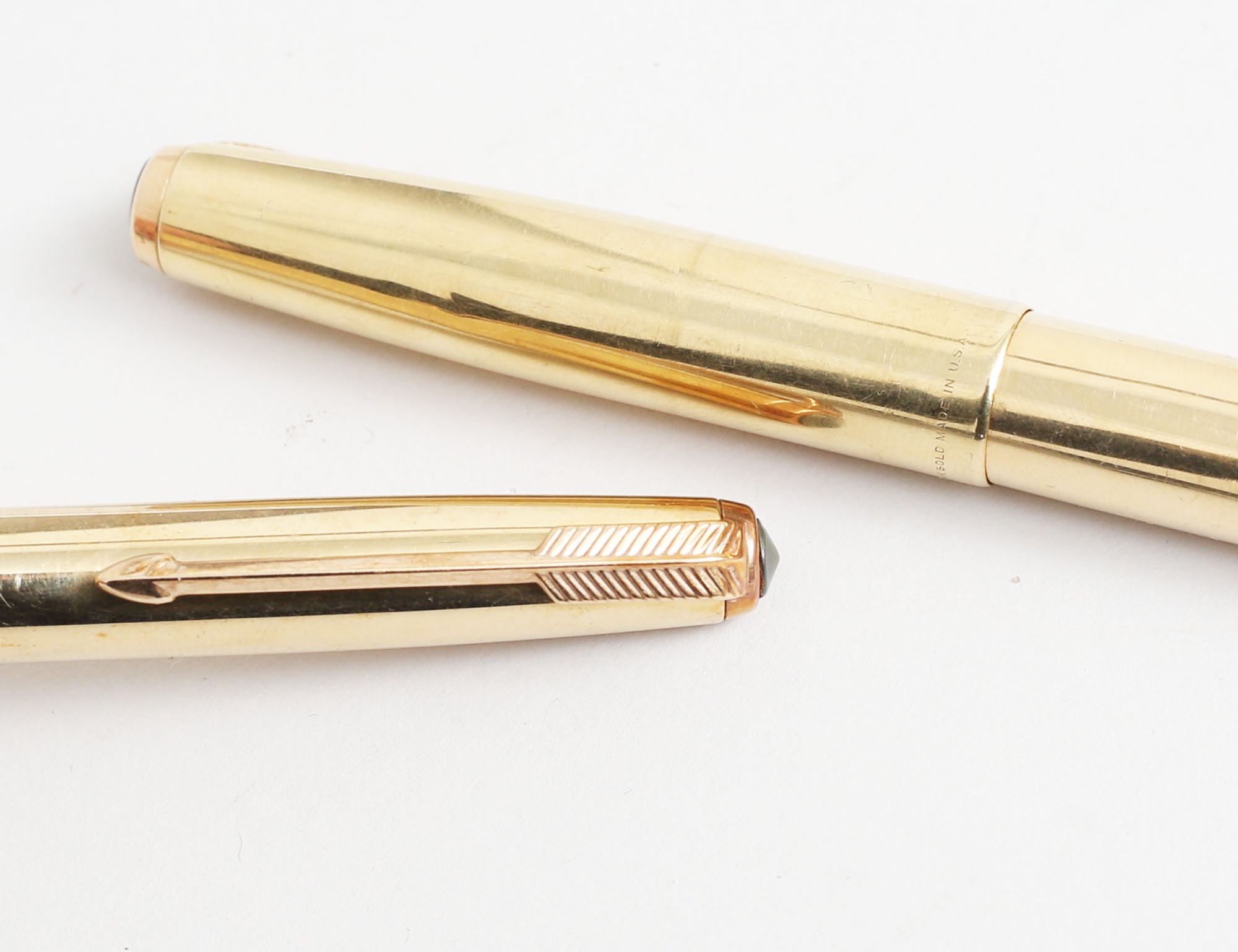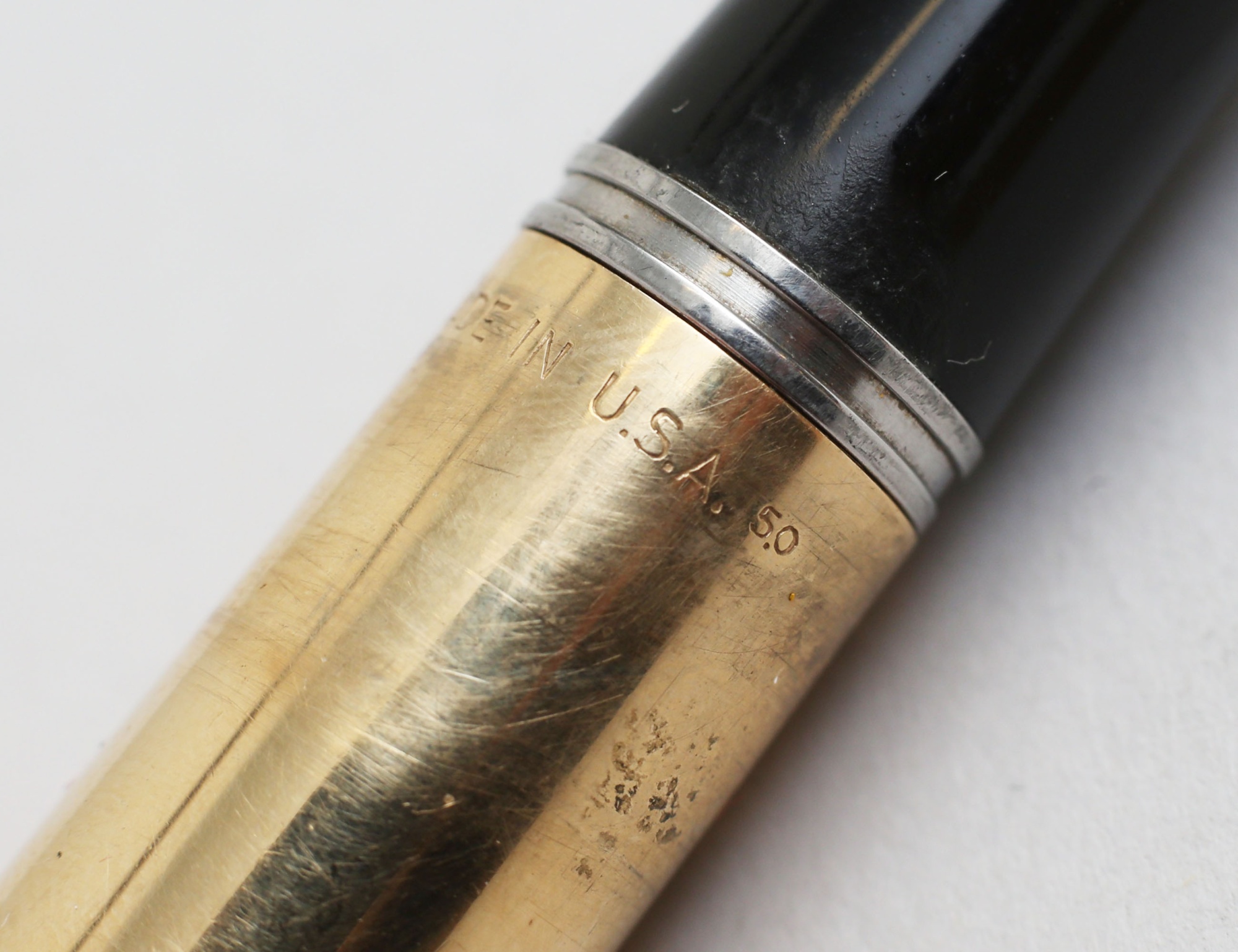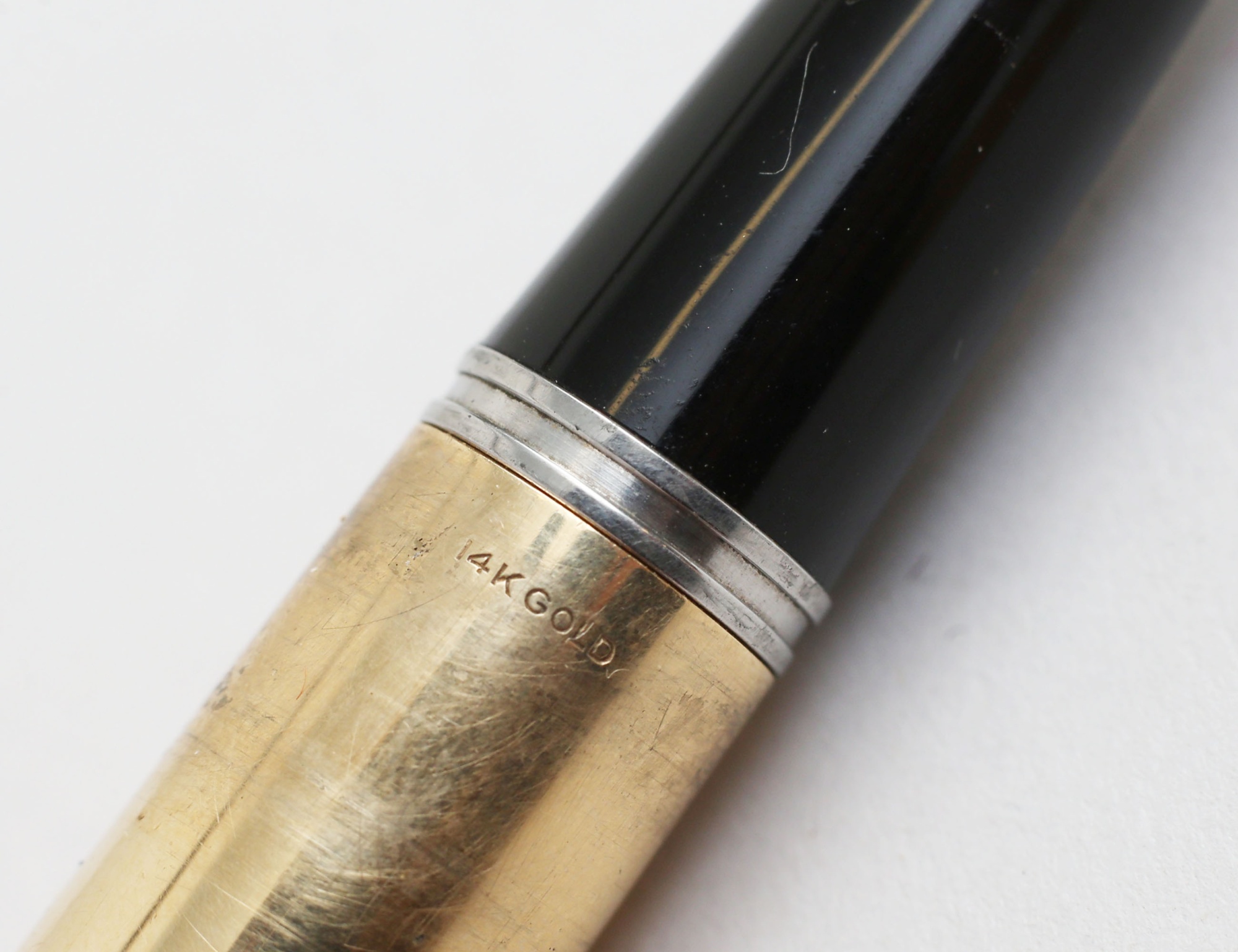 reservoarpenna samt stiftpenna, toppen med fasettslipade grå stenar, stämplade made in USA 50 Parker 14k gold (reservoar med enstaka bucklor, smärre bruksslitage) (2)