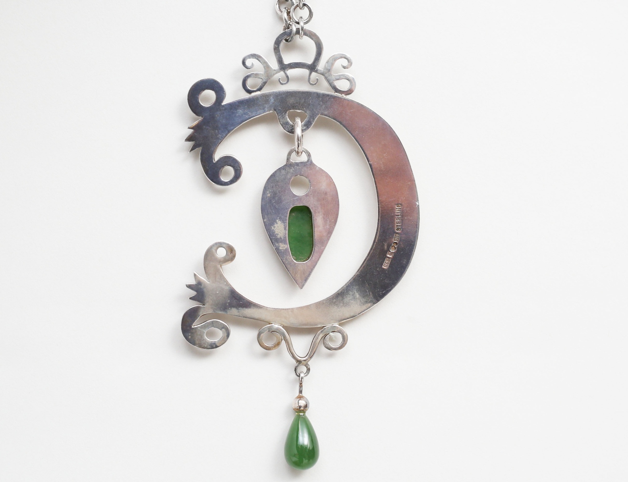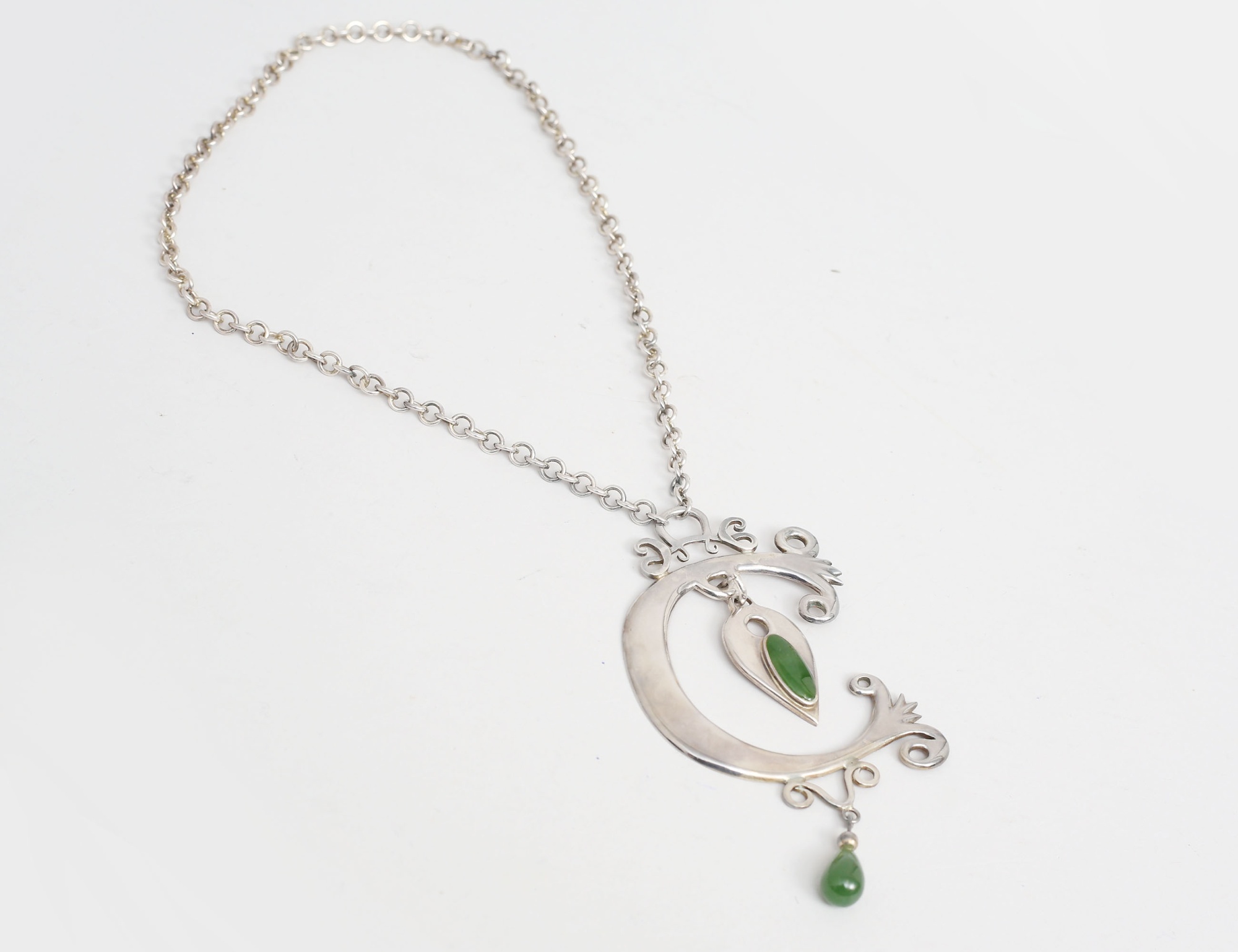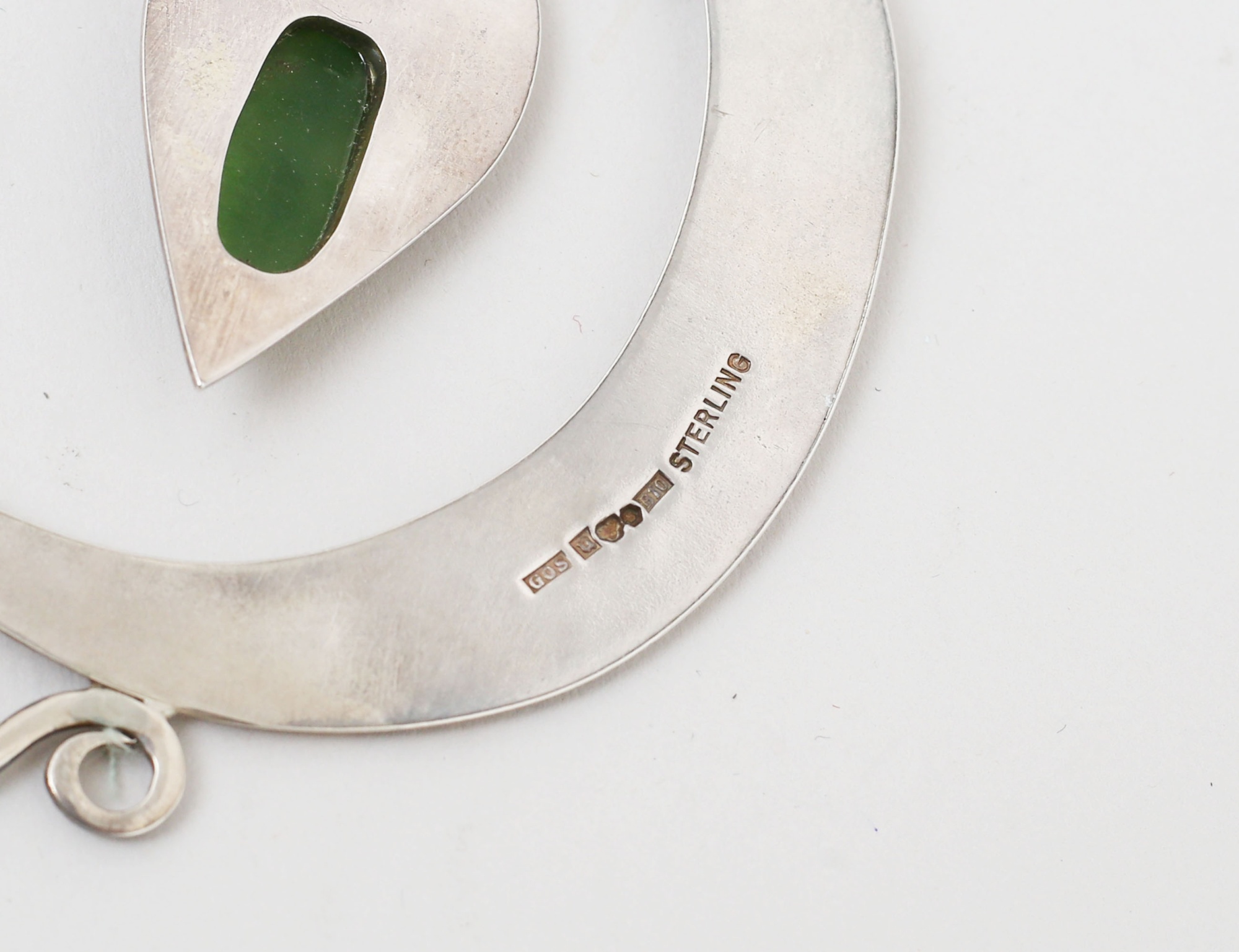 halscollier med hänge sterlingsilver, 1976, hänget med kläppar och gröna stenar, kedjans längd 50, hänget 12x6