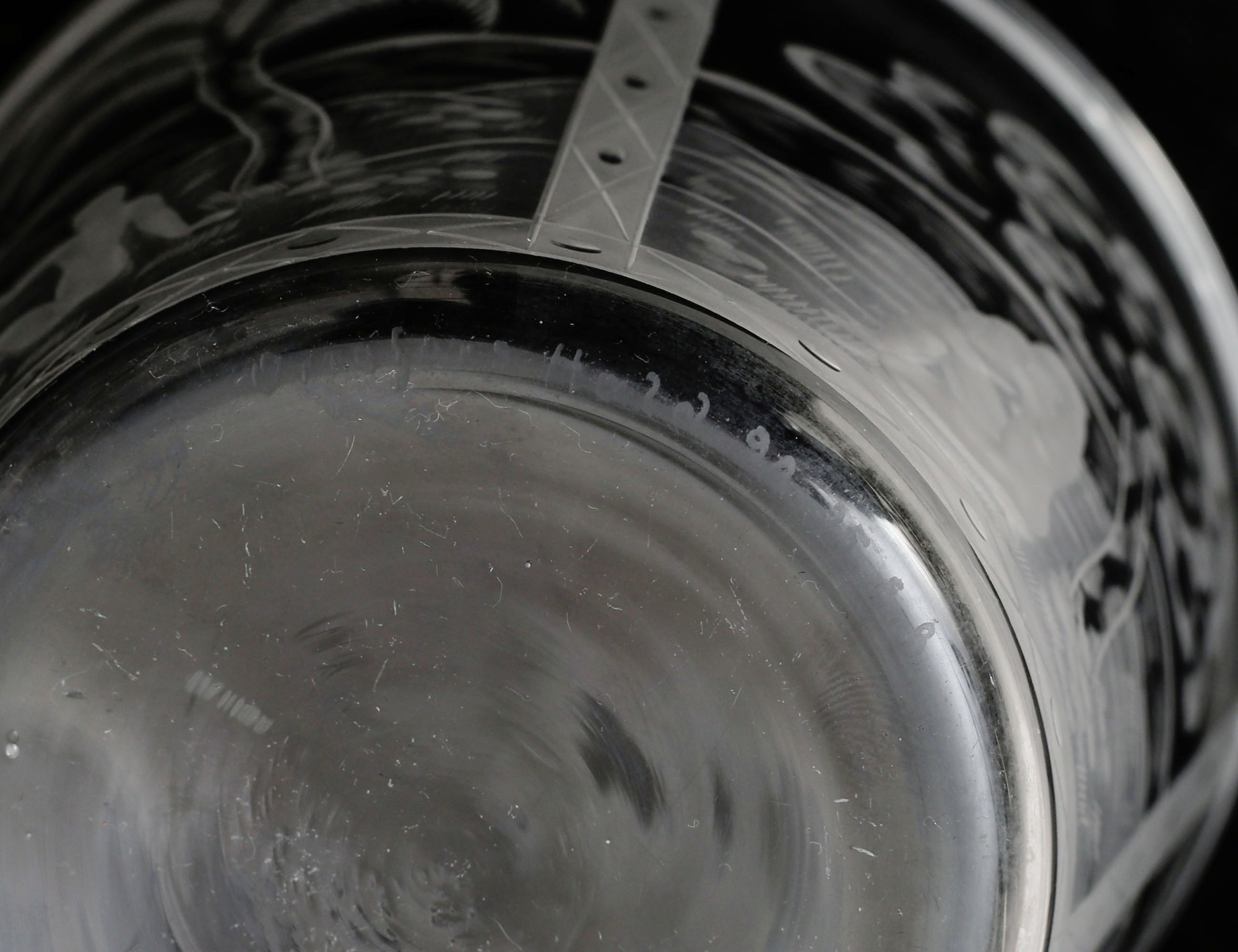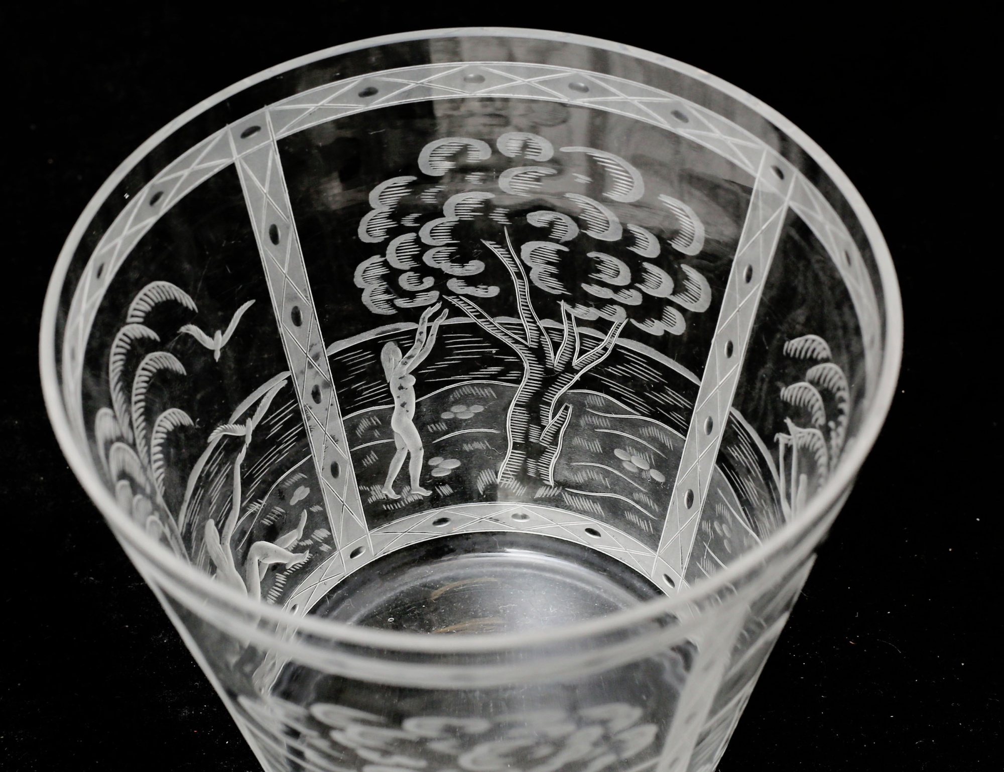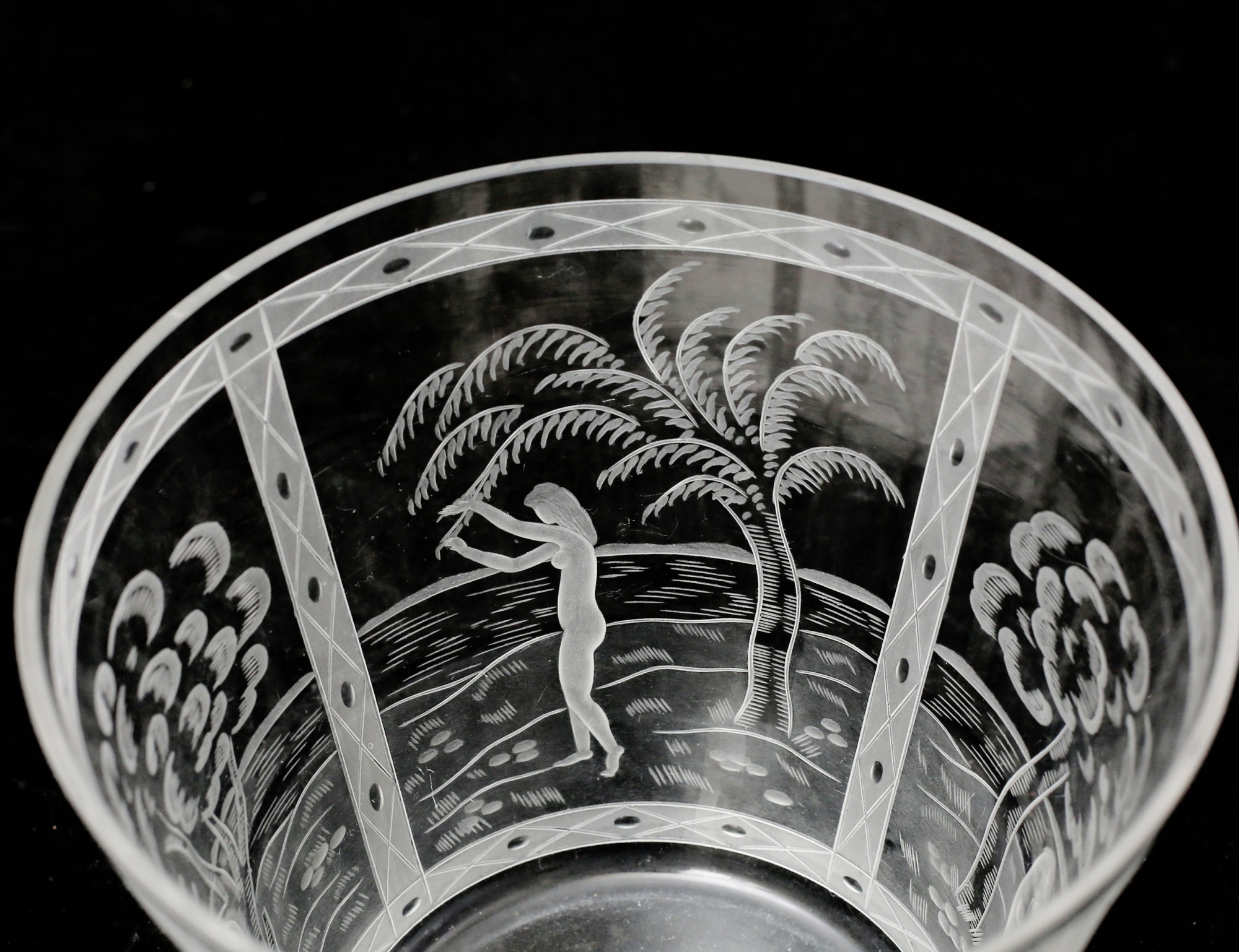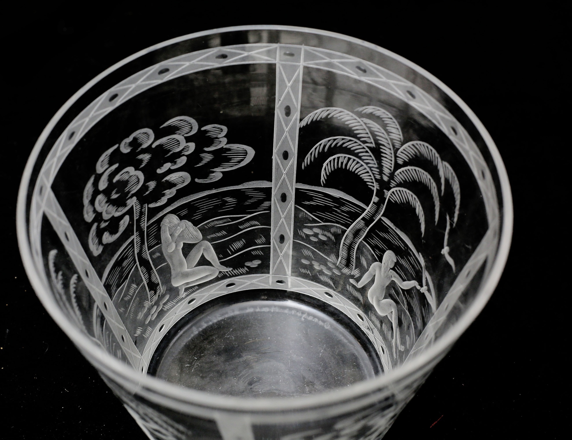 slipad och etsad dekor av nakna kvinnor bland palmer och träd, signerad Orrefors Hald 90.25. ES (gravör Elis Ryd)