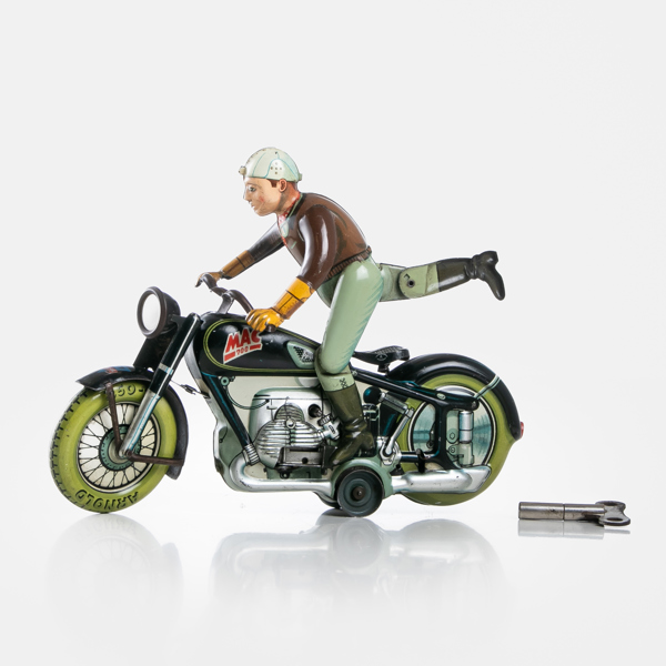 LEKSAKSMOTORCYKEL "MAC 700", Tyskland, litograferad plåt, 1950-tal, tillverkades i den amerikanska zonen i Tyskland, urverksdriven.