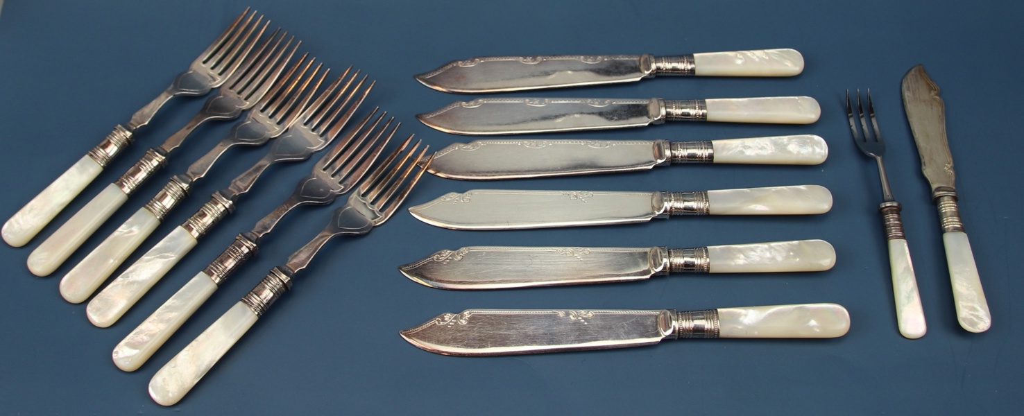 Fiskbestick, 14 delar, nysilver och pärlemo, England, 1900-tal.