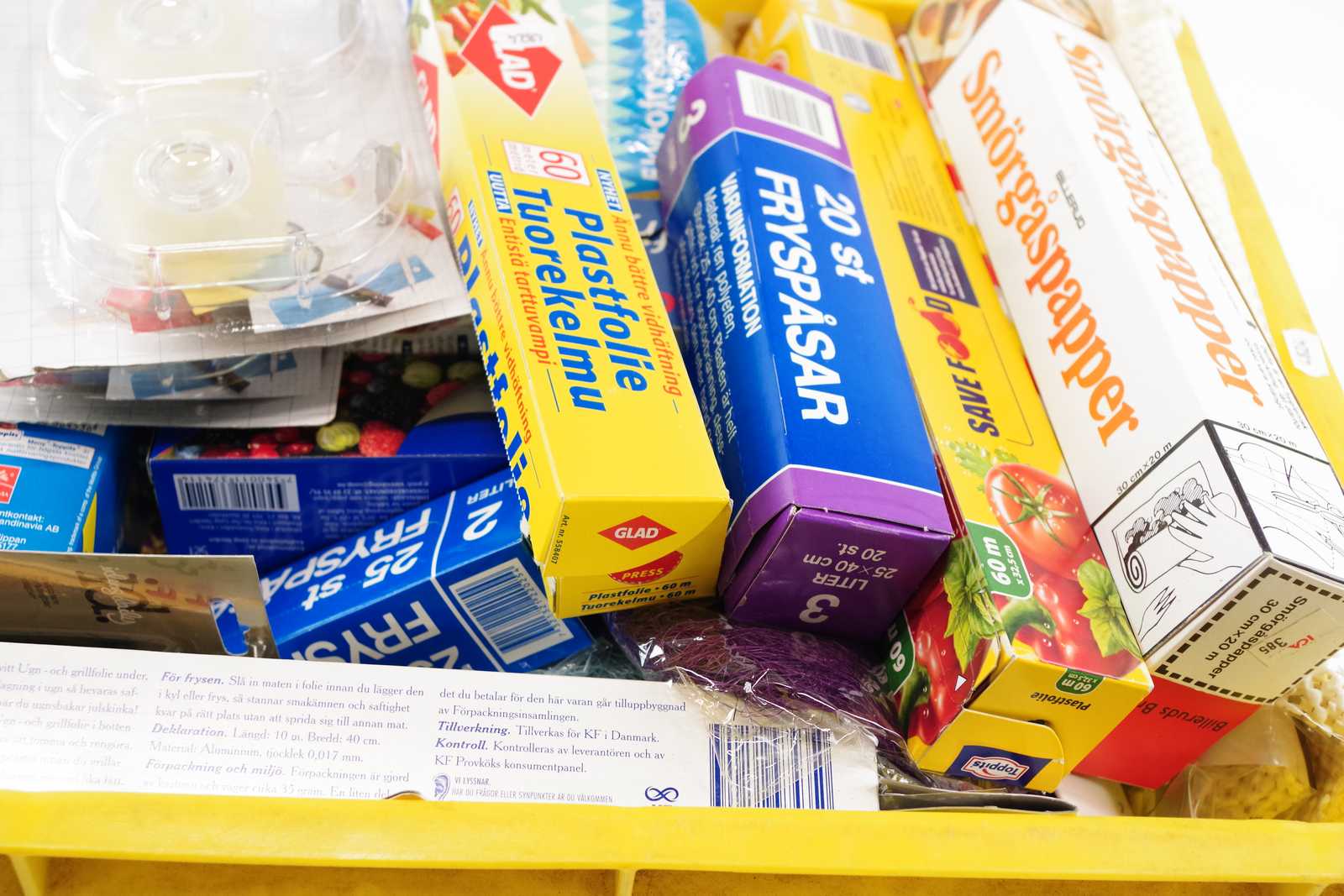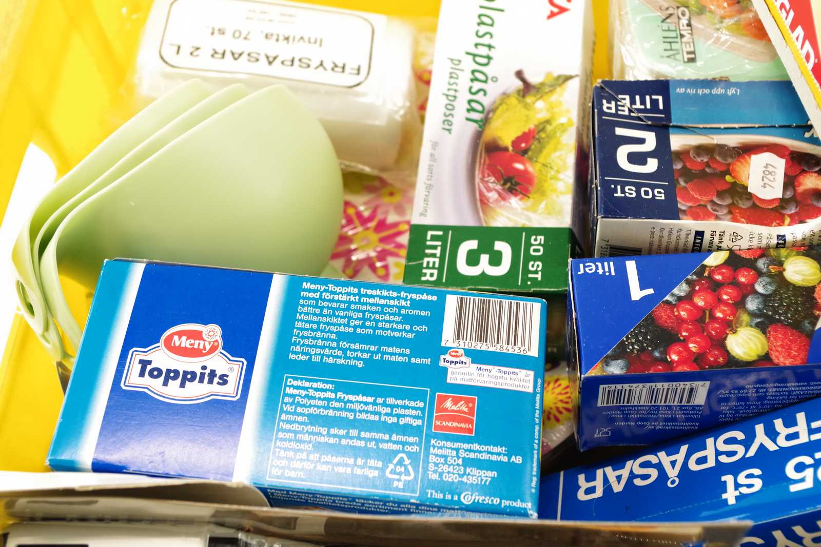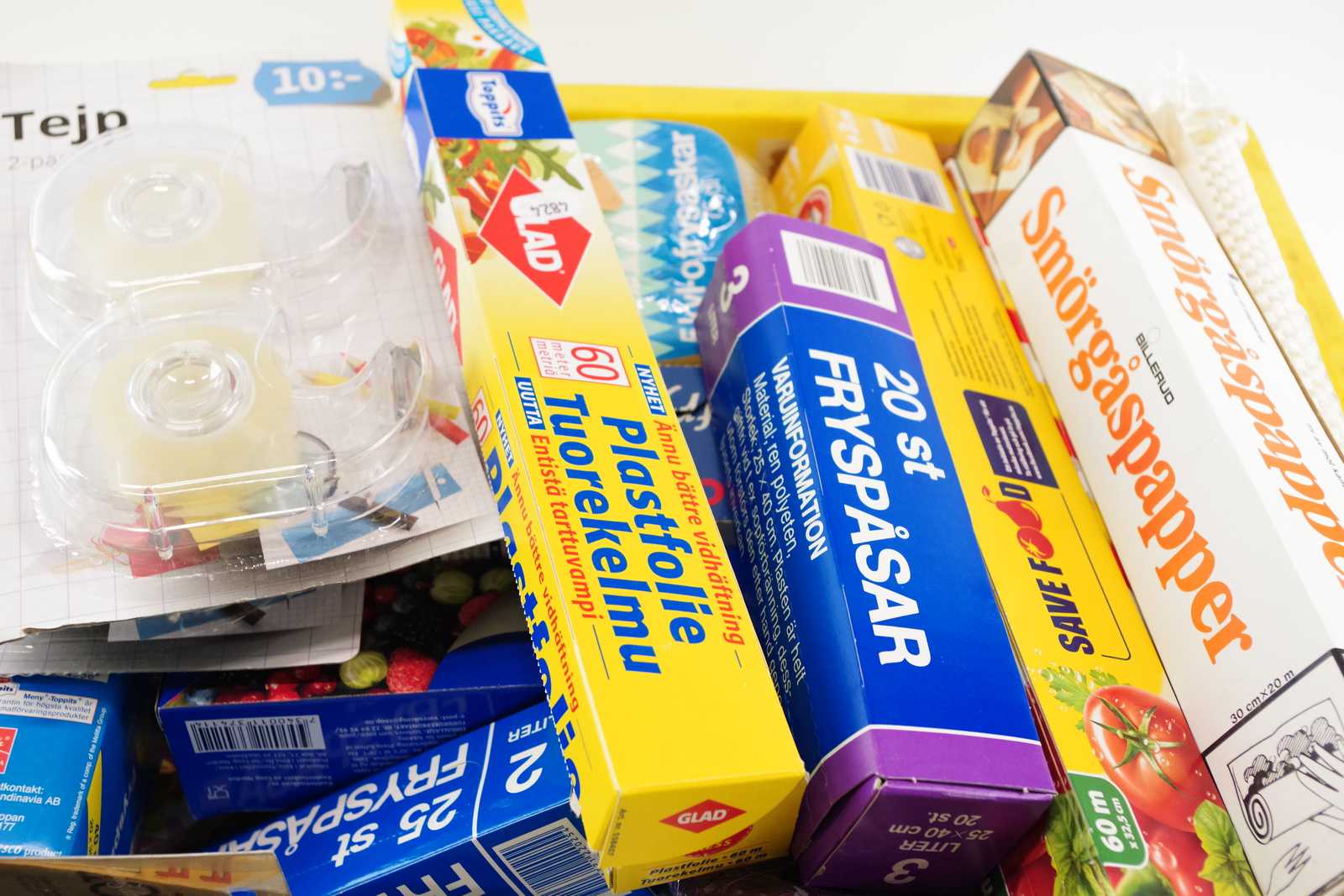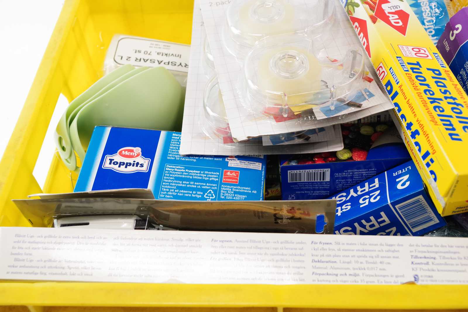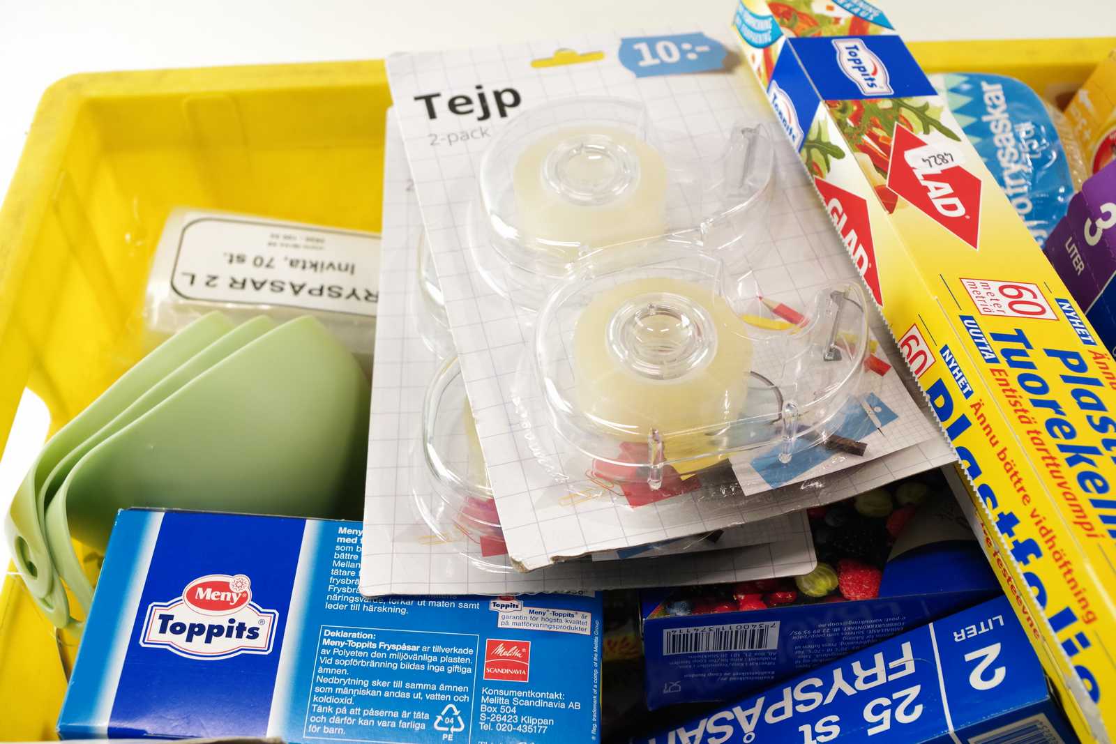Bilder DIVERSE tejp, fryspåsar, trattar, tändare, plastfolie mm
