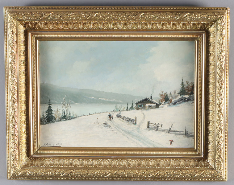 Haakon Kaulum Jenssen: Vinterlandskap, olje på plate. 27x38 cm.