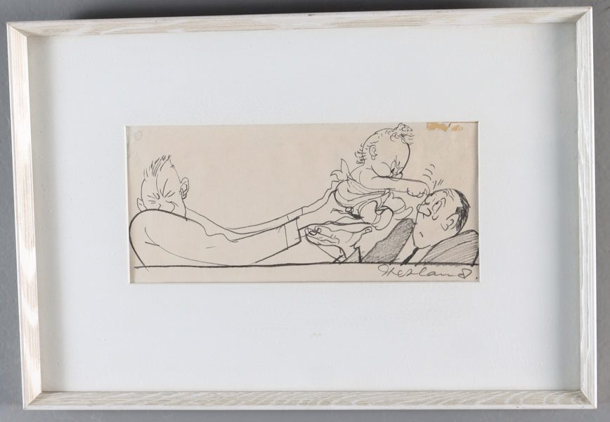 Audun Hetland: Menn med baby, tegning. 11x24,5 cm., et rift.