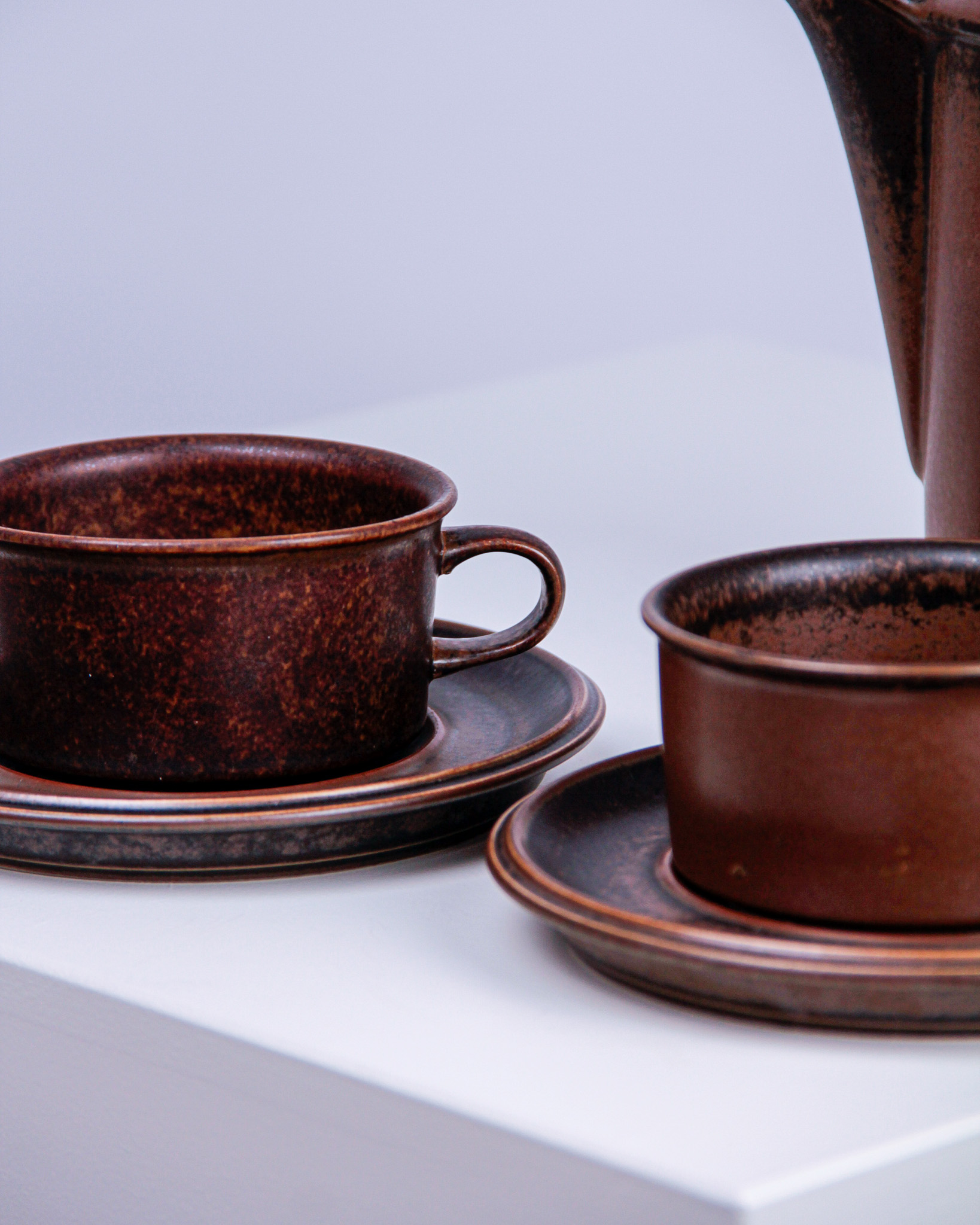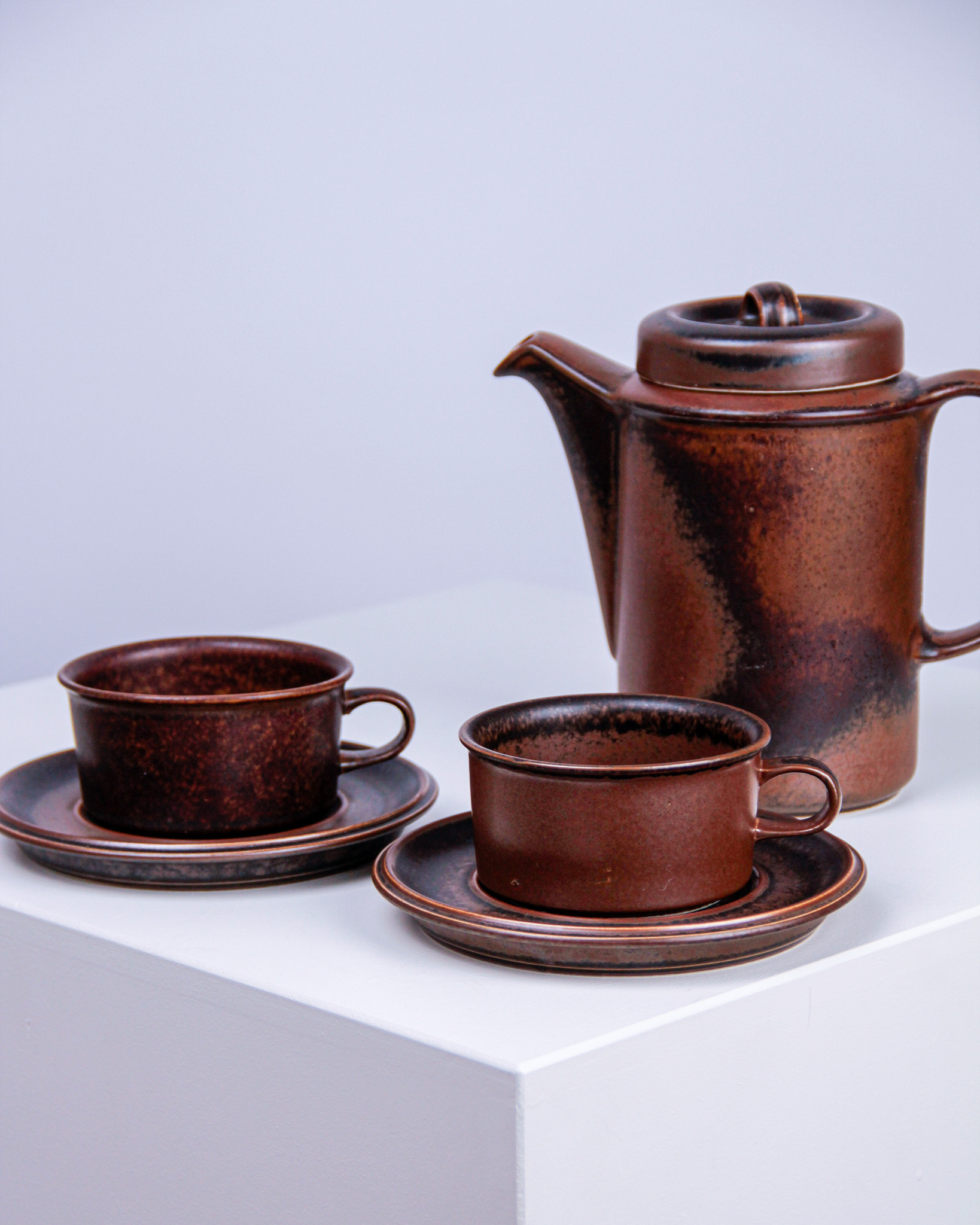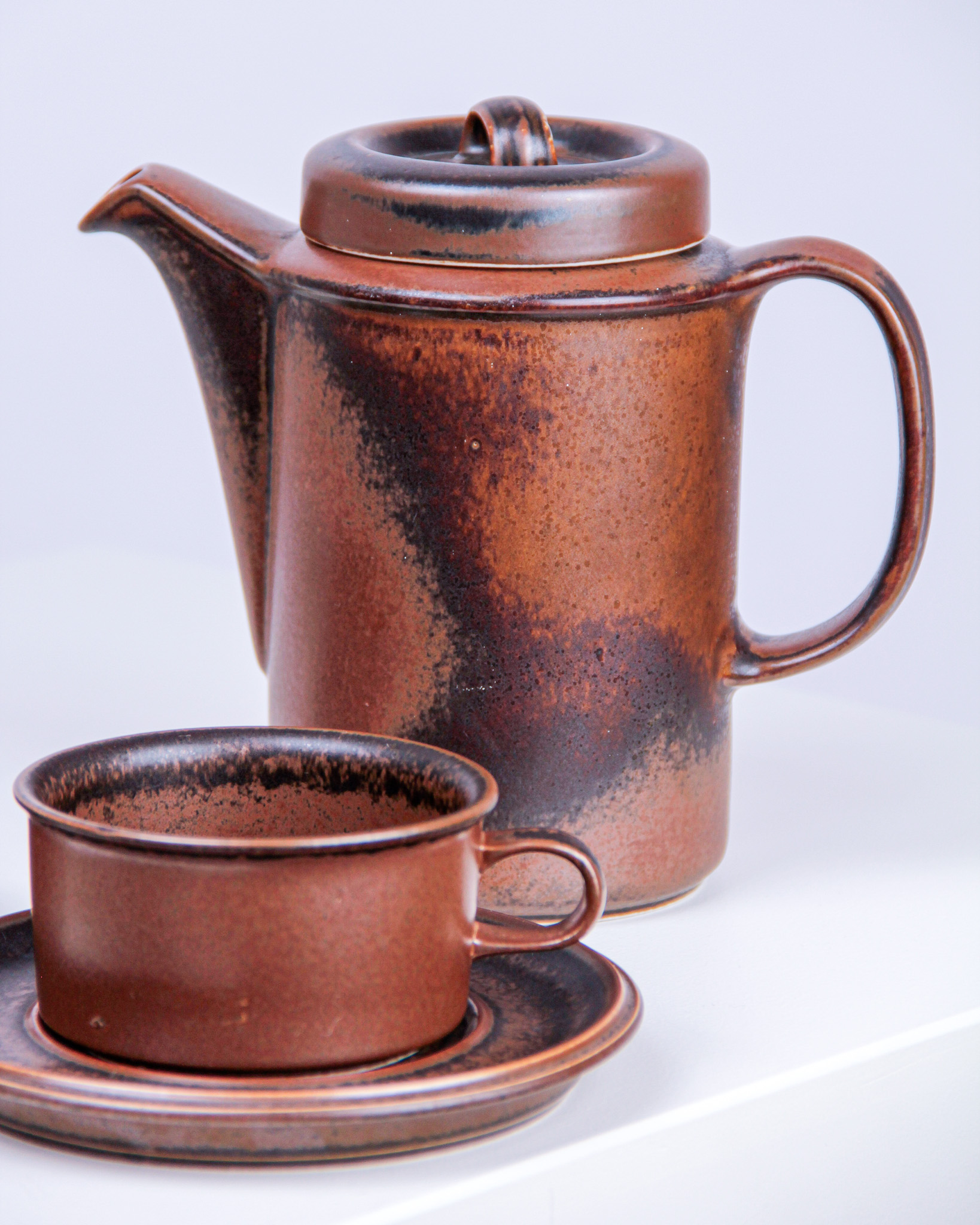 Auktioner Keramik & Porslin Tekanna och koppar med fat, 3 delar, "Ruska", Ulla Procopé, Arabia, Finland (Det dukade bordet)
