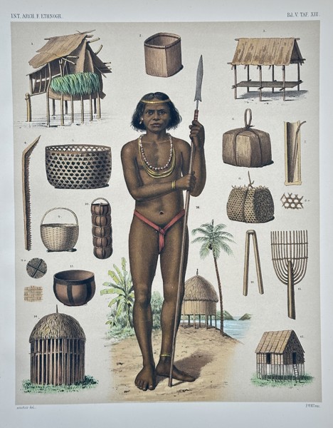 This chromolithograph documents the material culture of an indigenous group, centering on an adult man standing on a sandy ground near tropical vegetation, holding a spear and wearing a headdress and necklaces. The central figure is surrounded by meticulously numbered illustrations of daily-life objects, including thatched dwellings, various forms of woven baskets and containers, and large-tined farming tools. This visual record was created for the Internationales Archiv für Ethnographie, a journal dedicated to the study and documentation of global ethnology in the late 19th century.