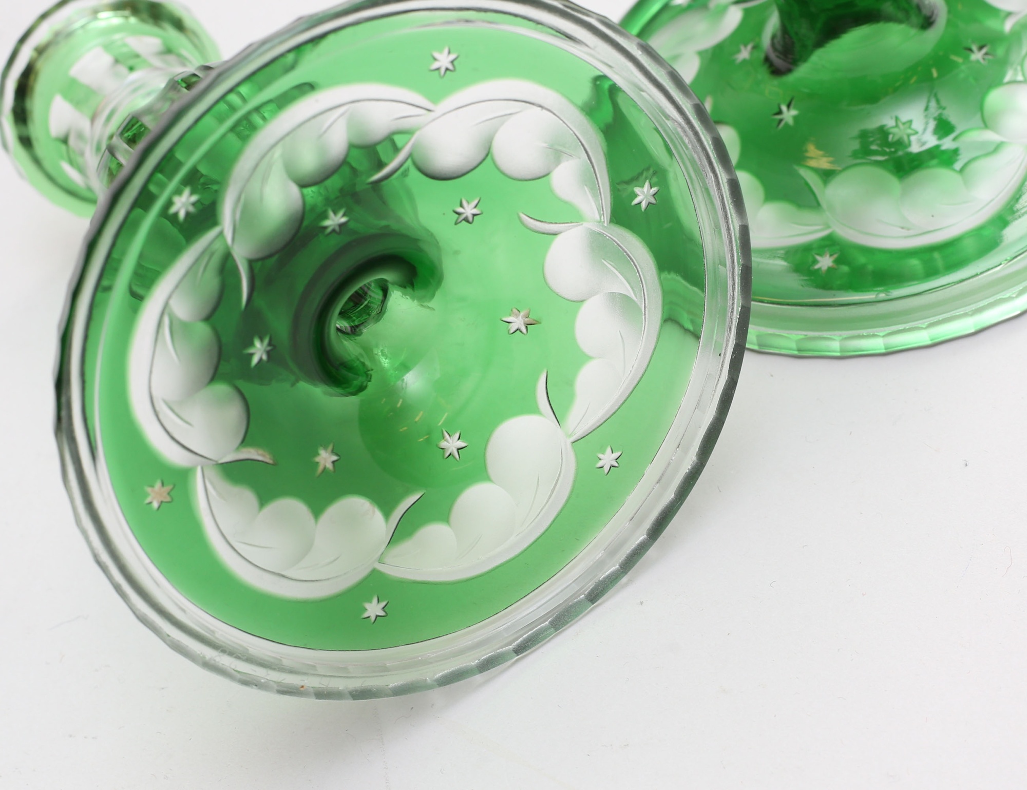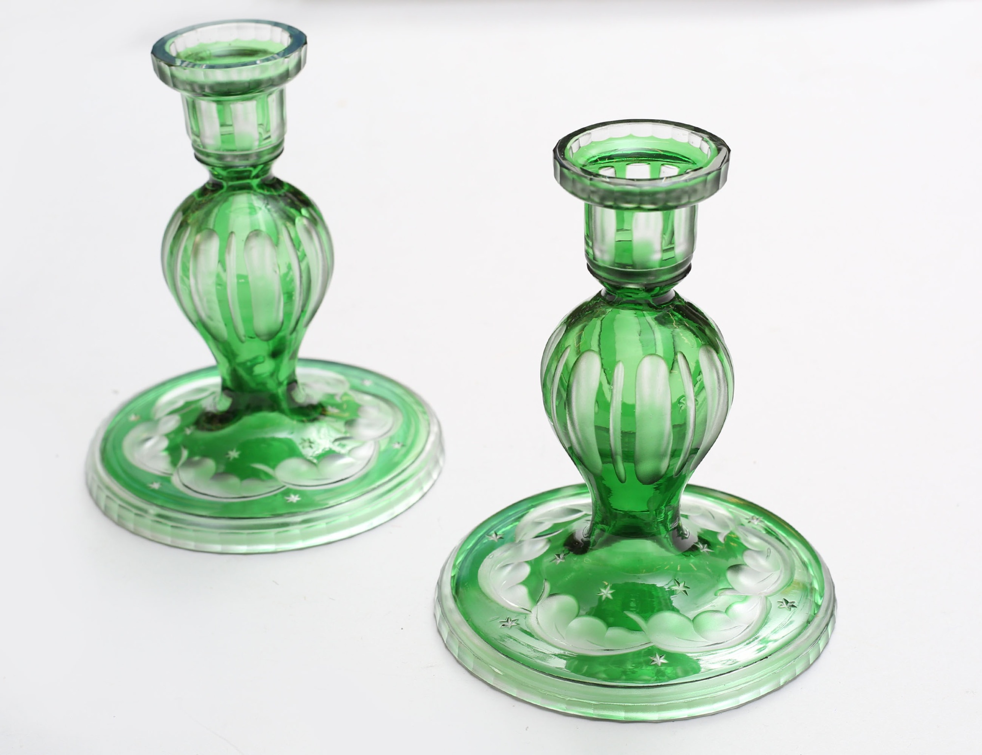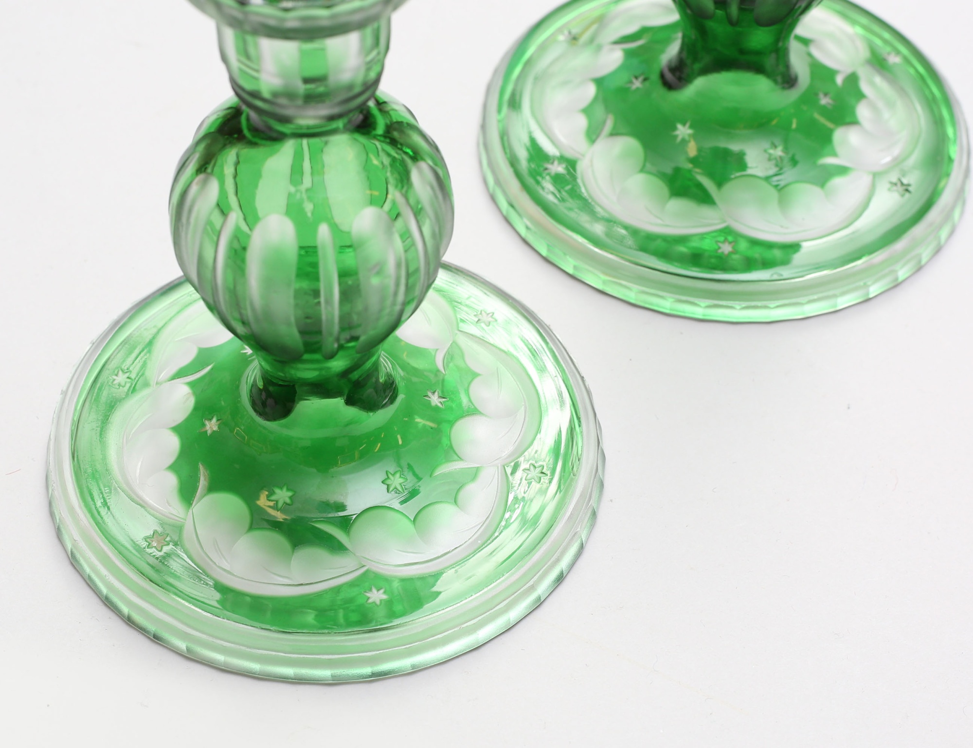 1 par ljusstakar, modell HF13, grönt överfångsglas, slipad dekor med stjärnor och molnformationer, referens: "Kärlek till glas" Agnes Hellgrens samling av Orreforsglas katalognr 13, signerade OF HF13, 28 höjd 14,5