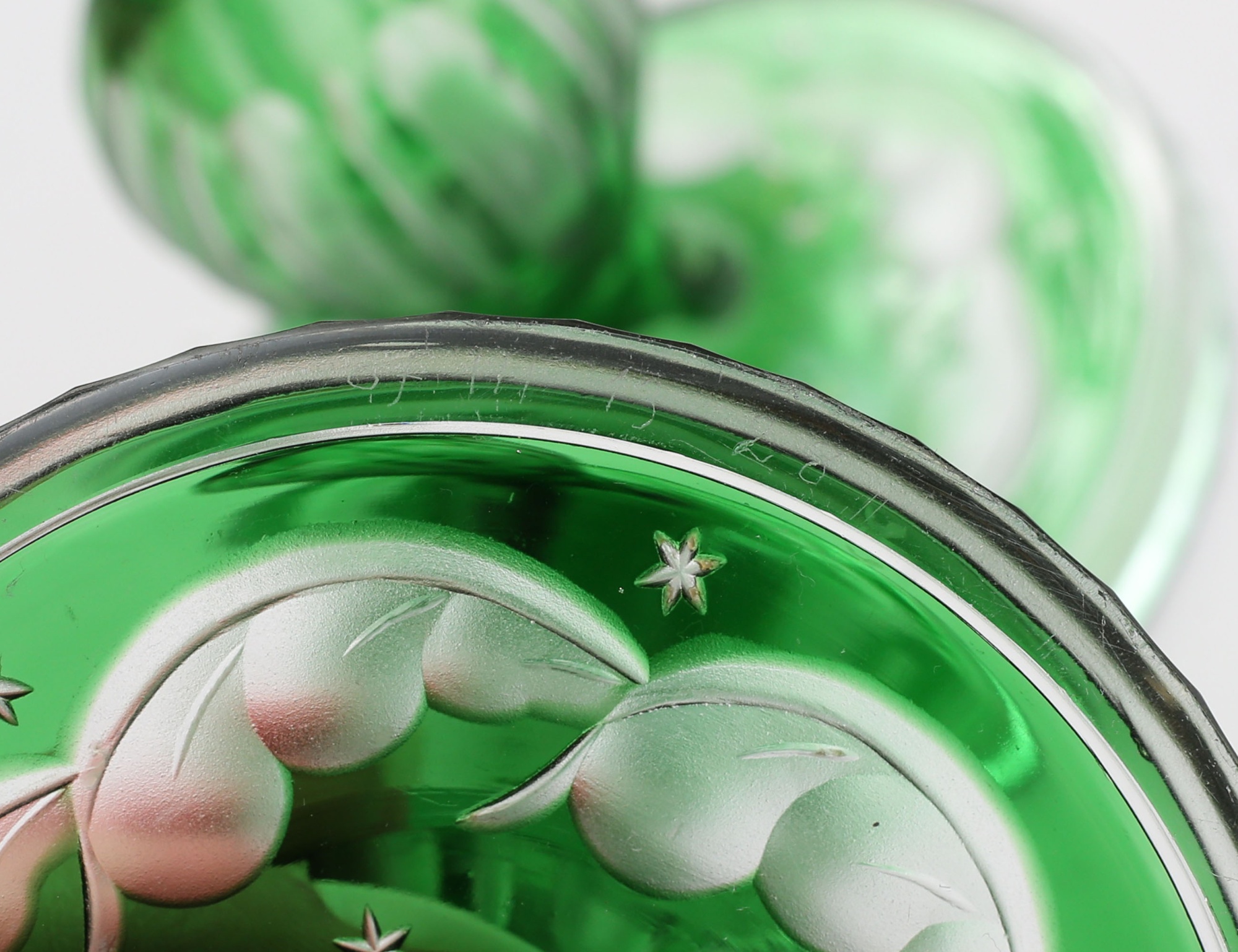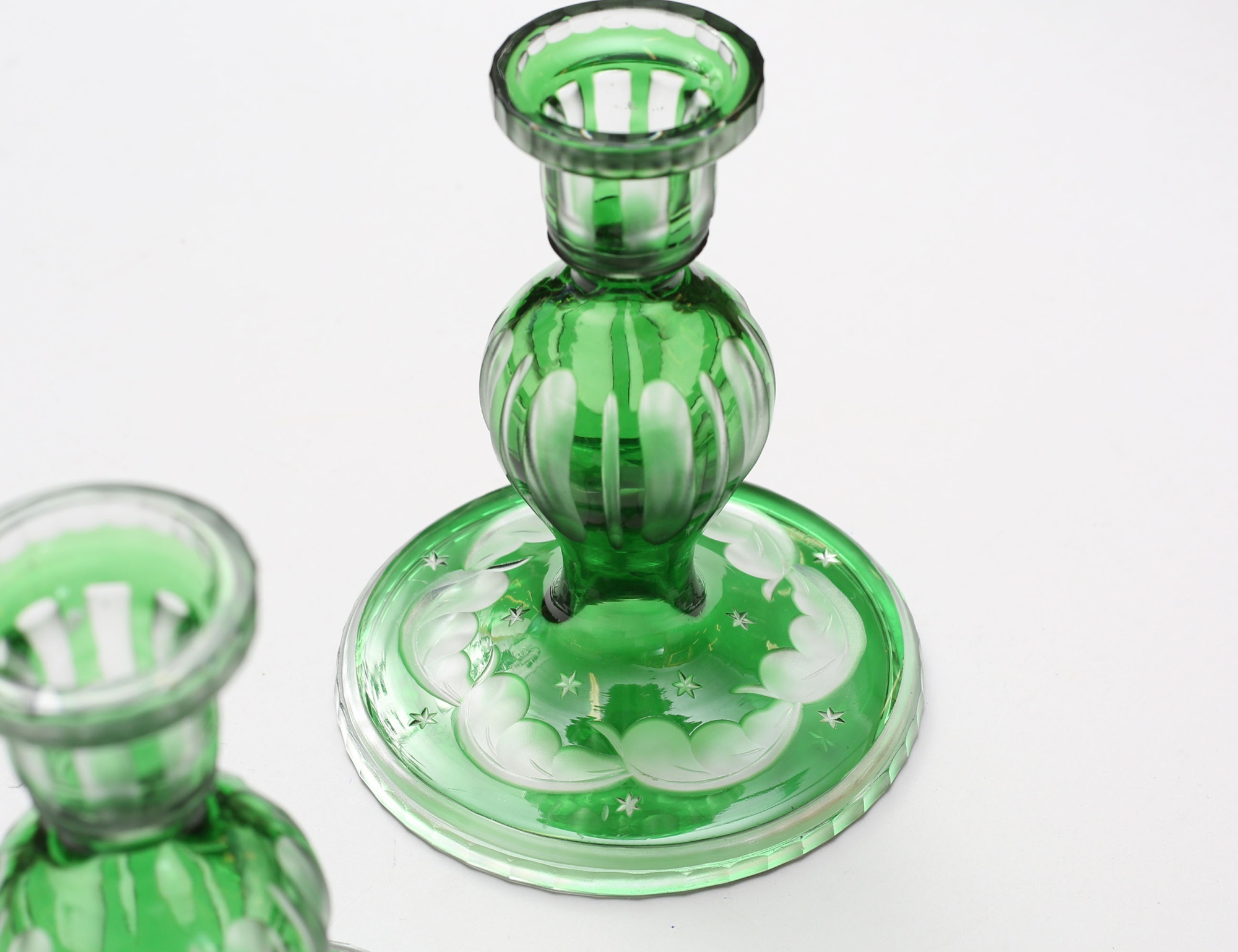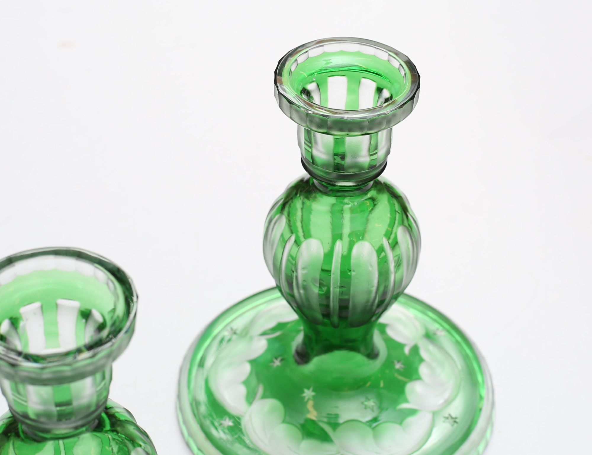 1 par ljusstakar, modell HF13, grönt överfångsglas, slipad dekor med stjärnor och molnformationer, referens: "Kärlek till glas" Agnes Hellgrens samling av Orreforsglas katalognr 13, signerade OF HF13, 28 höjd 14,5