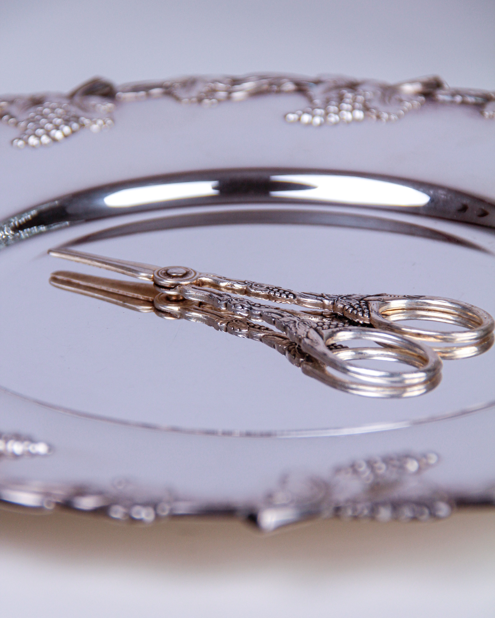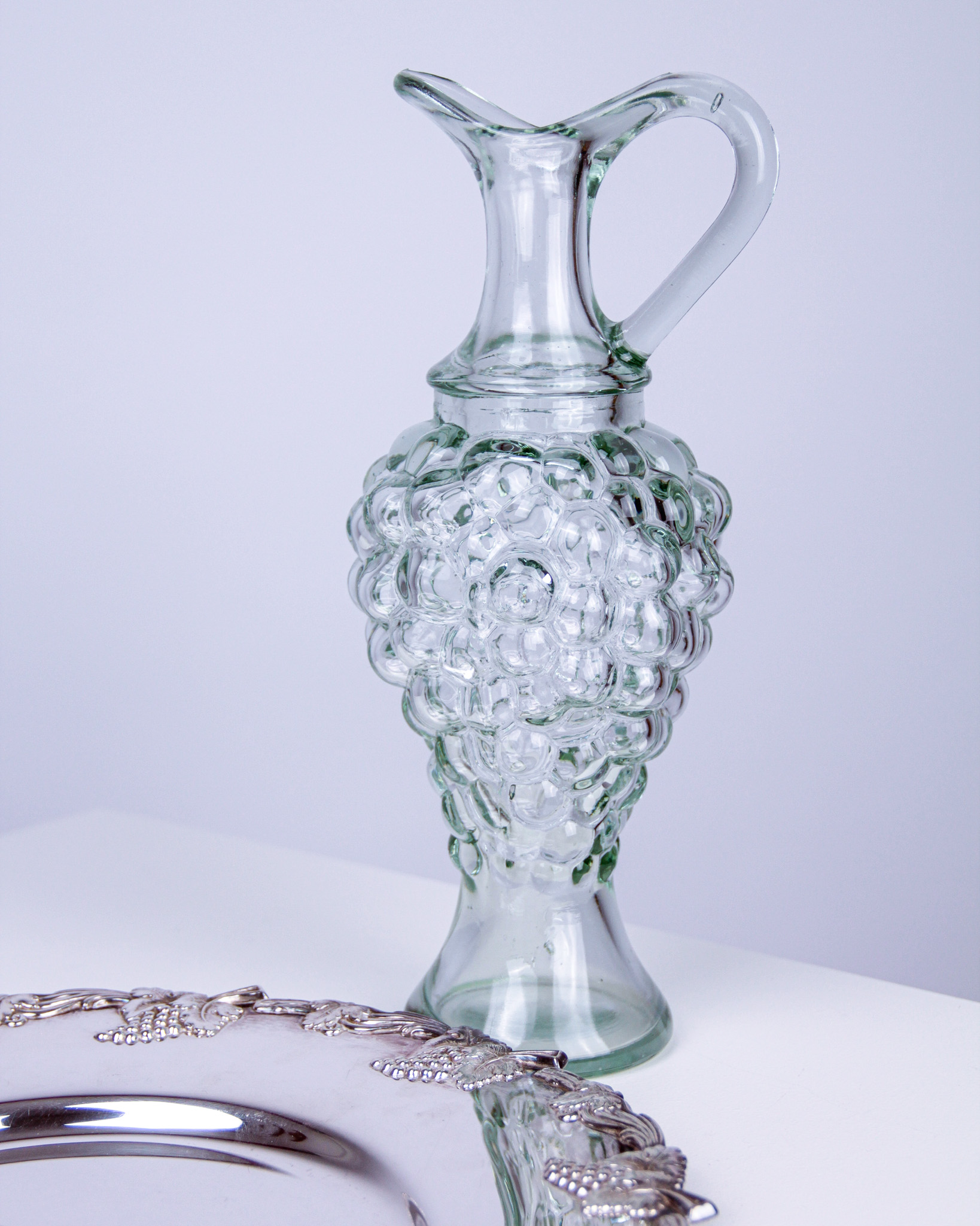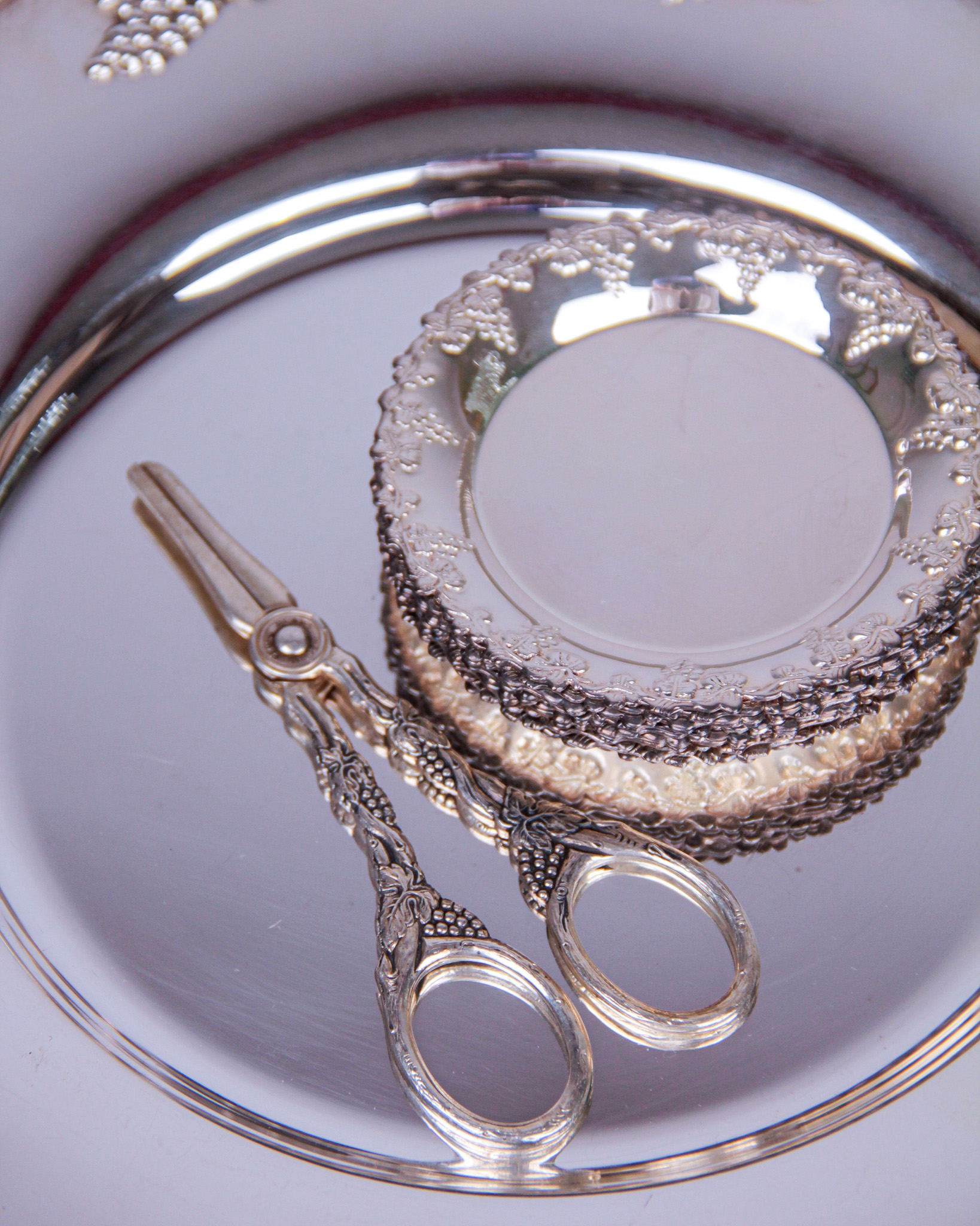 Kanna, fat, glasunderlägg och druvsax, druvmotiv, nysilver och glas (Det dukade bordet)