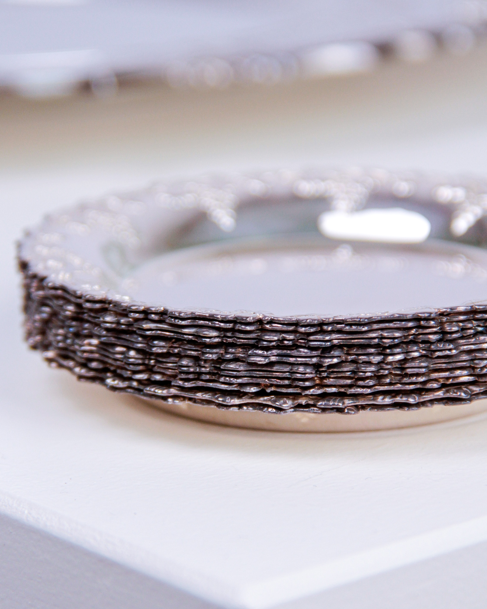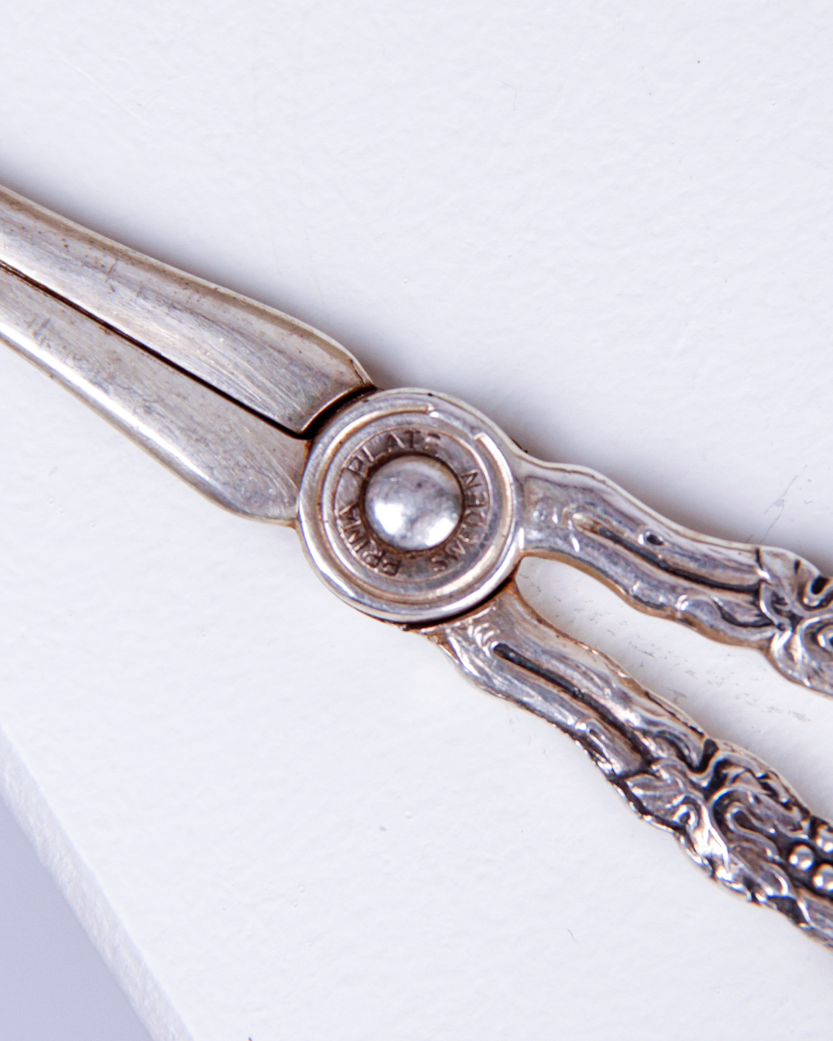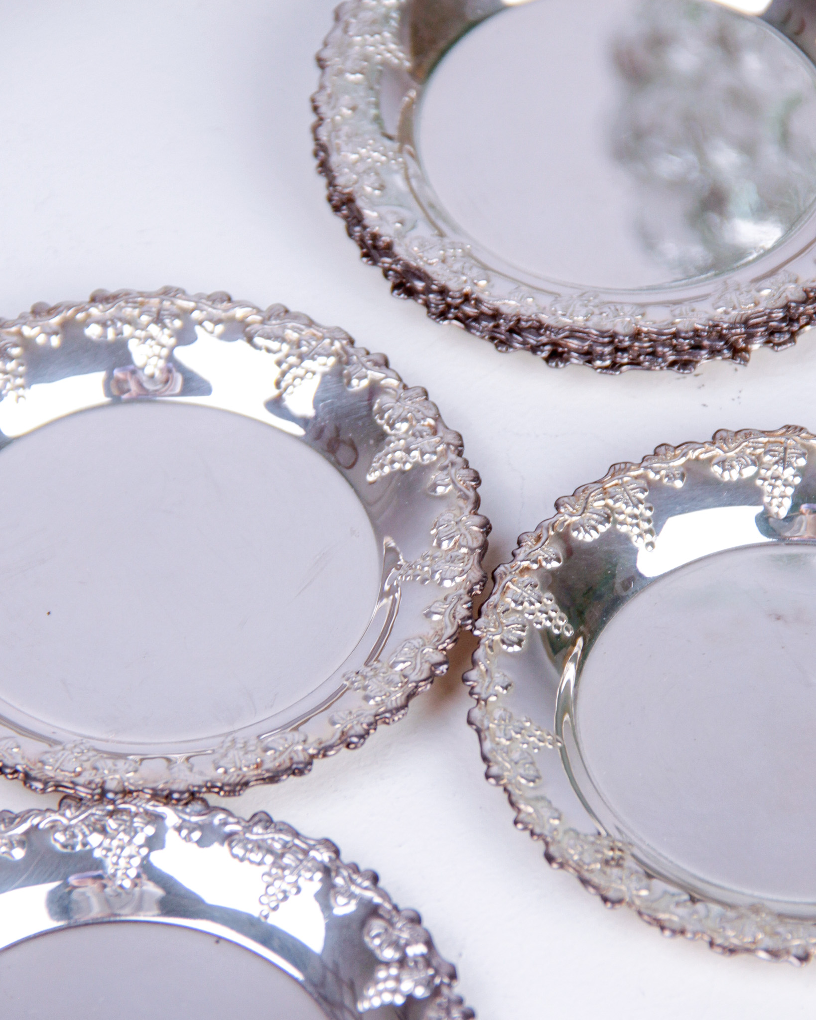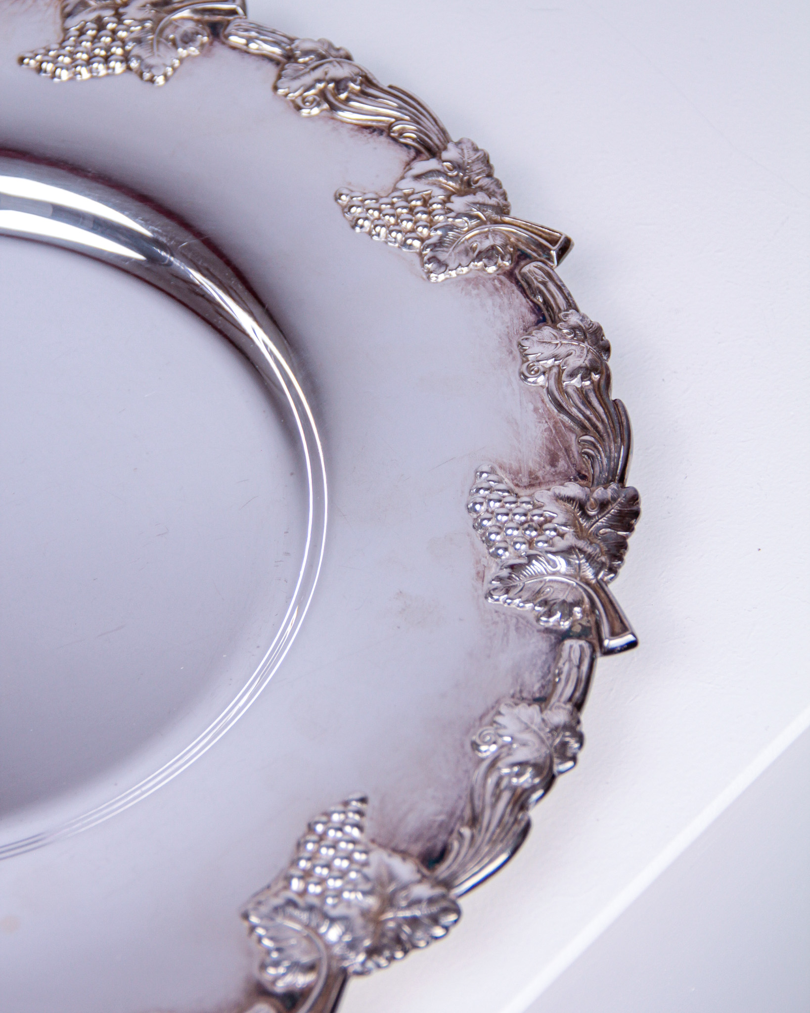 Kanna, fat, glasunderlägg och druvsax, druvmotiv, nysilver och glas (Det dukade bordet)