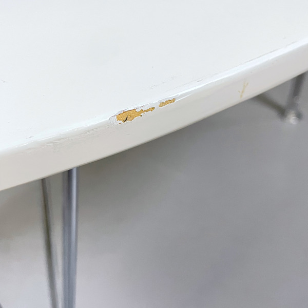 "Superellips", matbord/soffbord, vitlackerad bordsskiva, förkromade spännben, etikettmärkt. Formgiven av Bruno Mathsson och Piet Hein.