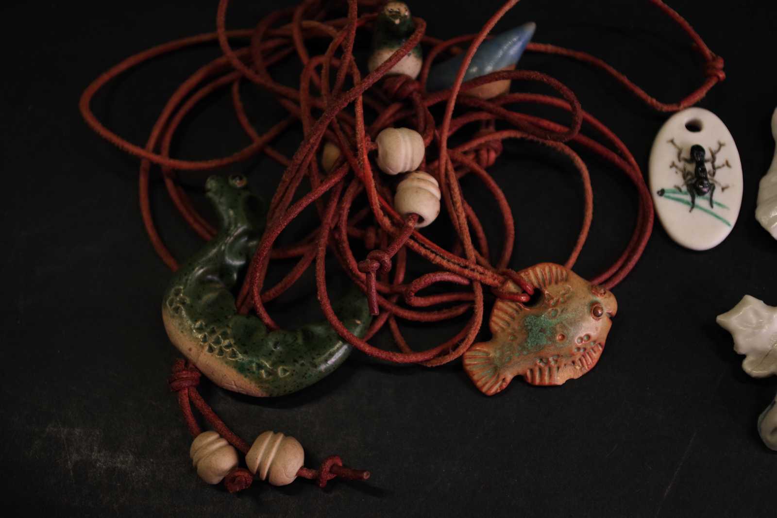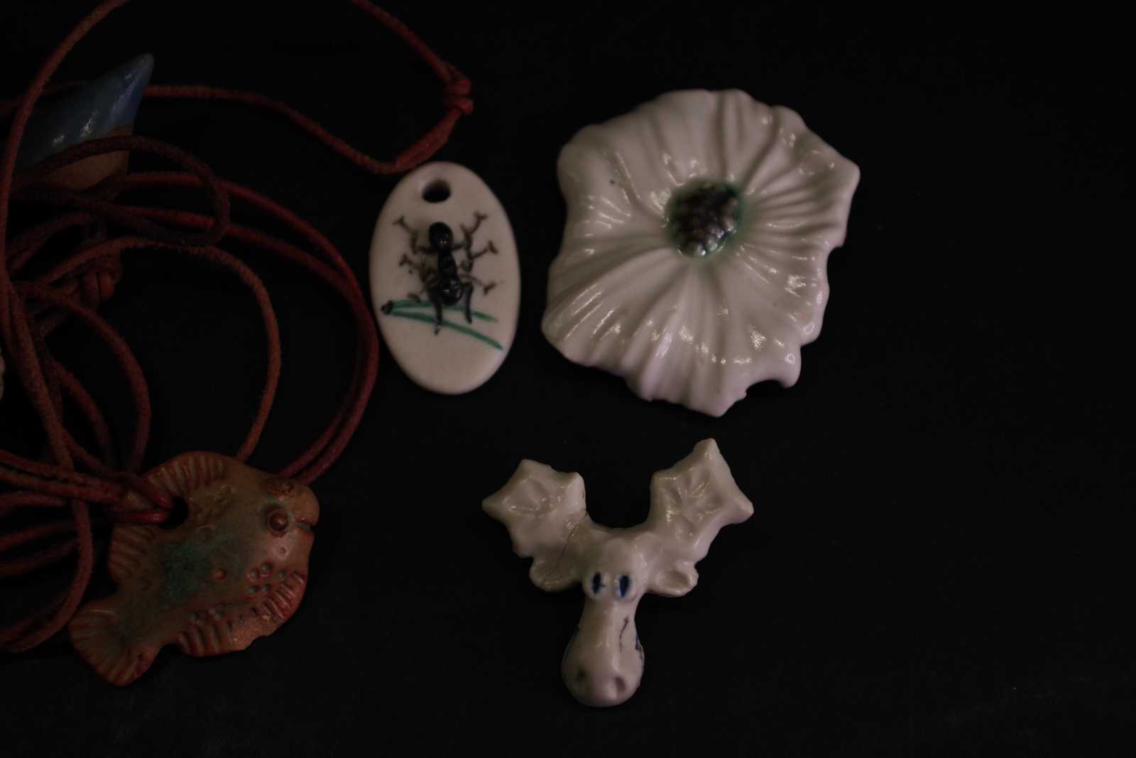 HÄNGE, BROSCHER & HALSBAND keramik signerade AS (älgbrosch limmad)