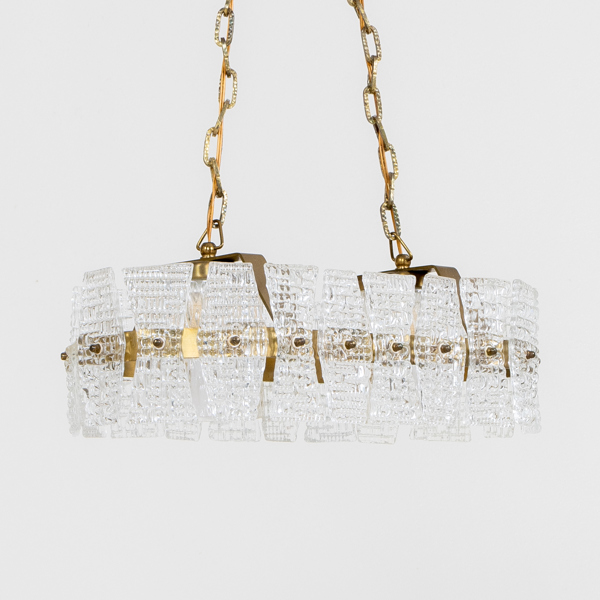 Stomme av mässing, plattor av glas med reliefdekor, två ljuspunkter, höjd exkl kedjor 15, 47 x 21 cm
