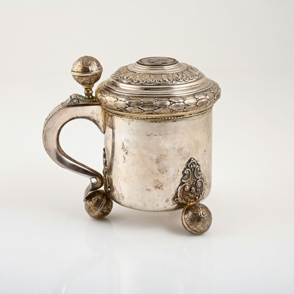 CG Hallberg, Stockholm, 1936, lock med infällt mynt Gustaf V, invändigt förgylld, höjd 17 cm, vikt 575 gram