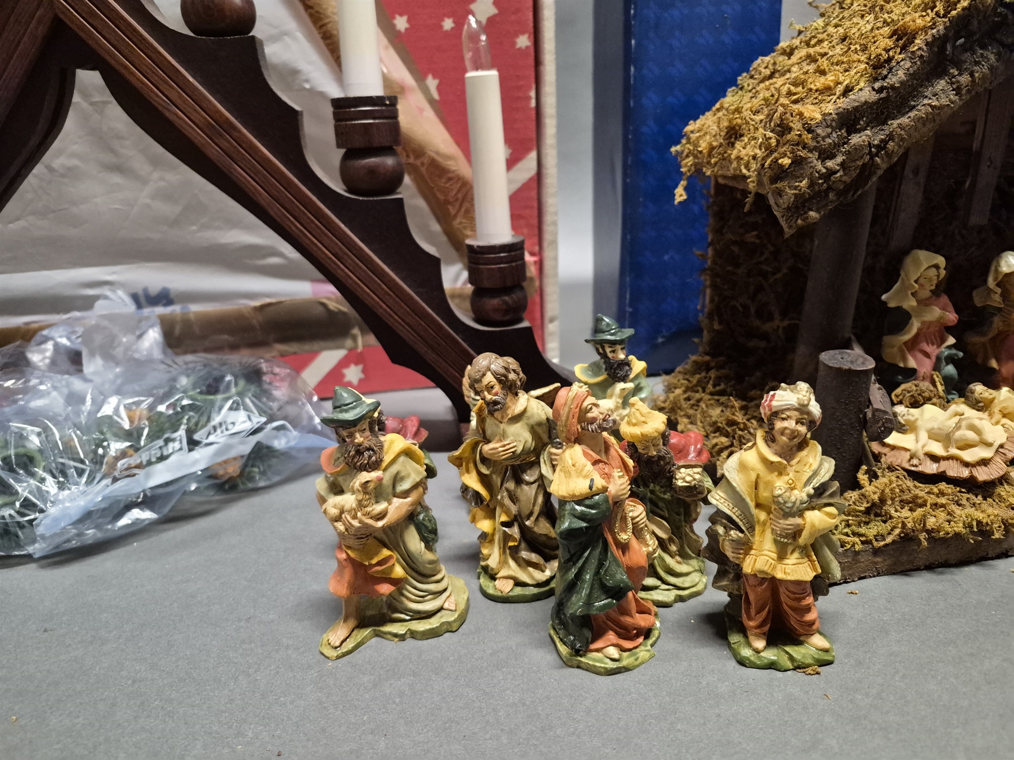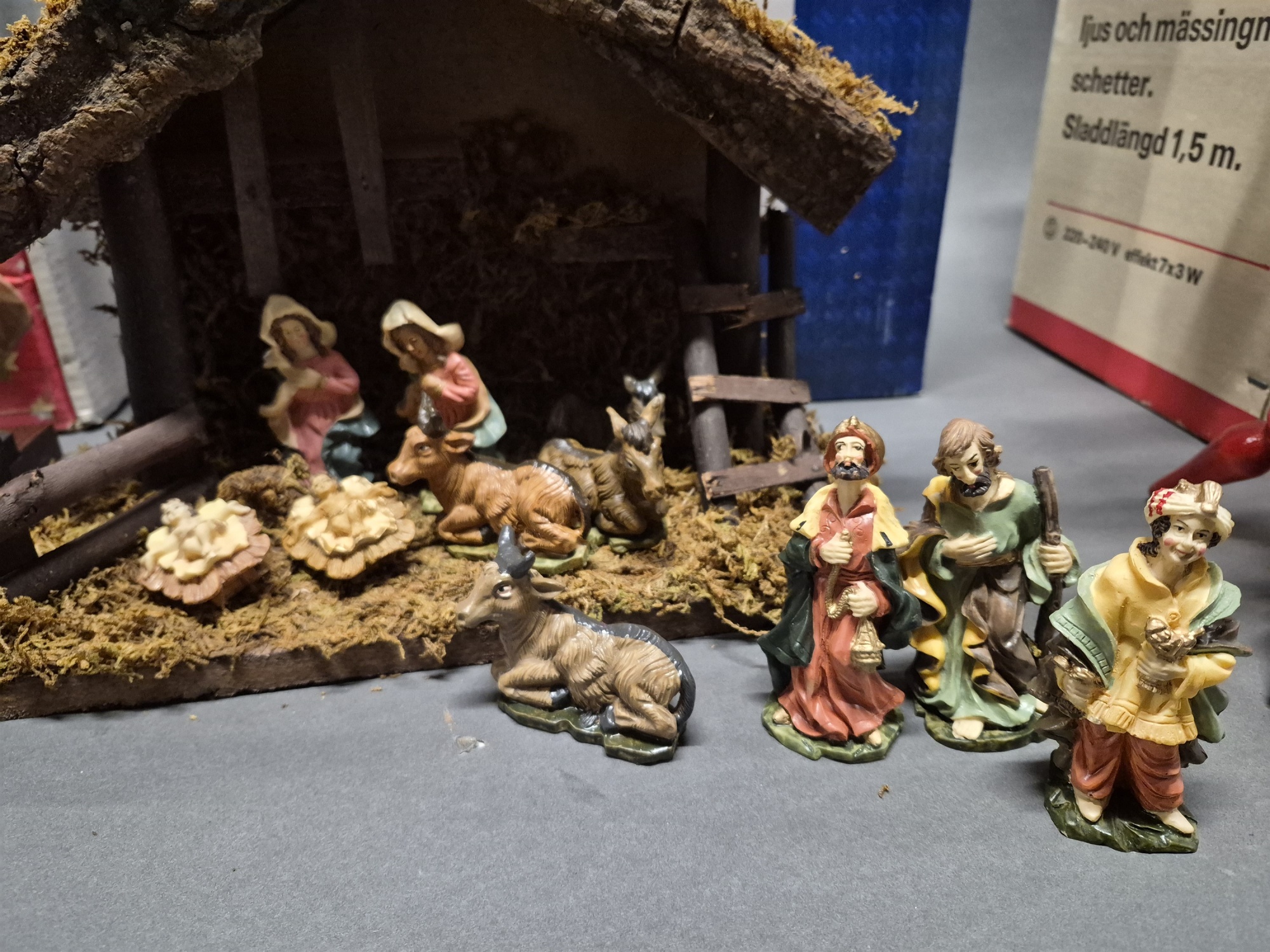 Elljusstakar och julkrubba med figurer, defekta figurer finns, högsta höjd 49 cm