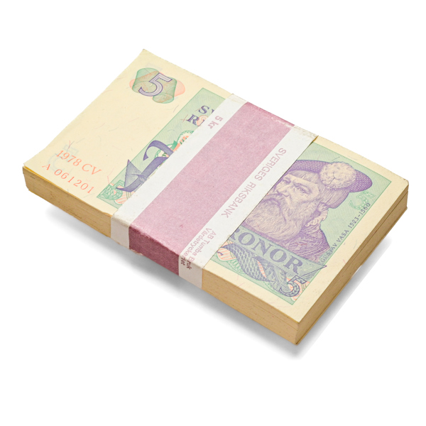5 kronor 1978 CV. 100 exemplar i nummerföljd, A 061201-061300. Ovikta (men de yttre med hanteringsspår, bl.a. smärre riss). Med Riksbankens banderoll.
