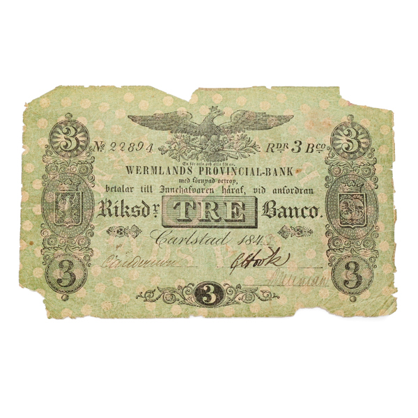 WERMLANDS PROVINCIAL-BANK. 3 riksdaler banco 1843. Nr 22894. Skador. Damages.