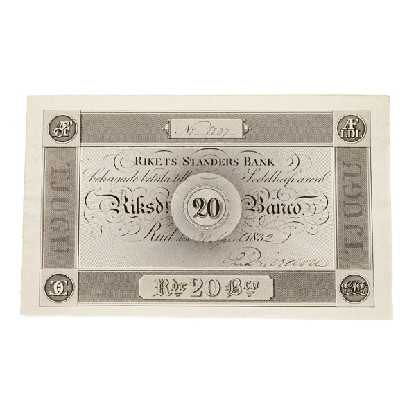 RUD. 20 riksdaler banco 1832. Nr 1437. Med noteringar i bläck på baksidan. Ovikt. Crisp.