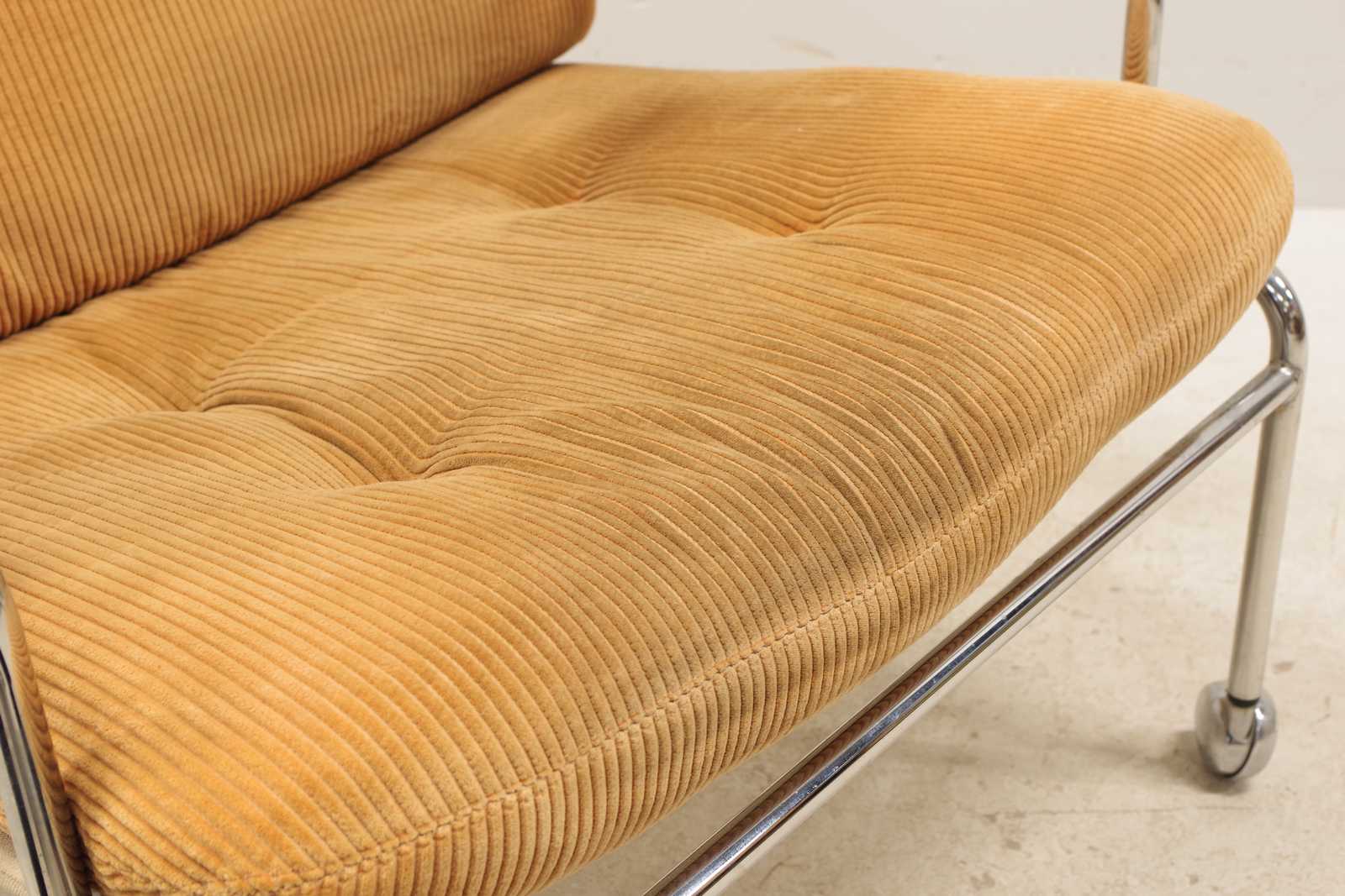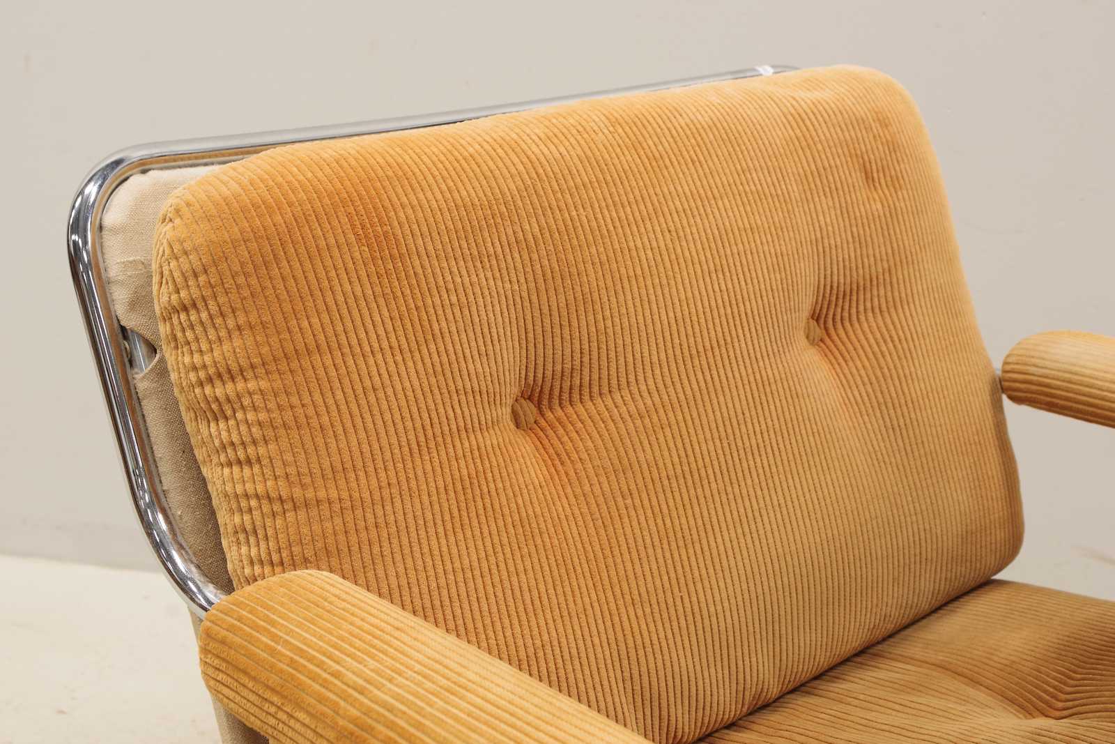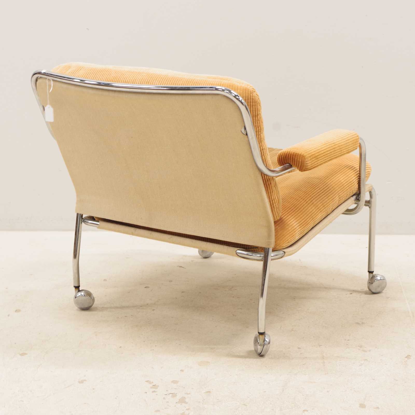 FÅTÖLJ, Pethrus Lindlöf, "Eva", Lammhult, kromad stomme, 1970-talet. (bruksslitage, missfärgning på sits, skada på klädseln ett armstöd)