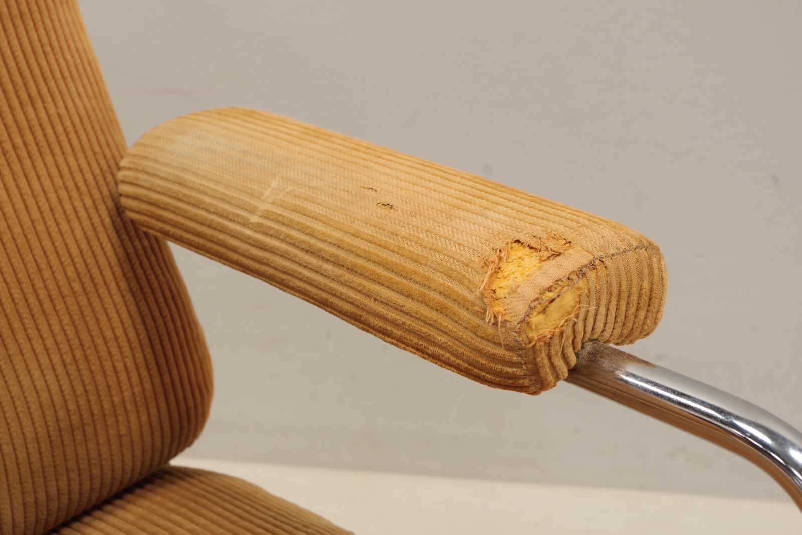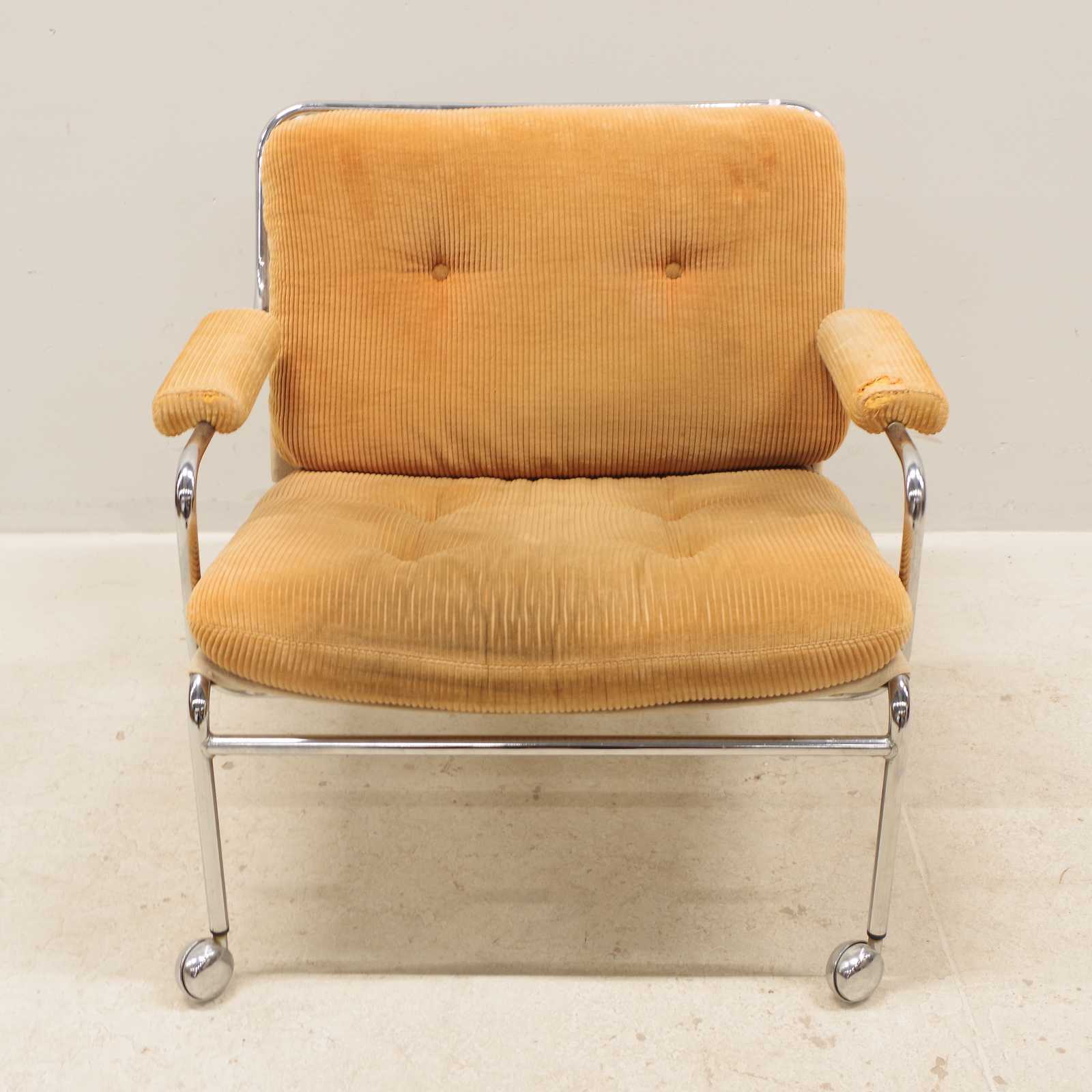 Bilder FÅTÖLJ, Pethrus Lindlöf, "Eva", Lammhult, kromad stomme, 1970-talet. (bruksslitage, missfärgning på sits, skada på klädseln ett armstöd)
