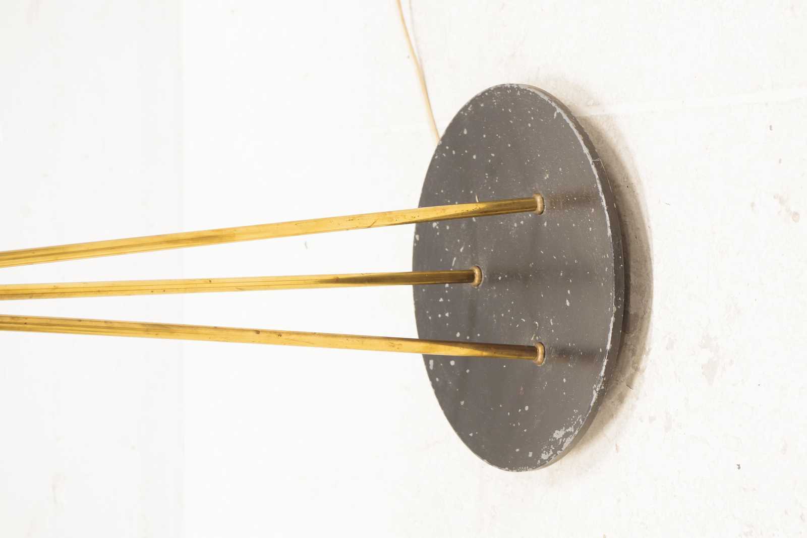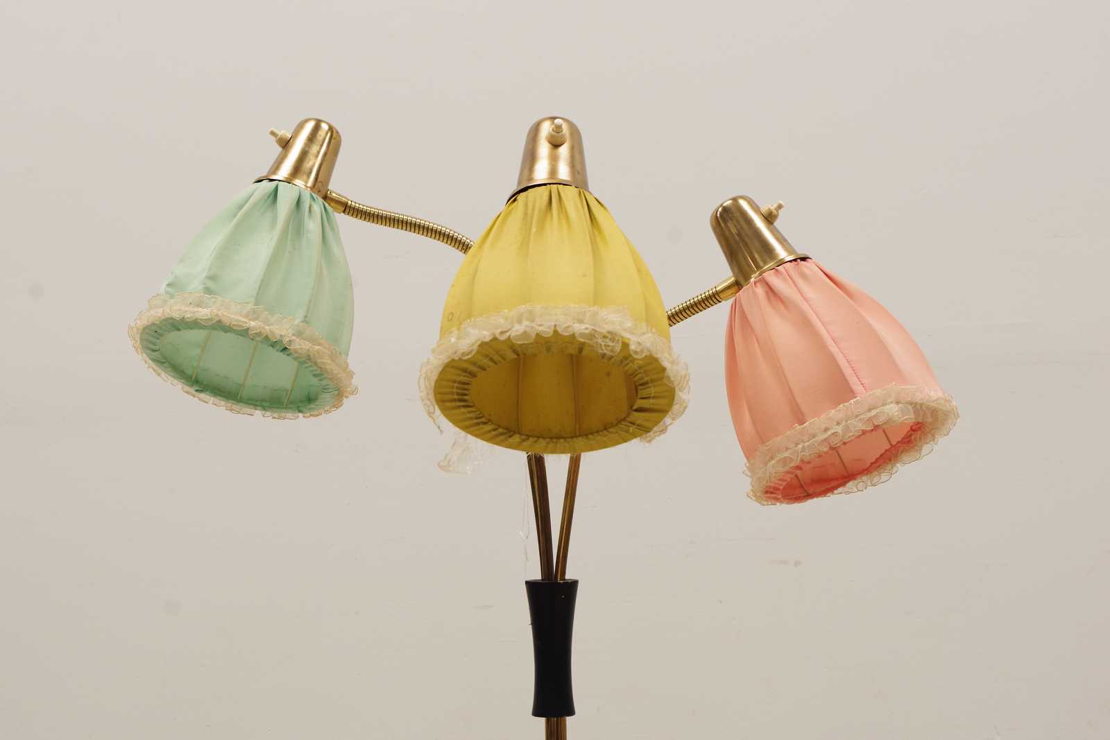 Bilder GOLVLAMPA märkt AJH 7, med 3 justerbara armar, skärmar i tyg, 1900 talets mitt. H:140cm (bruksslitage, fläckar på skärmar, skavmärken)