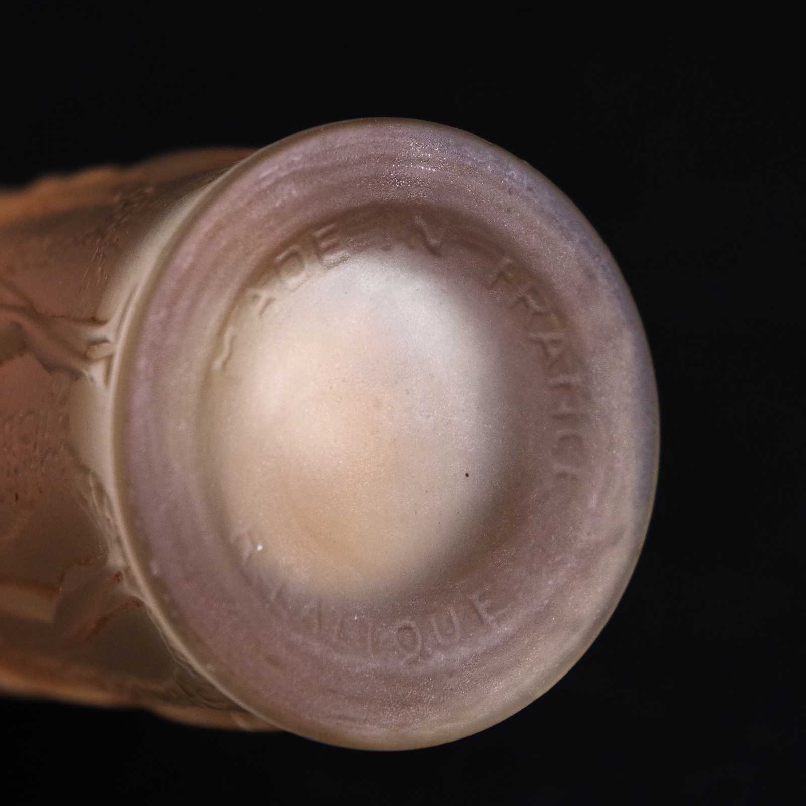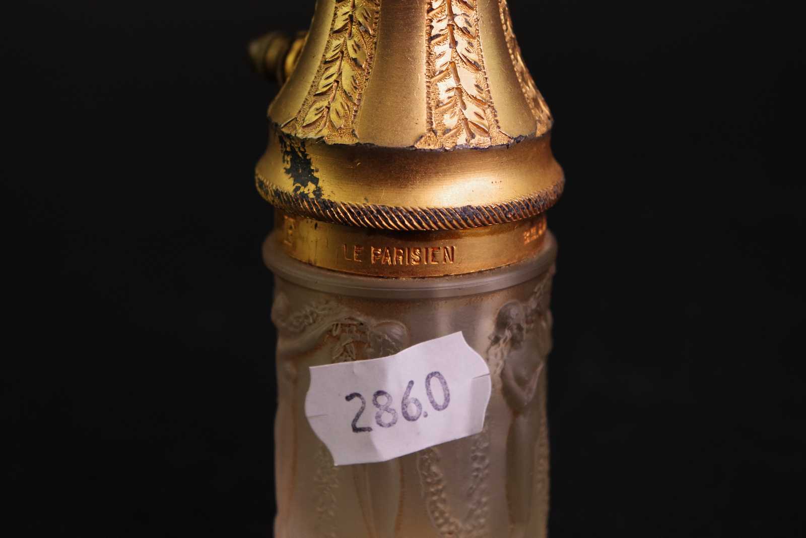 Bilder PARFYMFLASKA René Lalique "Le Parisien". Gjutet glas och delvis förgylld och graverad. Gjuten signatur "R. LALIQUE". 1920-tal. H:10 cm.
