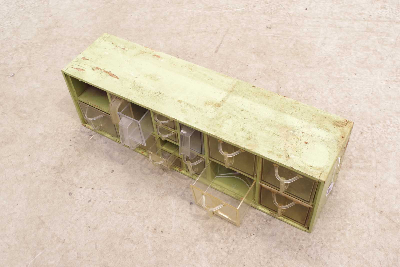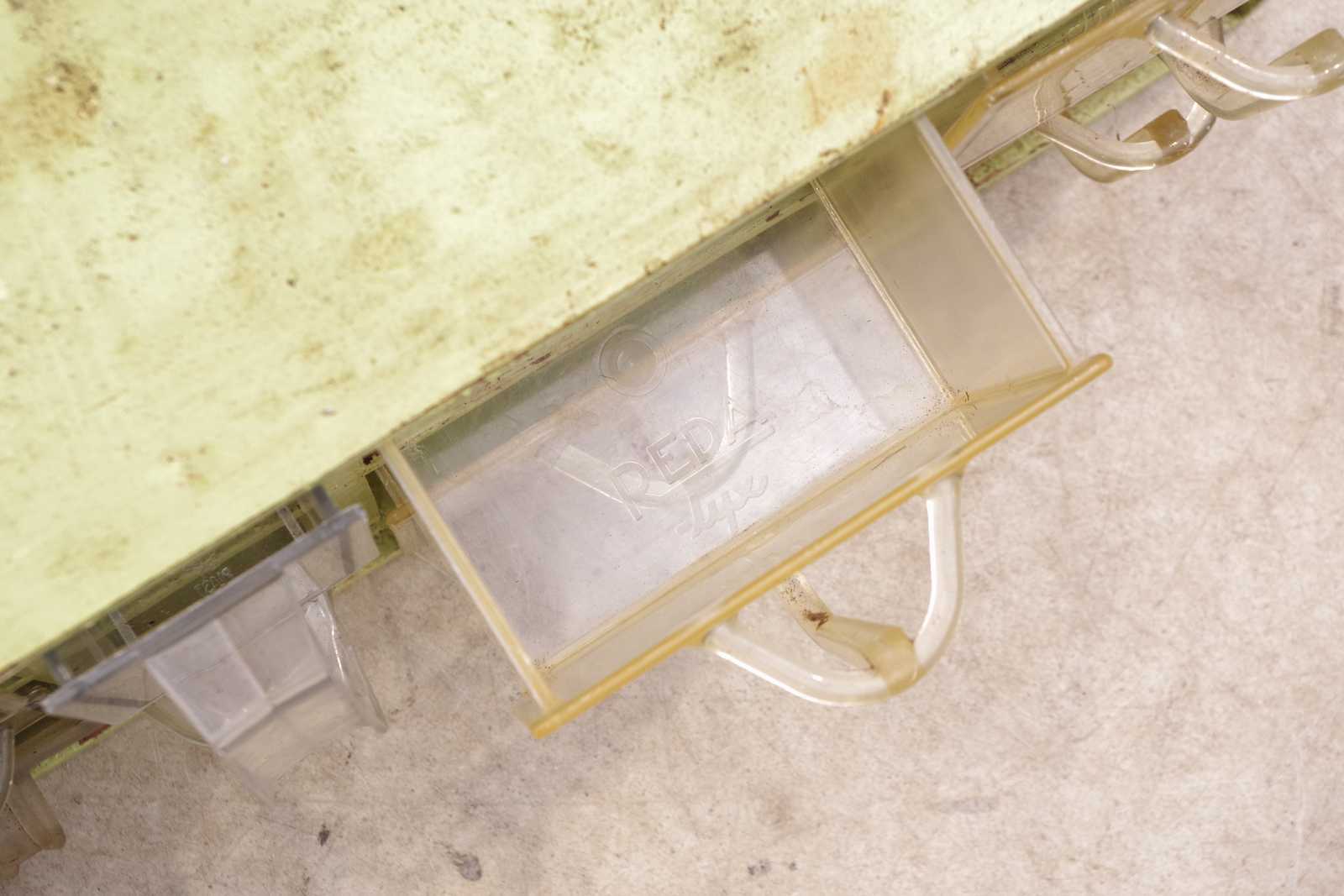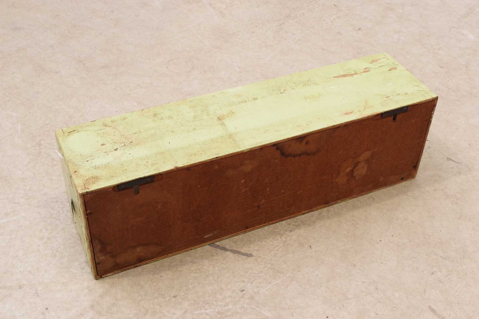 KRYDDHYLLA trä/plast, 1900-talets mitt. H:24x 76x 20cm. 1st låda saknas, färgbortfall.